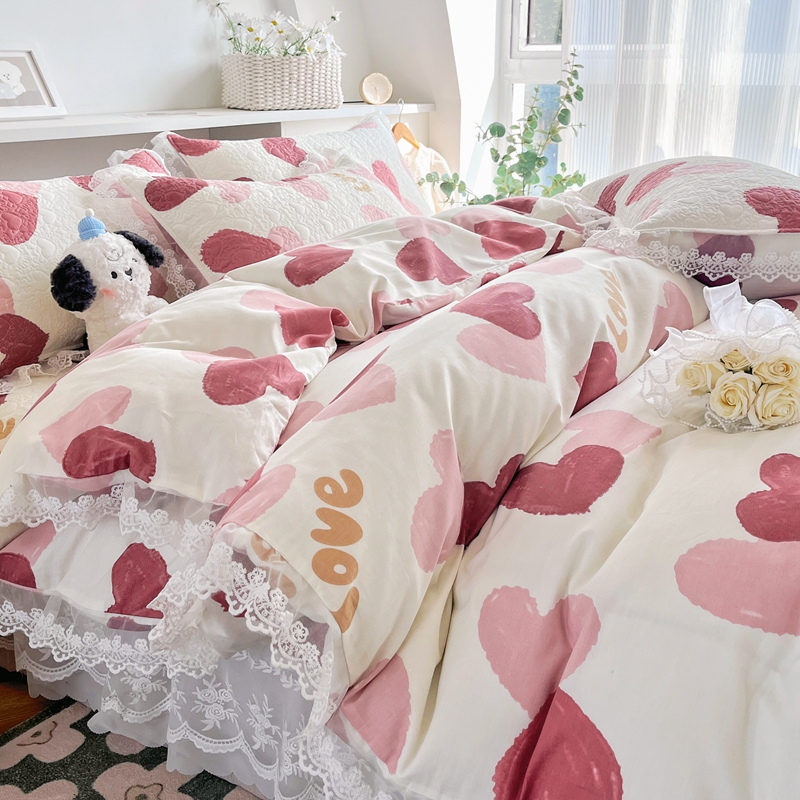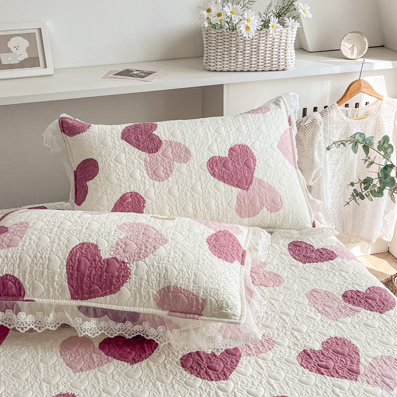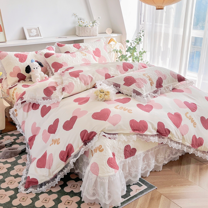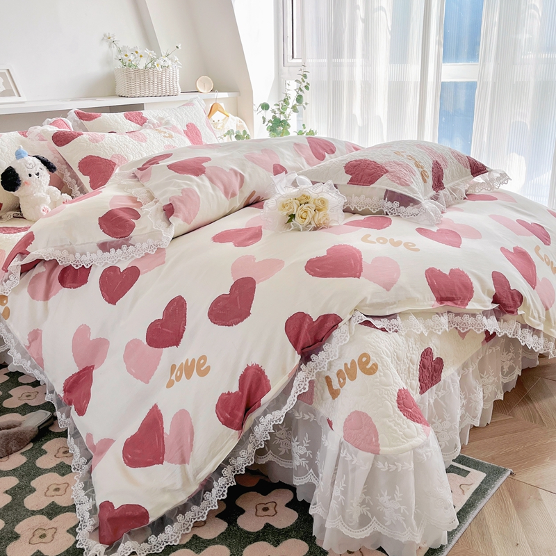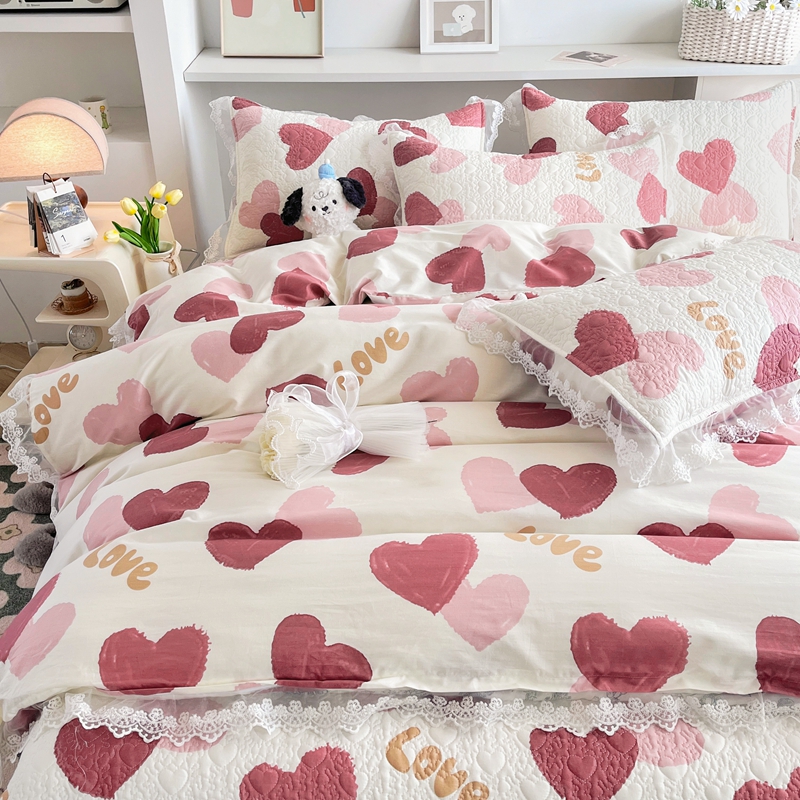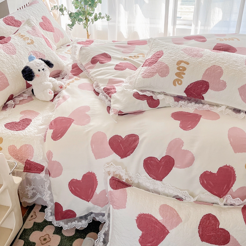 添越 2024小清新韩版蕾丝款花边纯棉夹棉床盖三件套全棉爱心熊-蕾丝款,爱心熊-蕾丝款
