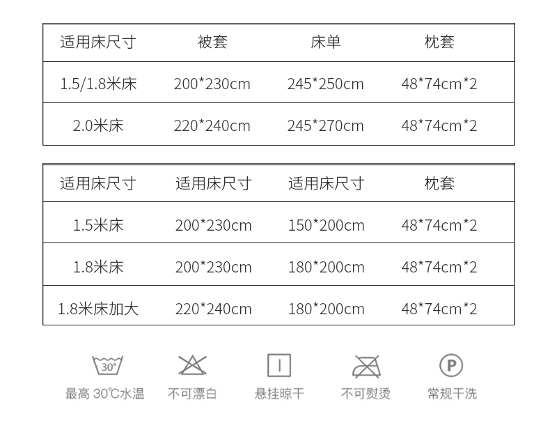 被套200*230cm 床笠150*200 枕套48*74*2 | ¥220.00 |