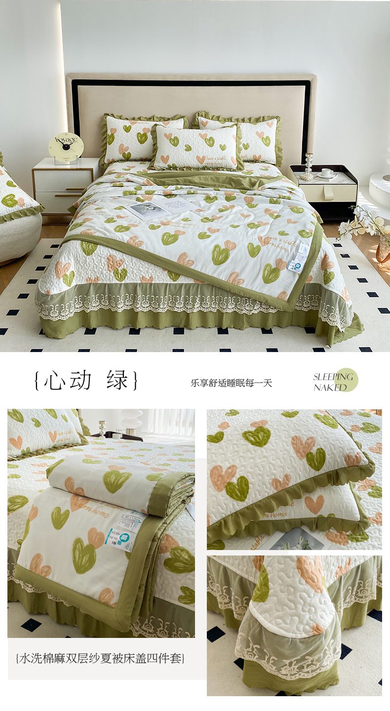 商品名称:艺慕家纺 2025新款水洗棉麻双层纱夏被床盖四件套 心动 绿