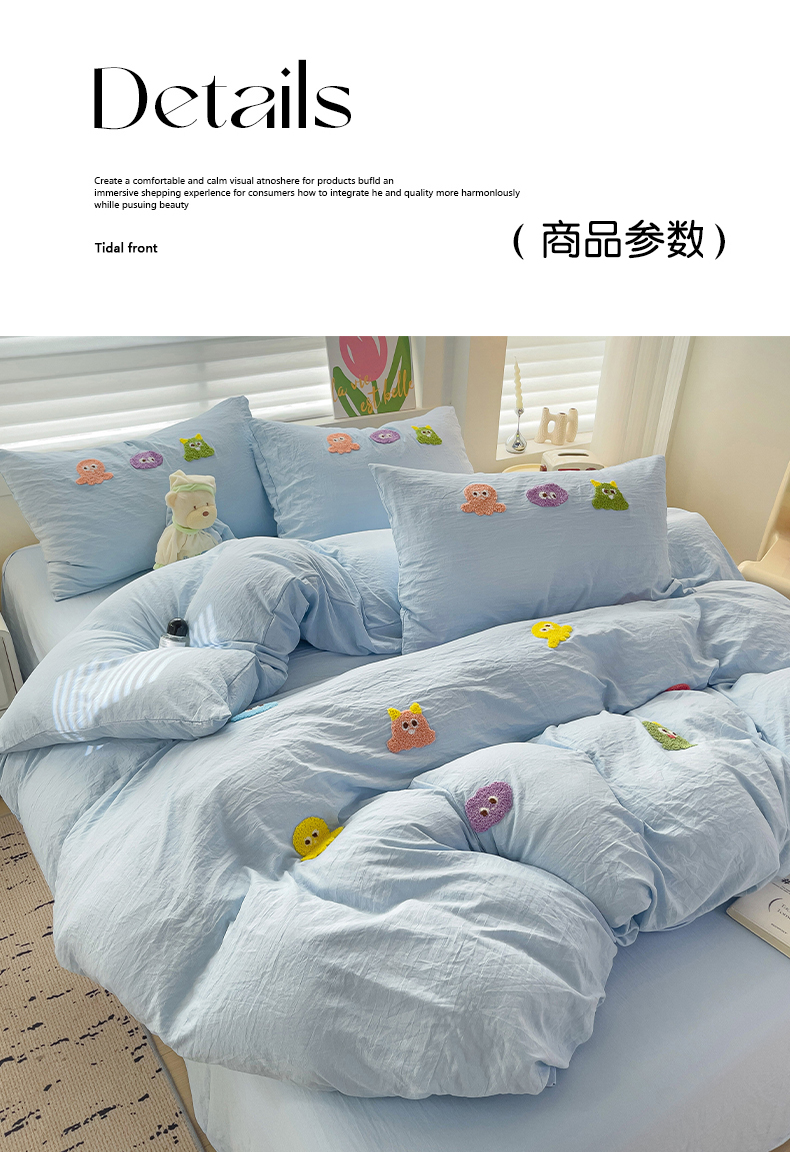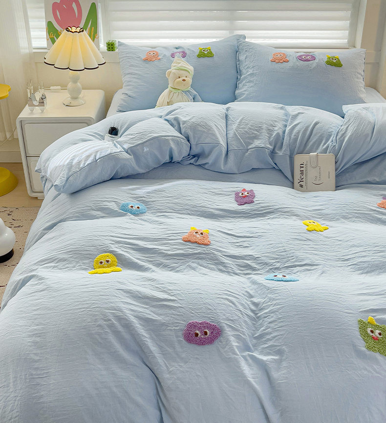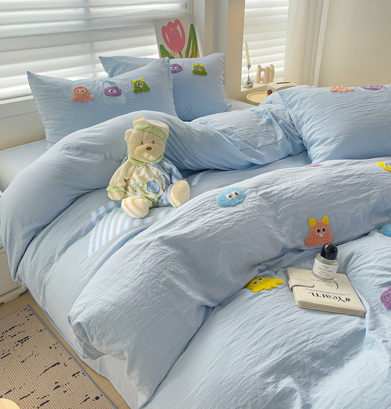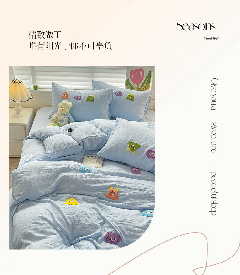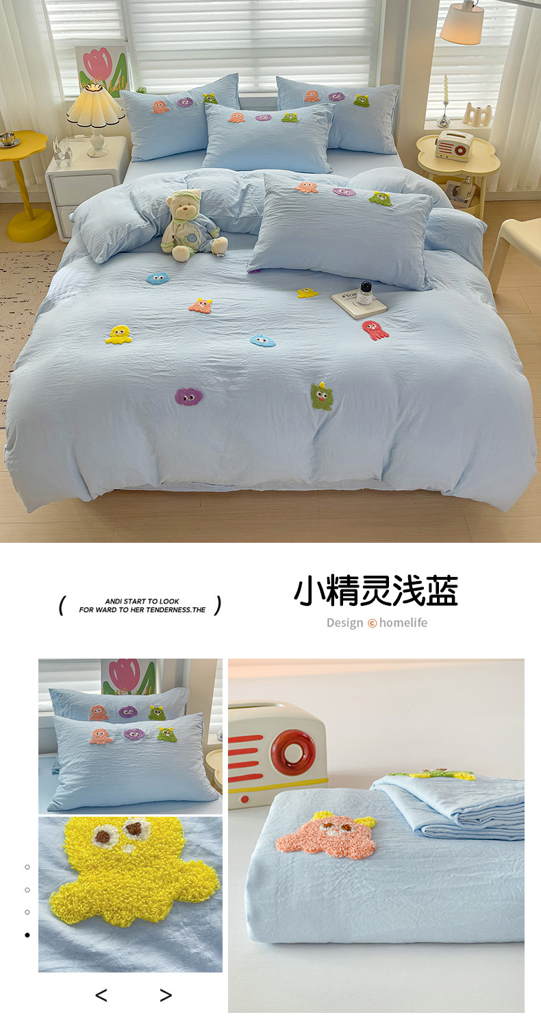 当前位置: 91家纺网 > 商品网购 > 床品套件 > 四件套 > 水洗棉四件套 > 韩巢家纺 2024热款超柔水洗棉毛巾绣床上用品四件套学生宿舍三件套-小精灵系列(提供精美卖家秀 ) 小精灵浅蓝