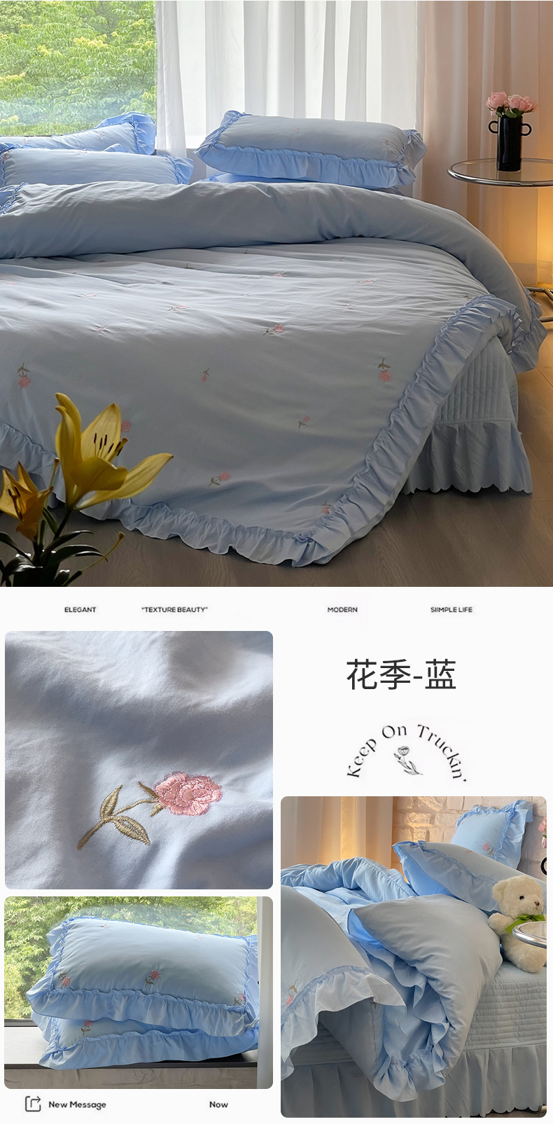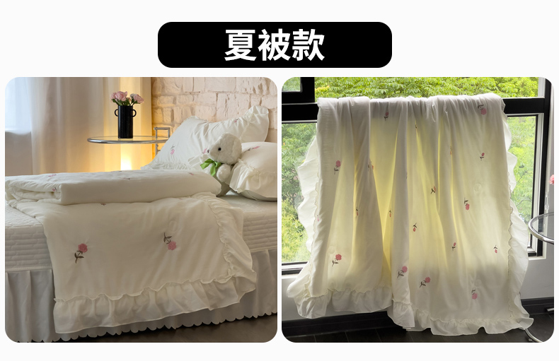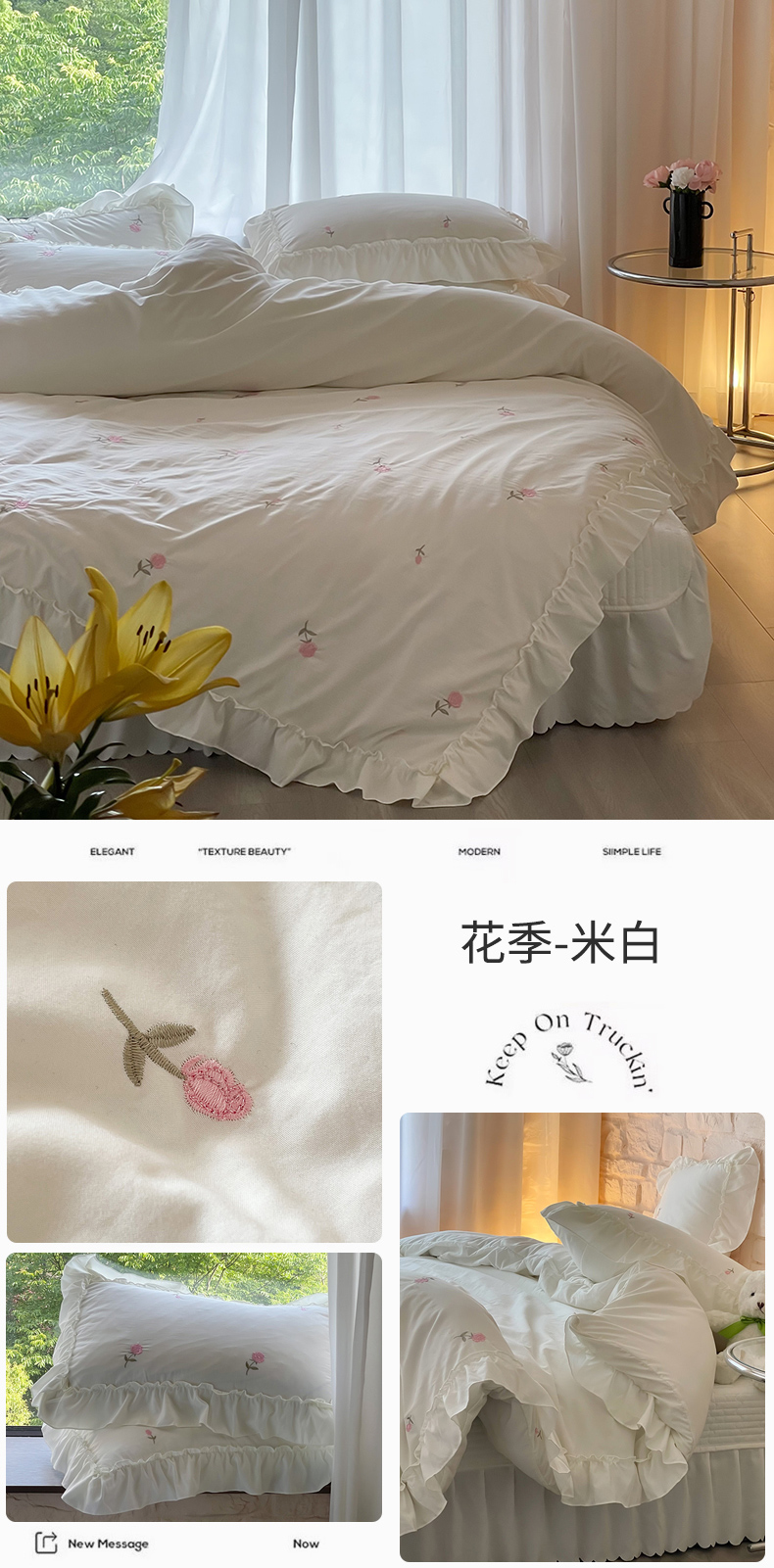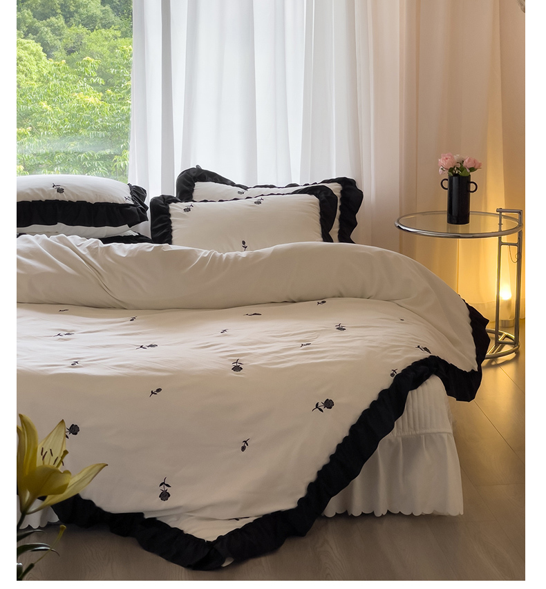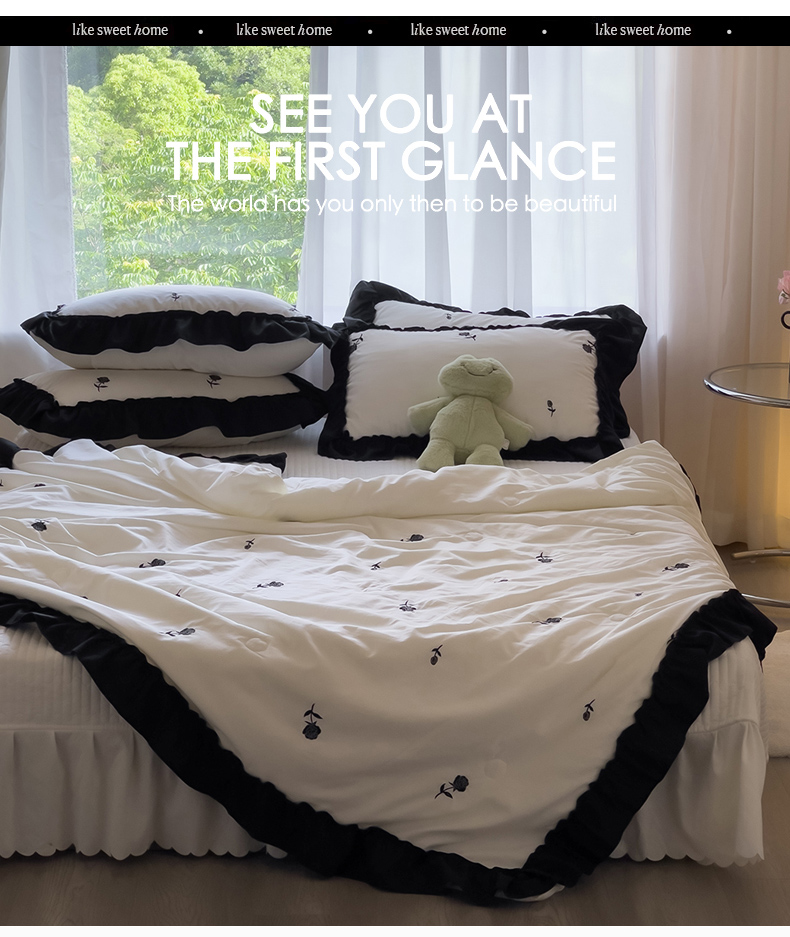 小主驾到 2024新款水洗棉刺绣法式花边被套床单四件套夏被床盖四件套-花季 花季 黑白
