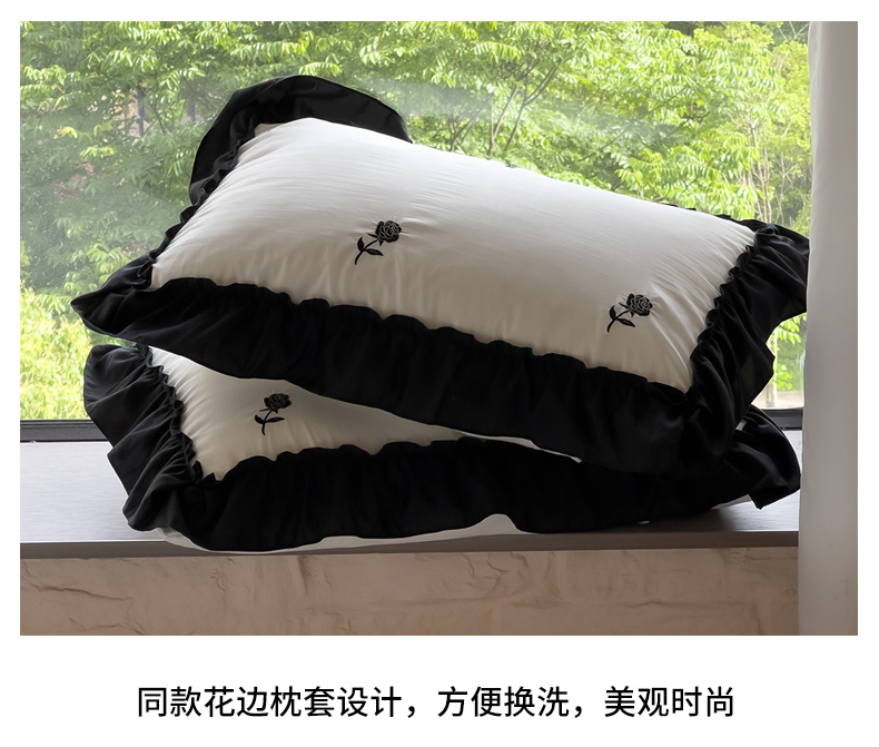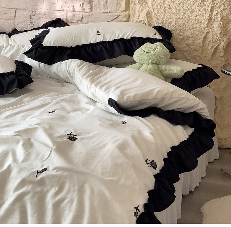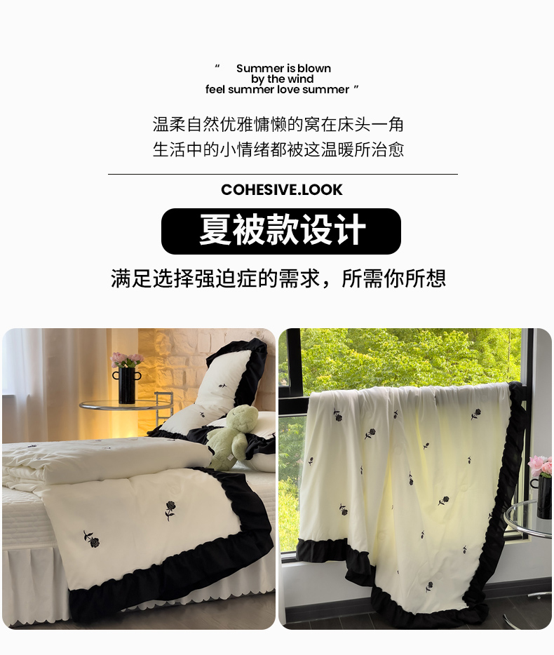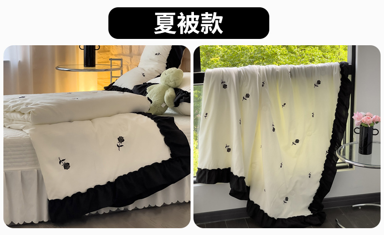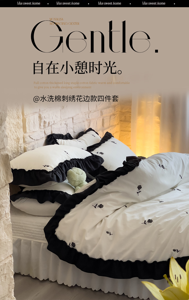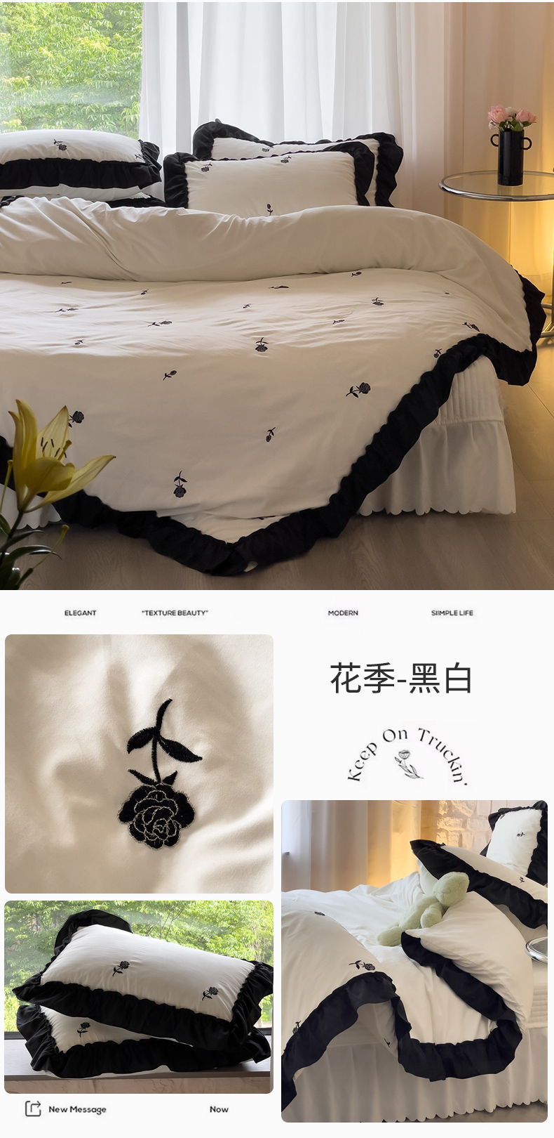 商品名称:小主驾到 2024新款水洗棉刺绣法式花边被套床单四件套夏被床盖四件套-花季 花季 黑白