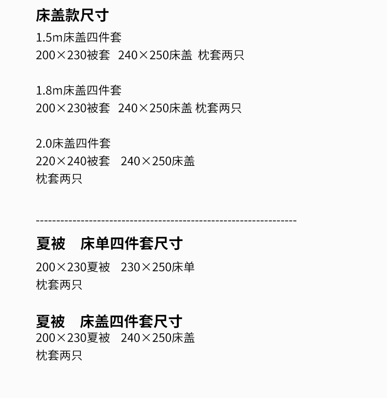 [{"sp_id":11,"sp_name":"\u989c\u8272\u5206\u7c7b","sp_format":2,"sp_list":[{"sp_value_id":59,"sp_value_name":"\u82b1\u5b63 \u9ed1\u767d","sp_value_image":{"id":999,"path":"https:\/\/img3.91jf.com\/ghelp\/2024\/20240606\/d033173d-afe0-4f15-983e-b9ec2663a1a920240606102119257.jpg_30_30.jpg"},"sp_value_video":{"id":0,"img":"","path":"","time":0,"download_num":0,"play_num":0},"price":"80.00","storage":599,"weight":"2.400","is_check_weight":0,"plus_price":"","sp_sort":11}]},{"sp_id":10,"sp_name":"\u9002\u7528\u5e8a\u5c3a\u5bf8","sp_format":1,"sp_list":[{"sp_value_id":766,"sp_value_name":"1.5m\u5e8a\u5355\u6b3e\u56db\u4ef6\u5957","sp_value_image":{"id":0,"path":""},"sp_value_video":{"id":0,"img":"","path":"","time":0,"download_num":0,"play_num":0},"price":"80.00","storage":100,"weight":"2.400","is_check_weight":0,"plus_price":"","sp_sort":14},{"sp_value_id":771,"sp_value_name":"1.8m\u5e8a\u5355\u6b3e\u56db\u4ef6\u5957","sp_value_image":{"id":0,"path":""},"sp_value_video":{"id":0,"img":"","path":"","time":0,"download_num":0,"play_num":0},"price":"80.00","storage":99,"weight":"1.980","is_check_weight":1,"plus_price":"","sp_sort":15},{"sp_value_id":772,"sp_value_name":"2.0m\u5e8a\u5355\u6b3e\u56db\u4ef6\u5957","sp_value_image":{"id":0,"path":""},"sp_value_video":{"id":0,"img":"","path":"","time":0,"download_num":0,"play_num":0},"price":"85.00","storage":100,"weight":"2.600","is_check_weight":0,"plus_price":"","sp_sort":16},{"sp_value_id":775,"sp_value_name":"200\u00d7230\u88ab\u5957+\u5e8a\u76d6\u56db\u4ef6\u5957 ","sp_value_image":{"id":0,"path":""},"sp_value_video":{"id":0,"img":"","path":"","time":0,"download_num":0,"play_num":0},"price":"110.00","storage":100,"weight":"2.600","is_check_weight":0,"plus_price":"","sp_sort":18},{"sp_value_id":776,"sp_value_name":"200\u00d7230\u590f\u88ab+\u5e8a\u76d6\u56db\u4ef6\u5957 ","sp_value_image":{"id":0,"path":""},"sp_value_video":{"id":0,"img":"","path":"","time":0,"download_num":0,"play_num":0},"price":"125.00","storage":100,"weight":"2.600","is_check_weight":0,"plus_price":"","sp_sort":19},{"sp_value_id":777,"sp_value_name":"200*230cm\u5355\u590f\u88ab","sp_value_image":{"id":0,"path":""},"sp_value_video":{"id":0,"img":"","path":"","time":0,"download_num":0,"play_num":0},"price":"75.00","storage":100,"weight":"1.200","is_check_weight":0,"plus_price":"","sp_sort":20}]}]