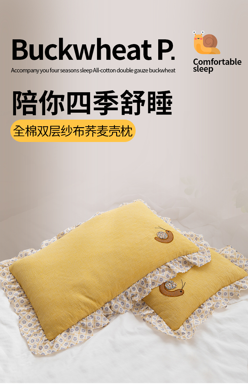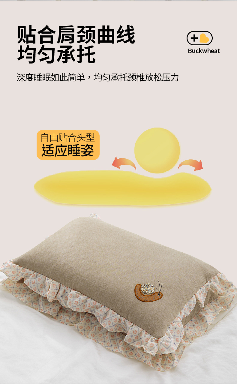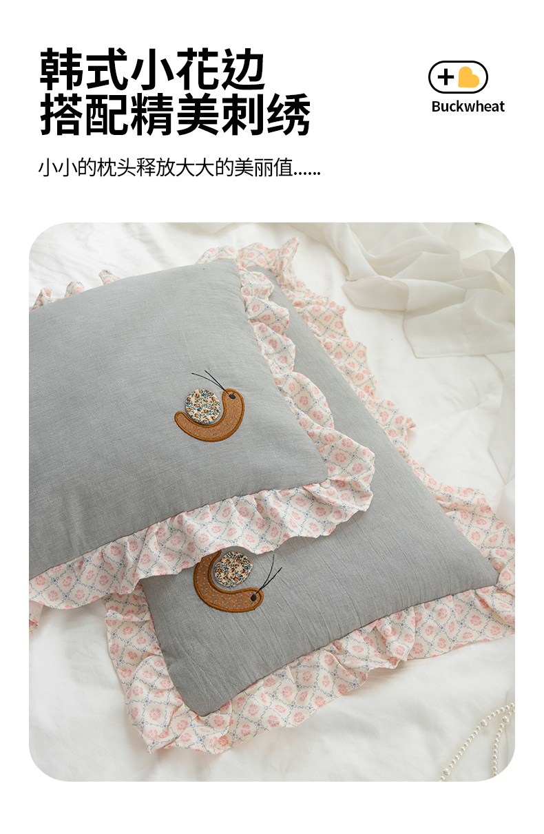 (总)仁宇枕业 2024年新款枕芯 全棉双层纱贴布绣毛毛虫花边系列儿童学生婴幼儿园青少年成人小清新全荞麦枕头
