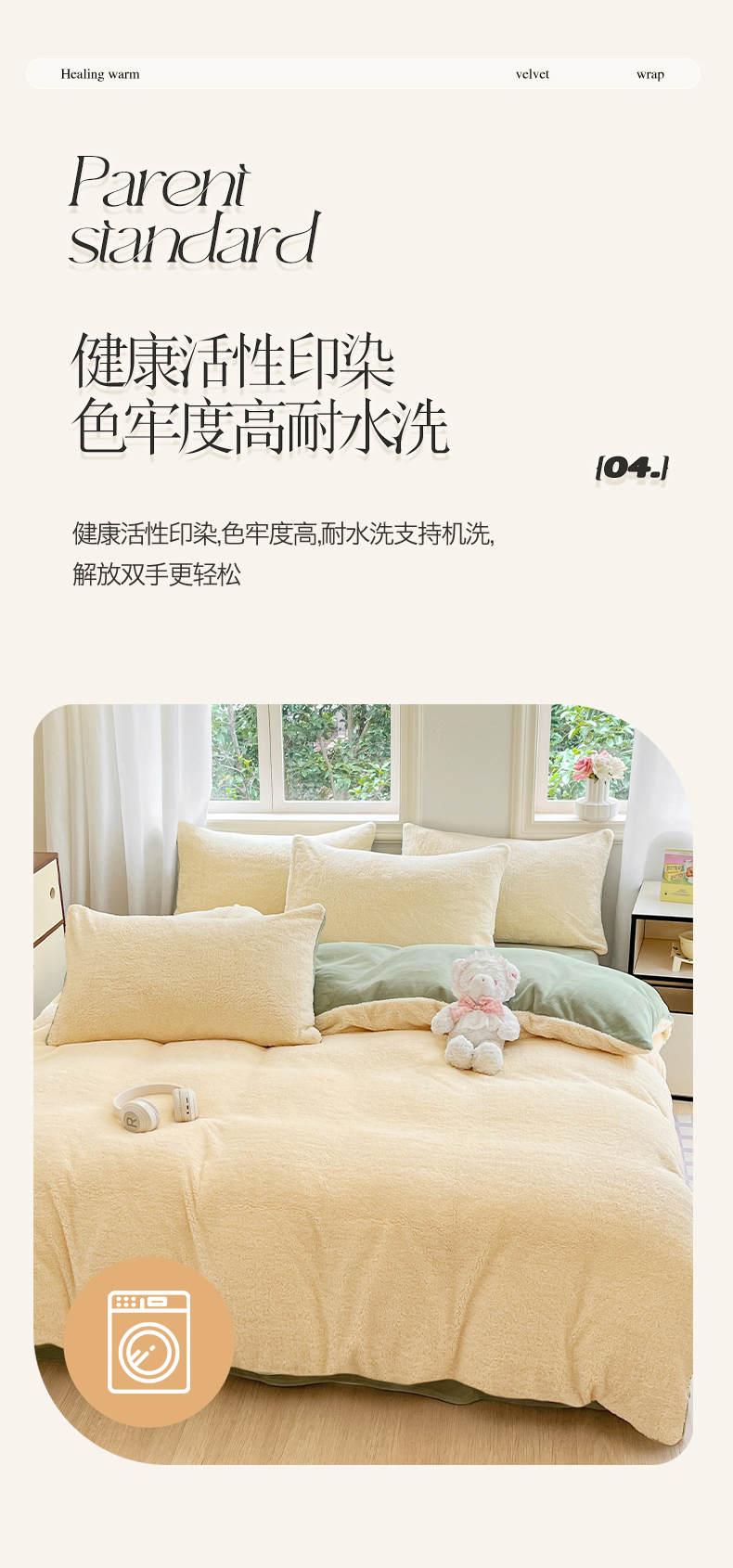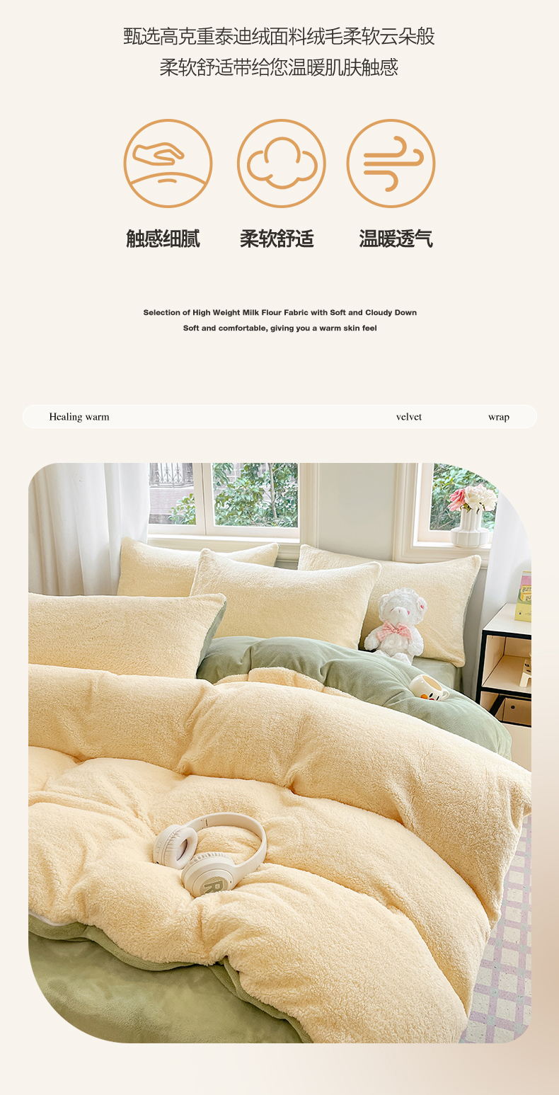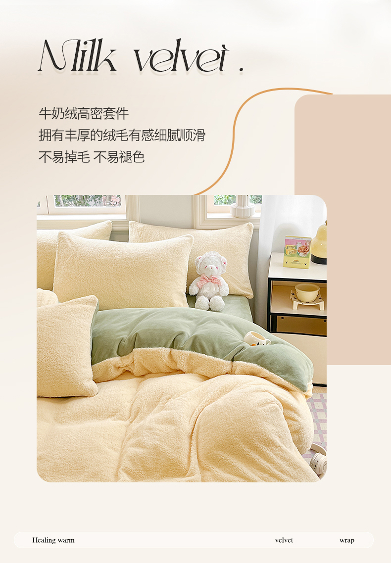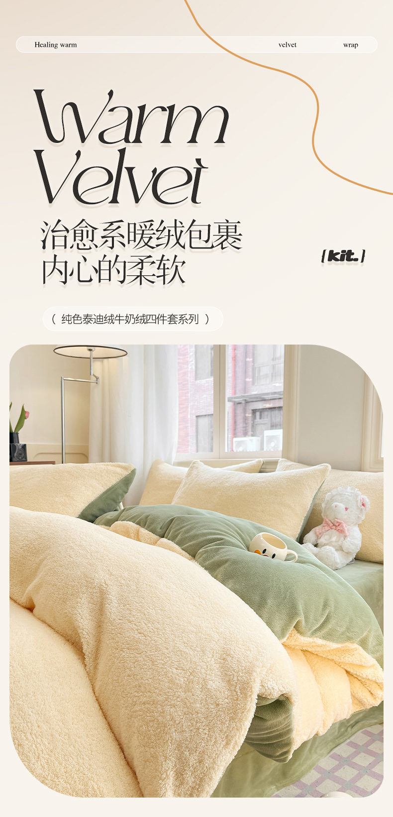 商品名称:绘萱家居 2024新款高克重泰迪绒纯色牛奶绒四件套双拼法莱绒珊瑚绒 泰迪绒-奶黄+灰绿