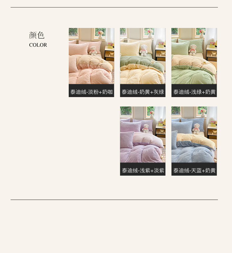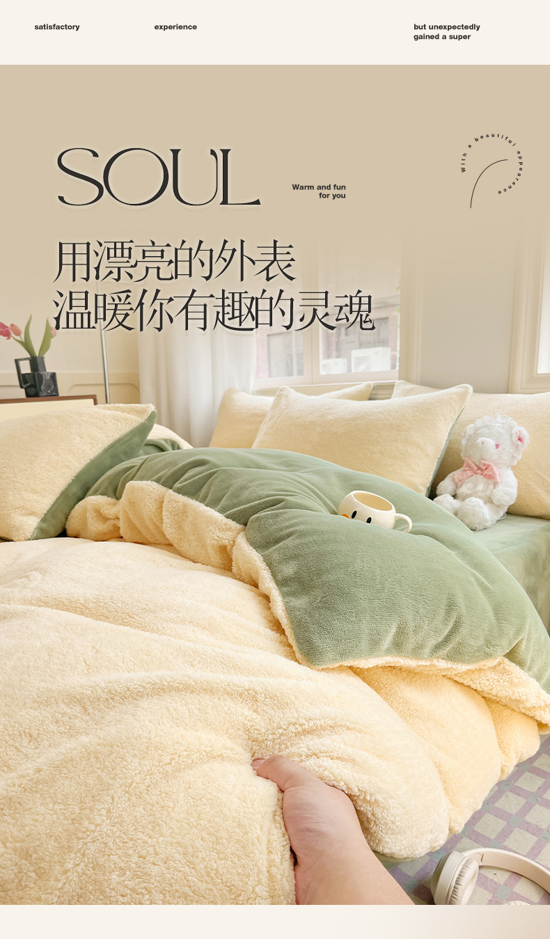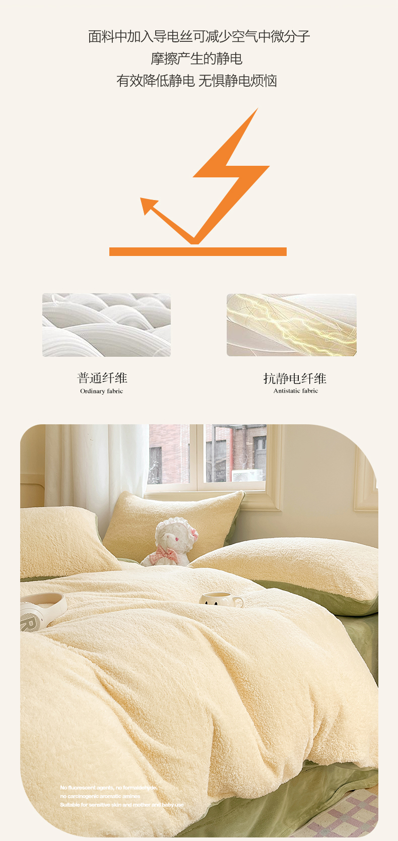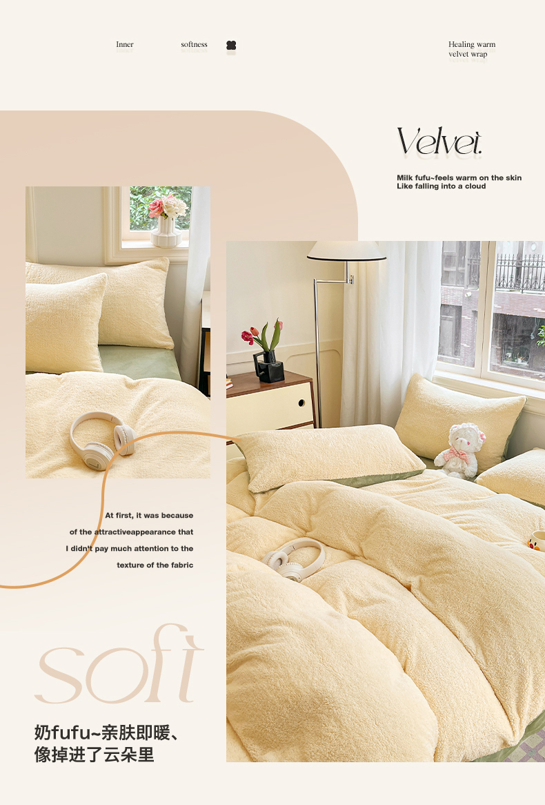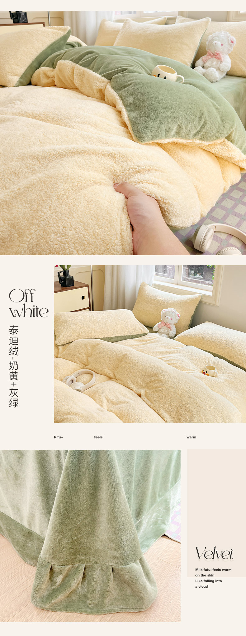 商品名称:绘萱家居 2024新款高克重泰迪绒纯色牛奶绒四件套双拼法莱绒珊瑚绒 泰迪绒-奶黄+灰绿