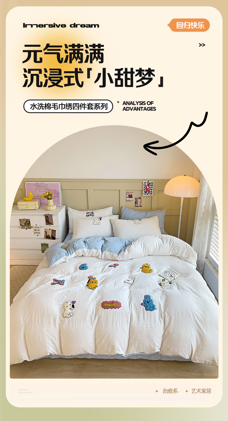 当前位置: 91家纺网 > 商品网购 > 床品套件 > 四件套 > 水洗棉四件套 > 韩巢家纺 2024新款四季通用超柔水洗棉毛巾绣四件套-动物乐园系列(提供卖家秀) 动物乐园白蓝