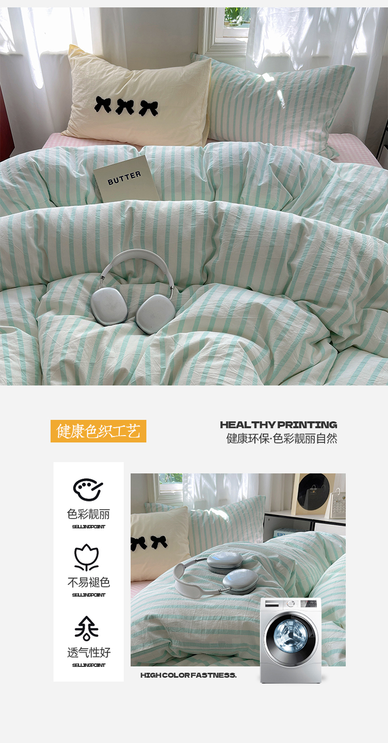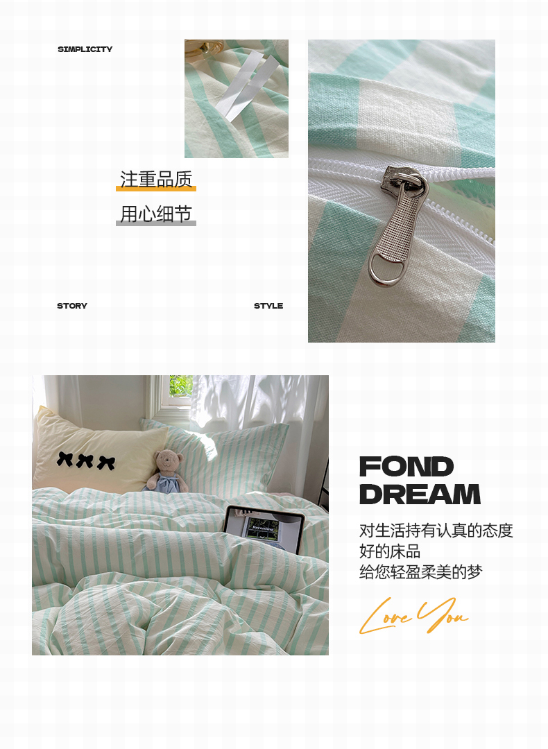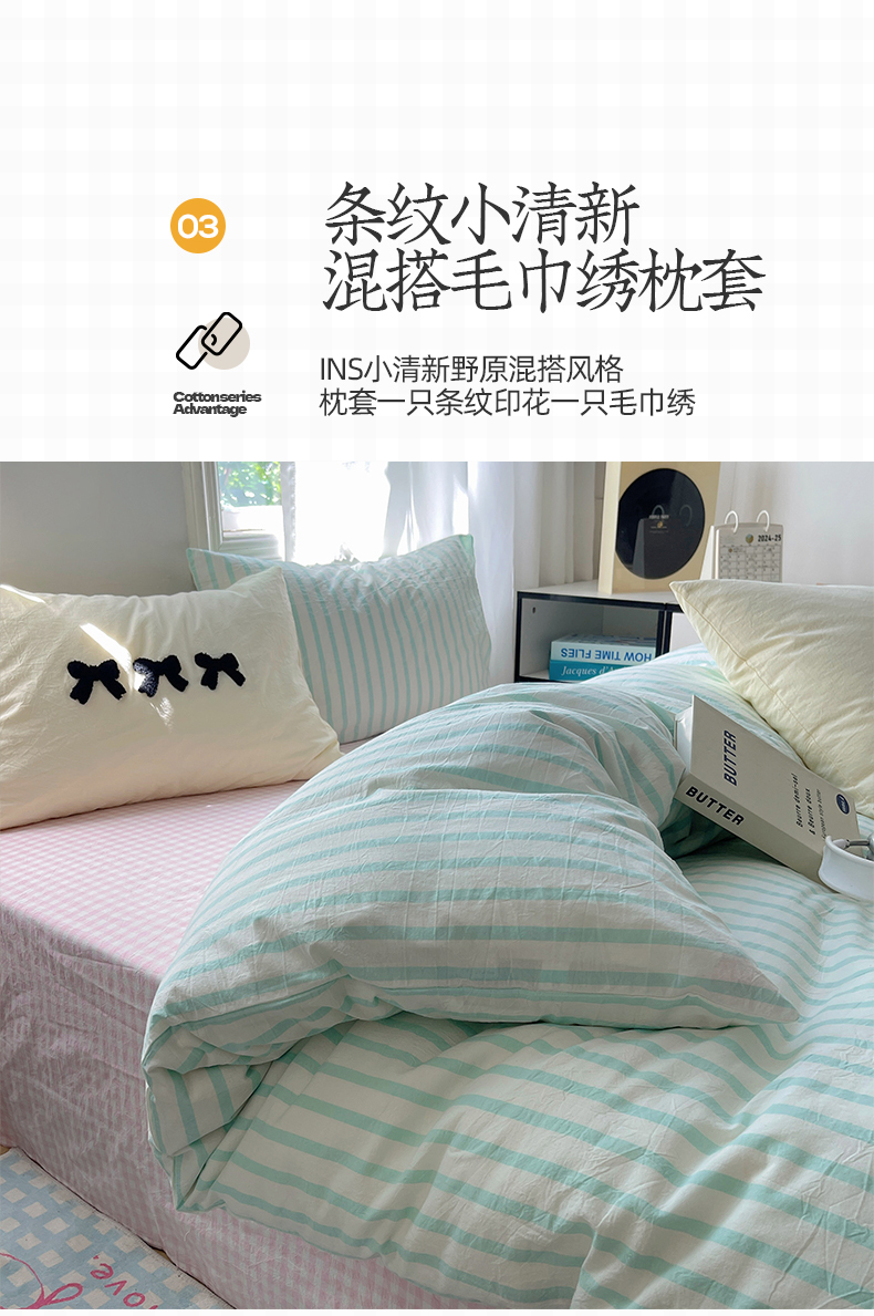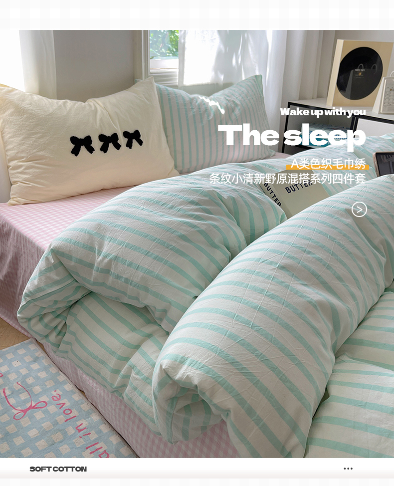 当前位置: 91家纺网 > 商品网购 > 床品套件 > 四件套 > 其它四件套 > 桃子家居 2024新款A类色织毛巾绣条纹小清新野原混搭纯棉系列四件套 色织水洗棉-野原绿蝴蝶结