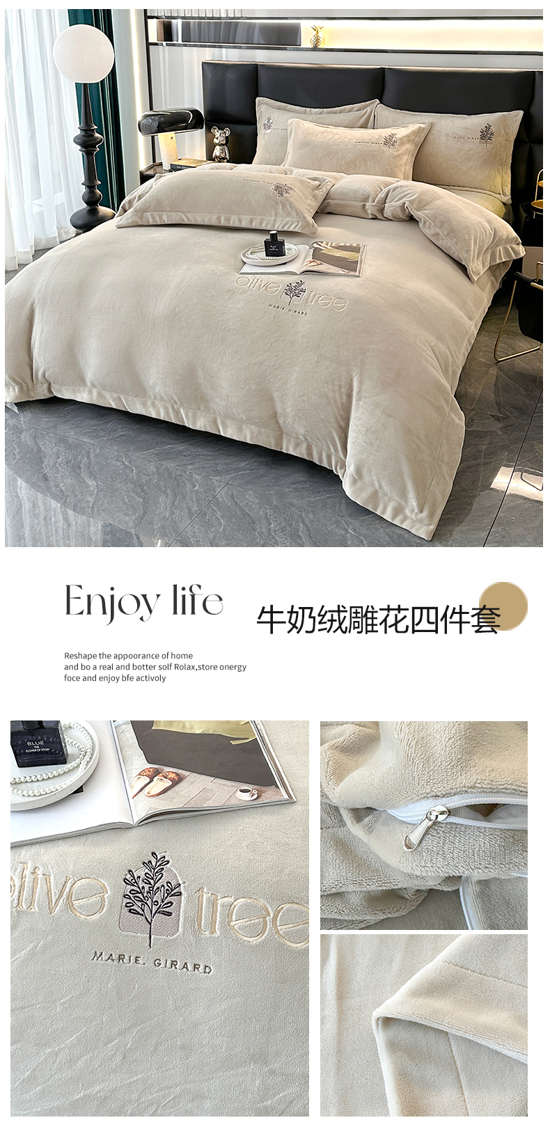 商品名称:橘姿家纺 2024新款高克重九斤牛奶绒绣花四件套 相伴-驼色