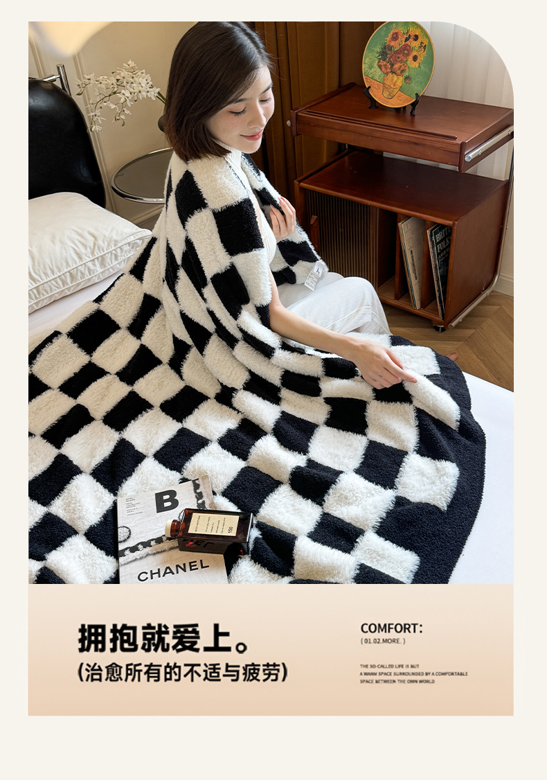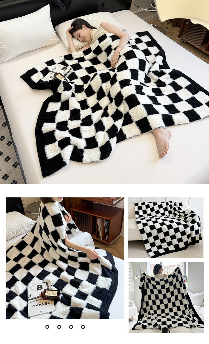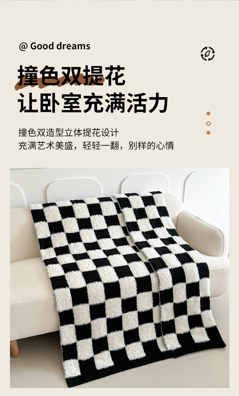 丹本家纺 2025新款A类云暖绒仿貂复合毯跨境无印风针织毯半边绒毛毯盖毯 黑格子