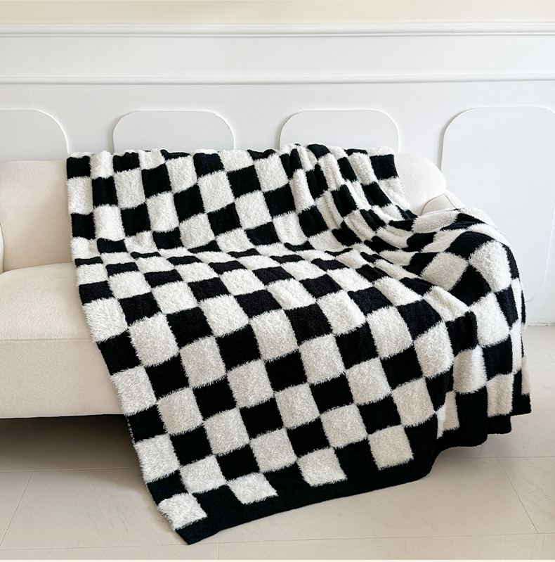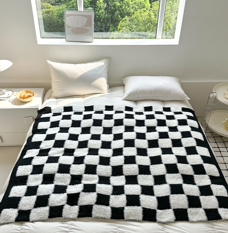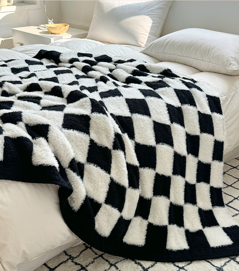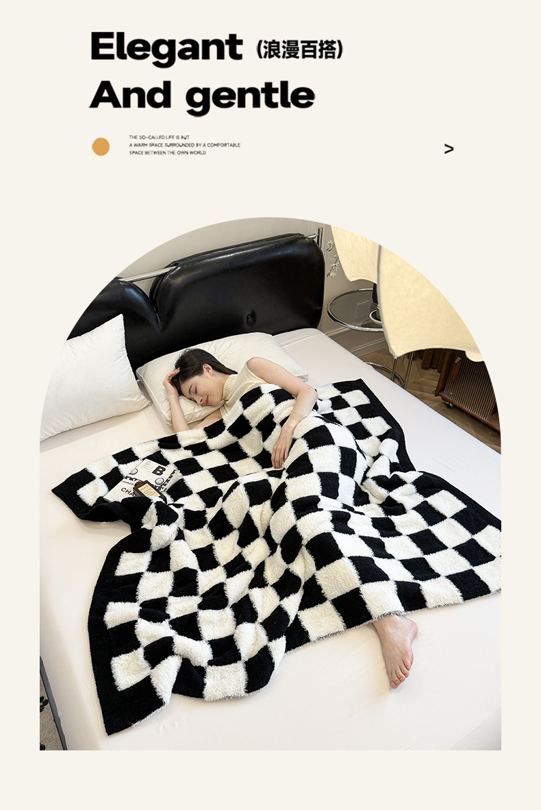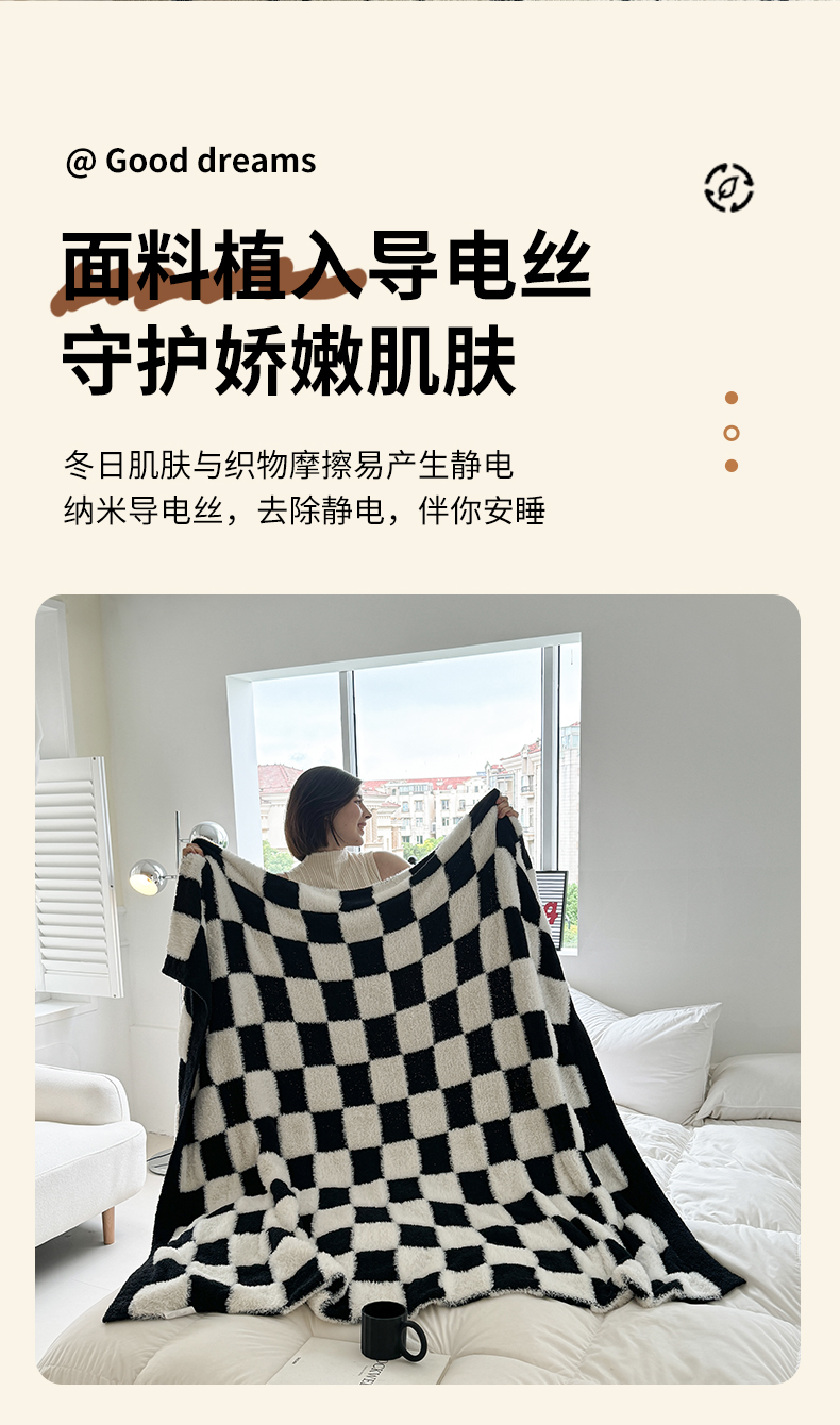 丹本家纺 2025新款A类云暖绒仿貂复合毯跨境无印风针织毯半边绒毛毯盖毯 黑格子