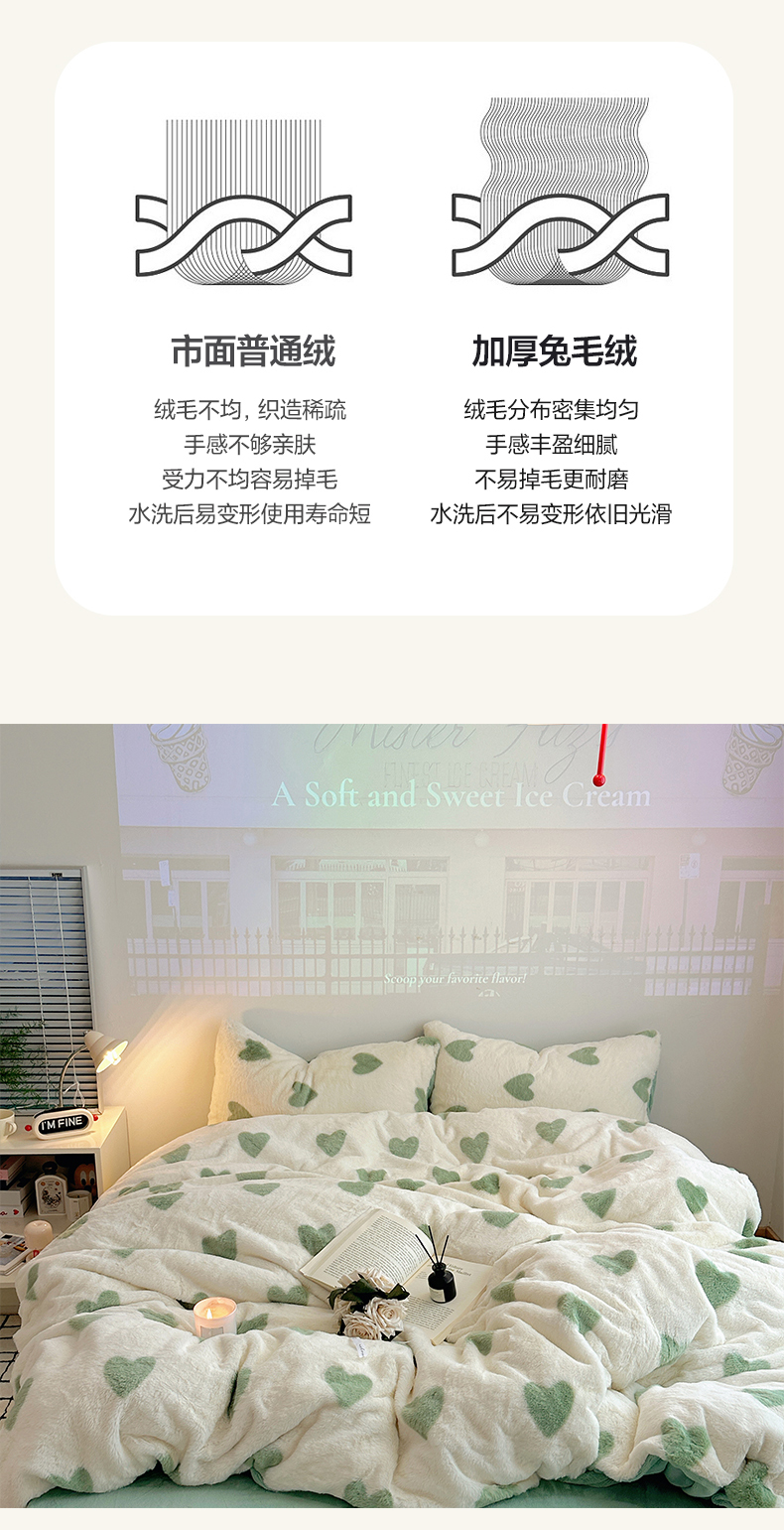 商品名称:雅居纺家纺 2024新款高克重兔毛印花牛奶绒四件套-爱心 爱心-绿