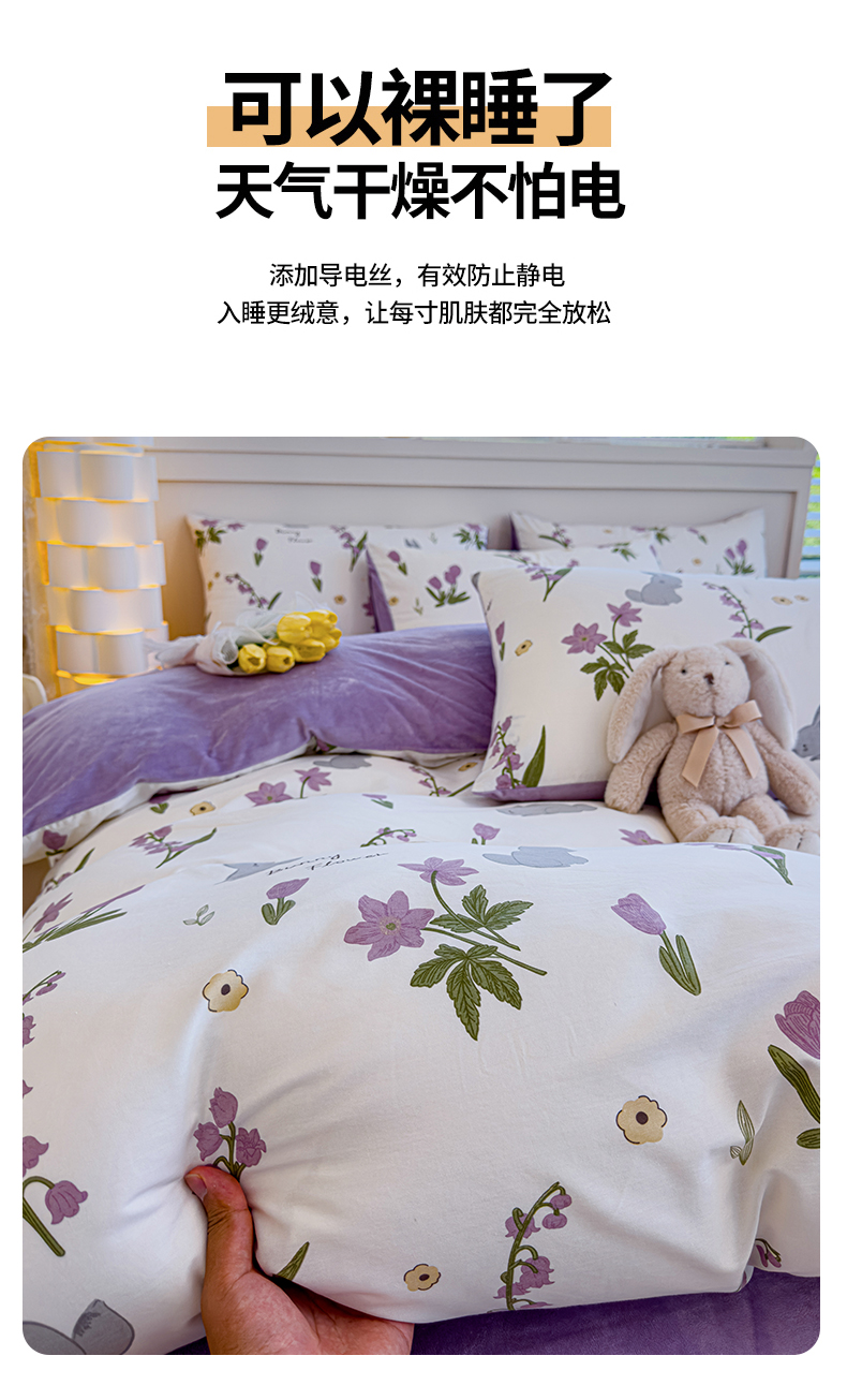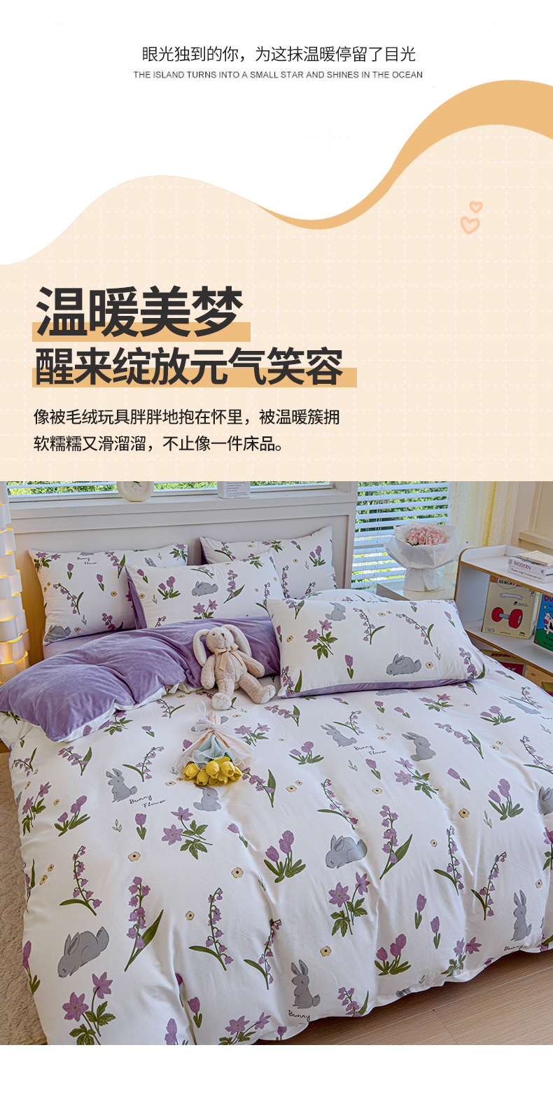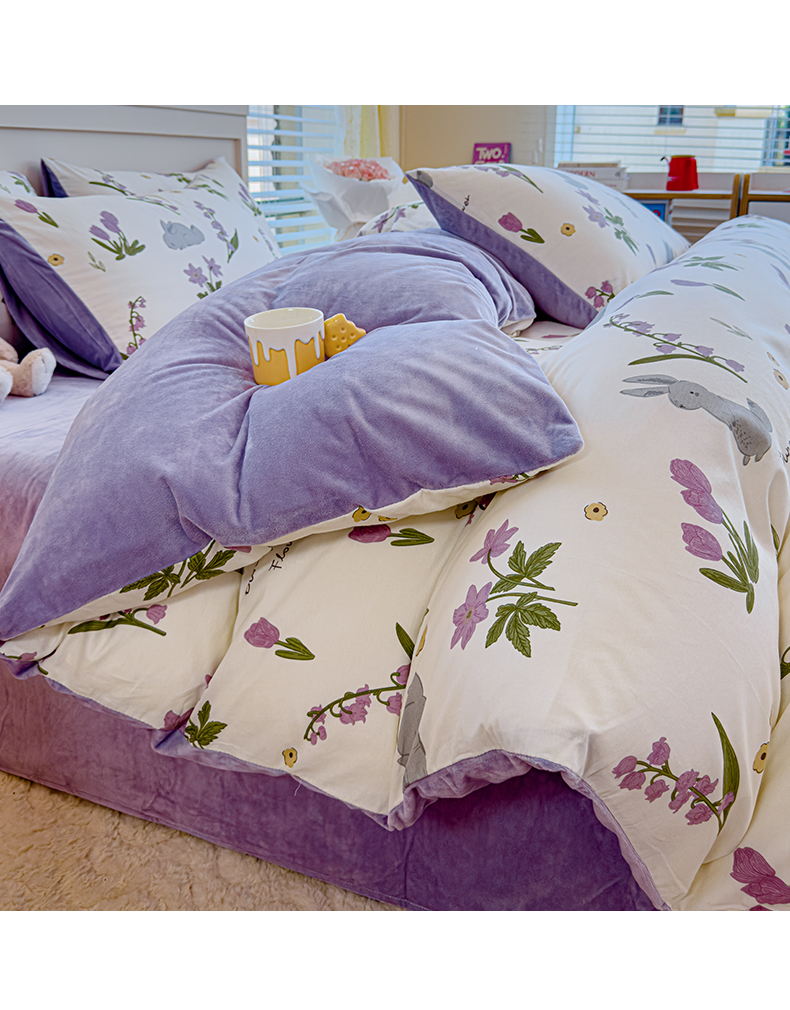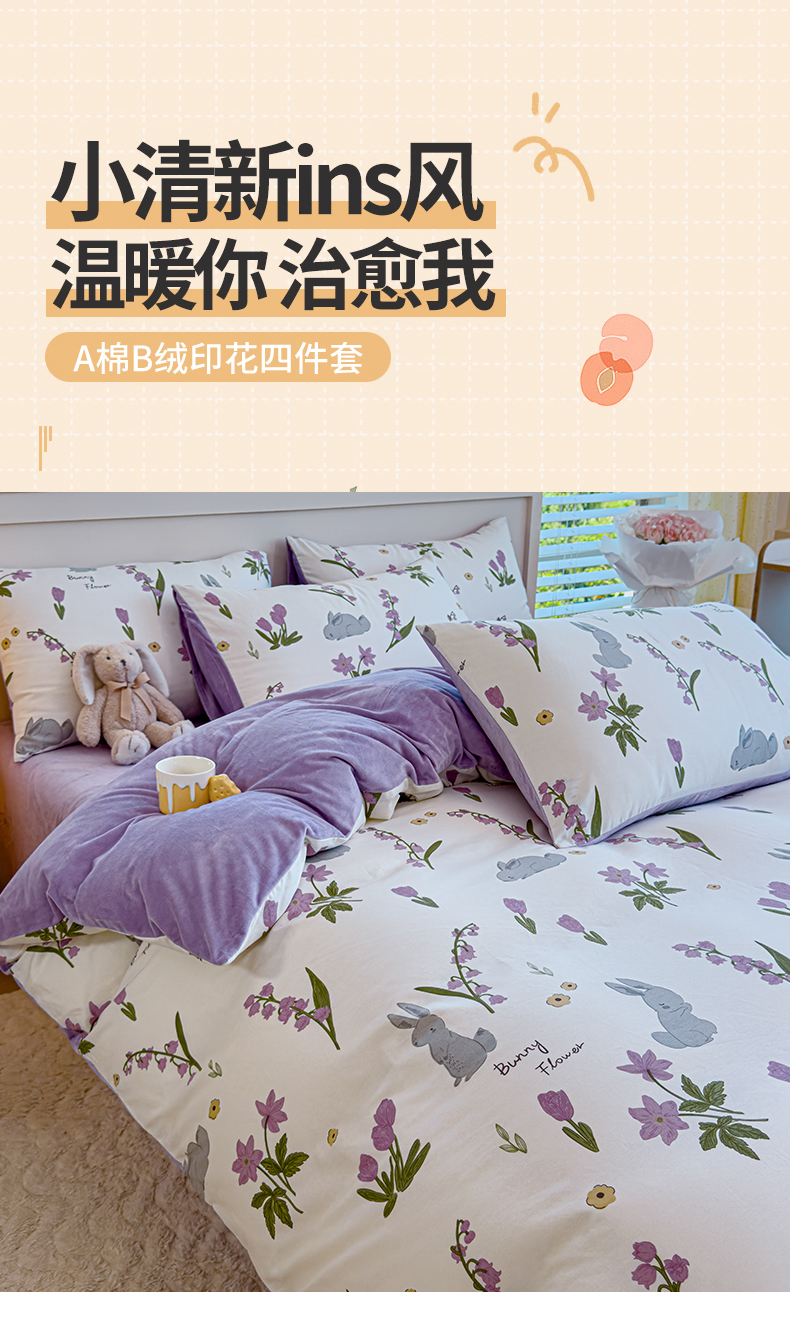 当前位置: 91家纺网 > 商品网购 > 床品套件 > 四件套 > 其它四件套 > 清雅福 2024新款小清新ins棉加绒印花四件套系列-棉绒风格一 棉绒紫色花铃