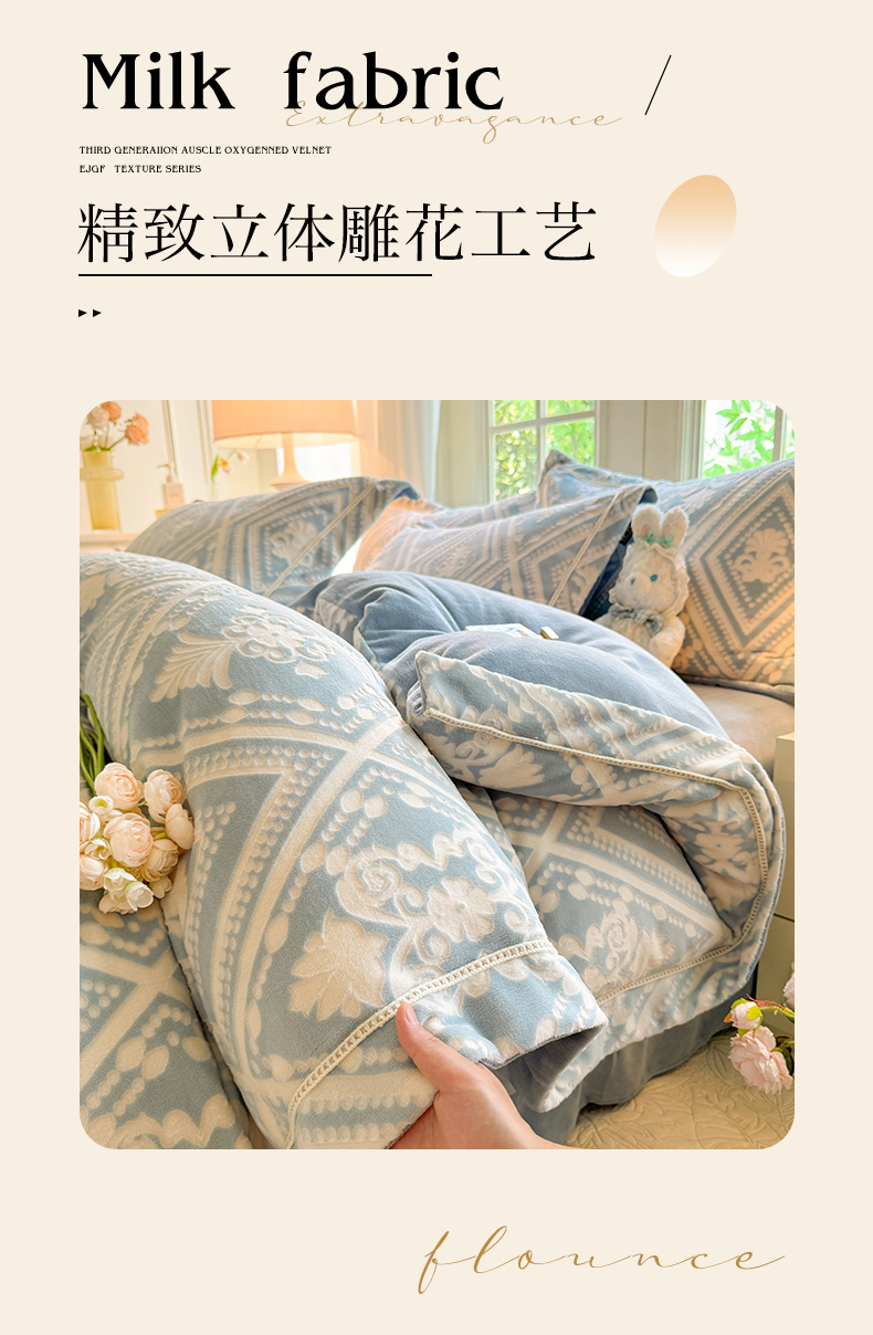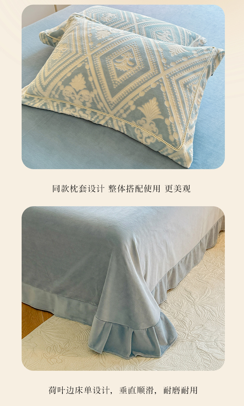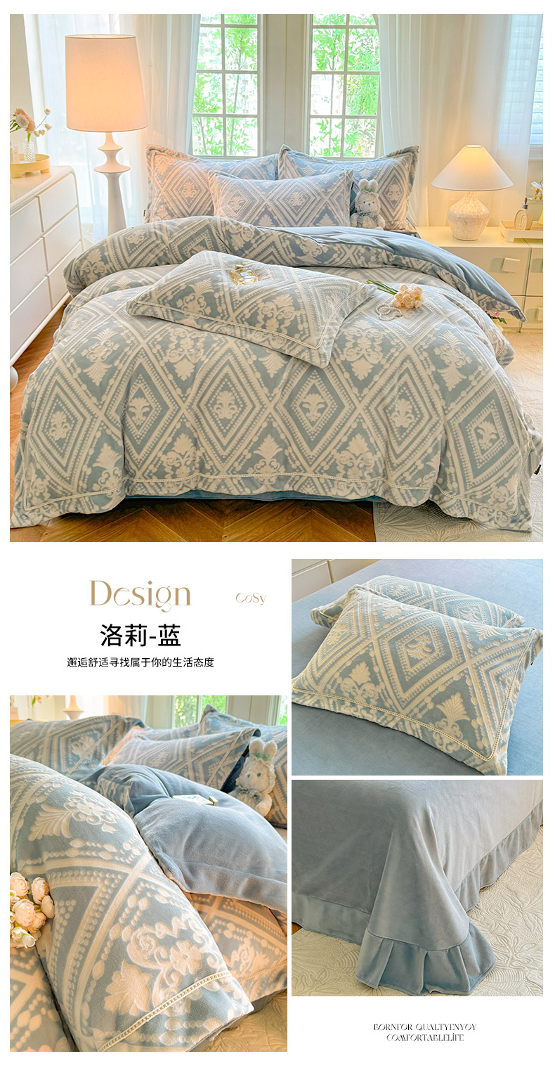 商品名称:简如 2025新款A类加厚冰岛立体雕花牛奶绒浮雕绒四件套(有买家秀) 洛莉-蓝