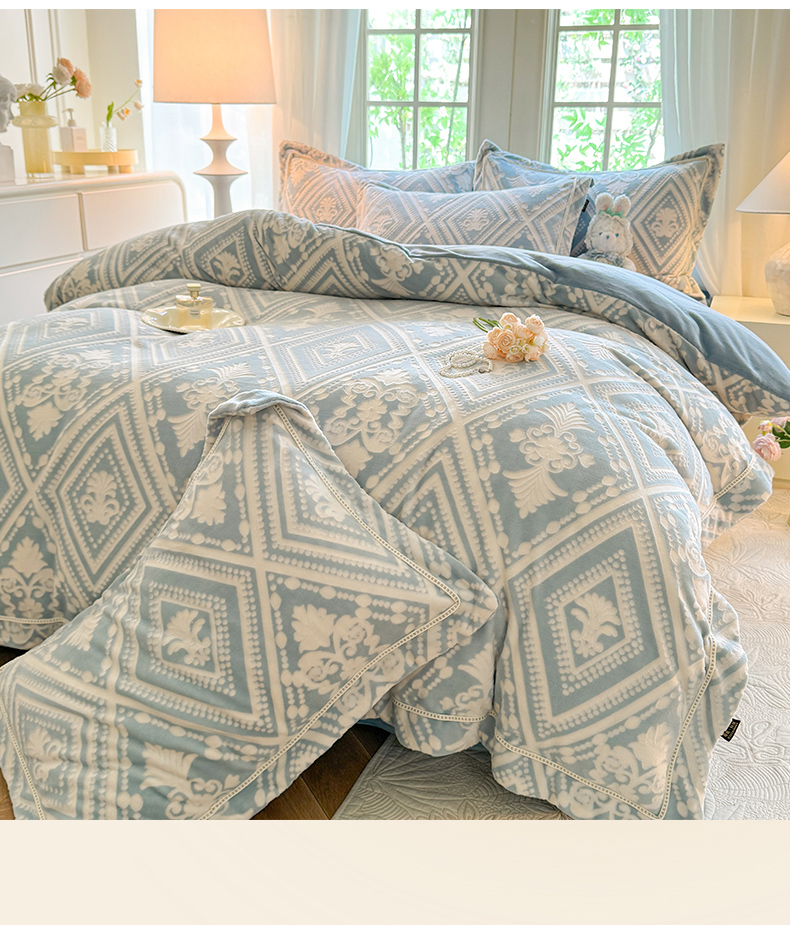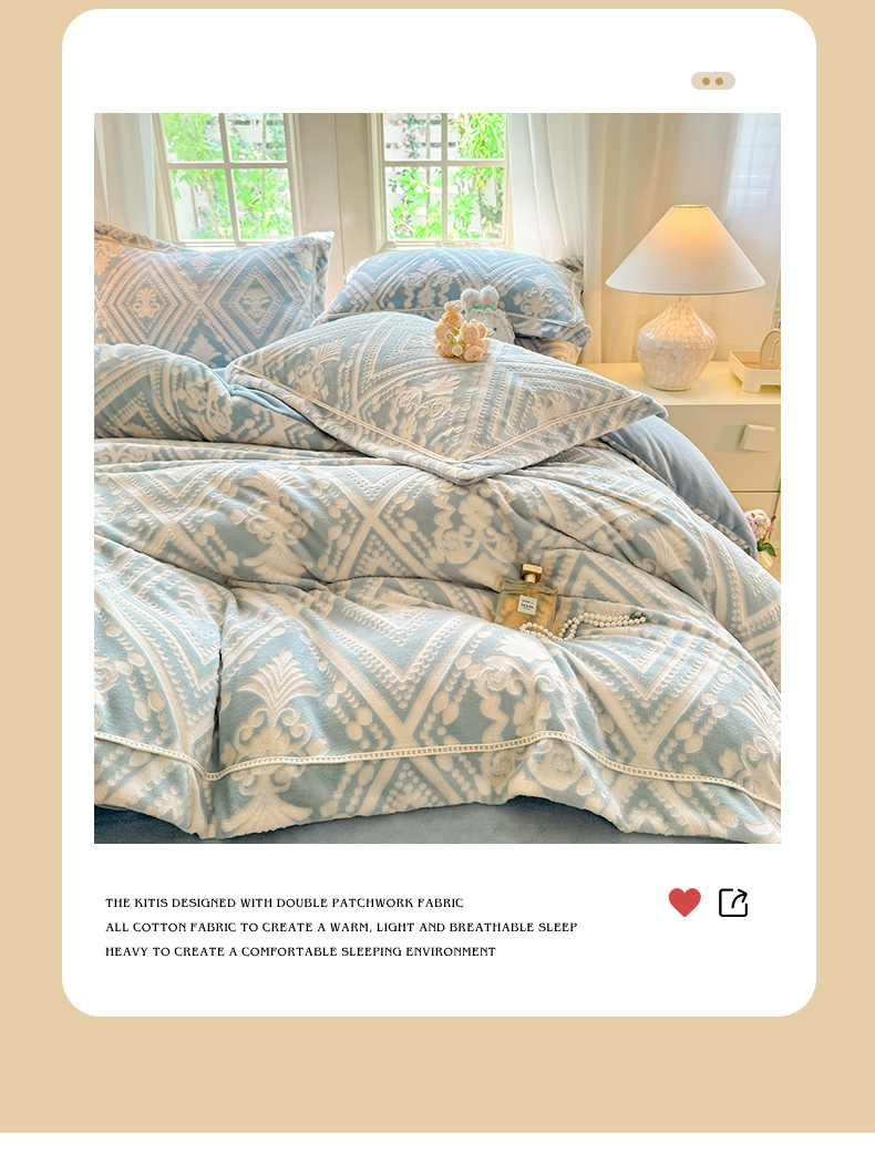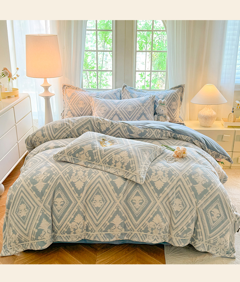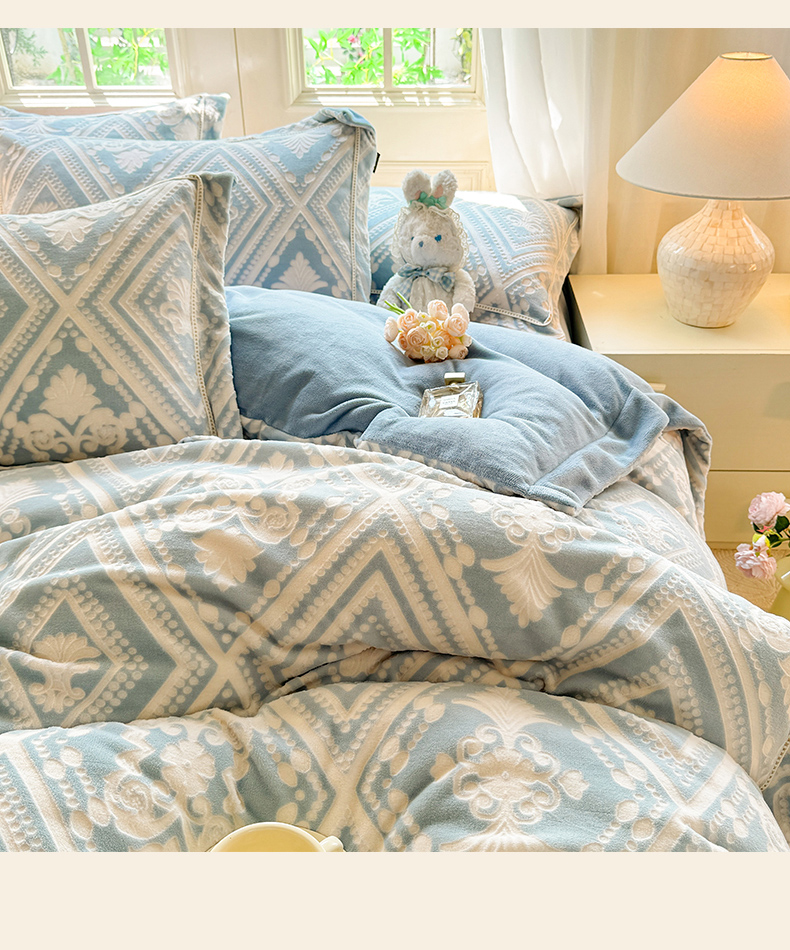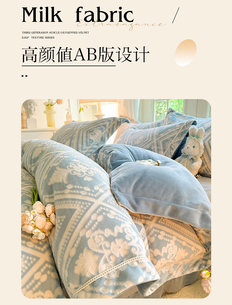 商品名称:简如 2025新款A类加厚冰岛立体雕花牛奶绒浮雕绒四件套(有买家秀) 洛莉-蓝
