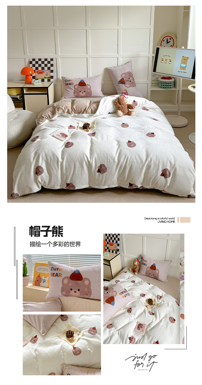 美乐迪家纺 2024新款高克重牛奶绒卡通印花四件套 帽子熊
