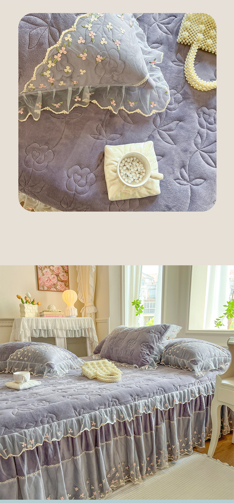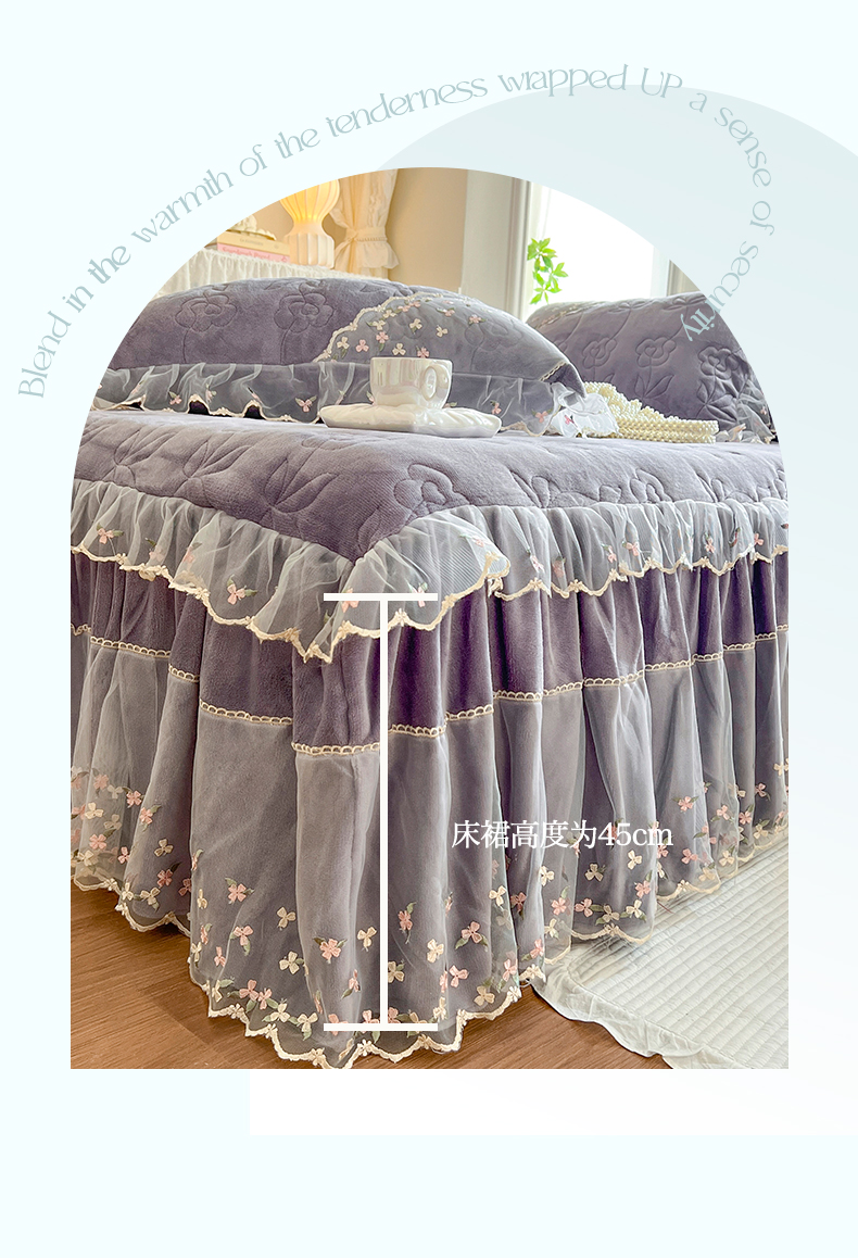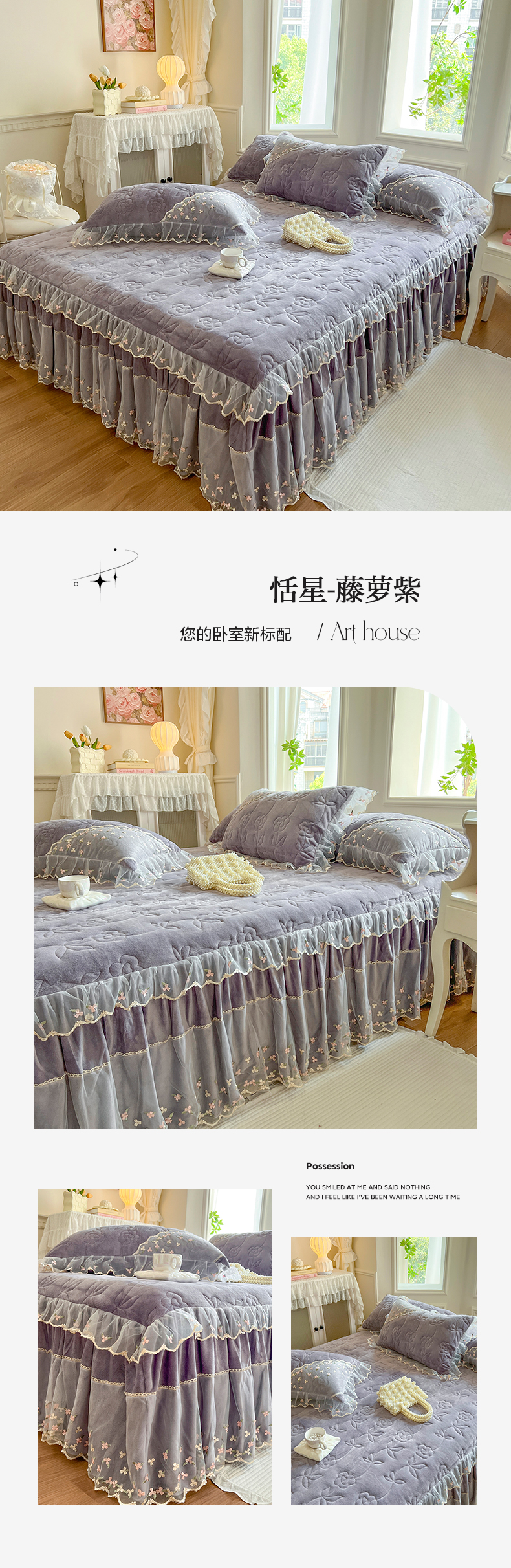 网红馆(ck家纺) 2025新款加厚保暖高克重牛奶绒蕾丝花边床裙款恬星系列床裙三件套 恬星-藤萝紫