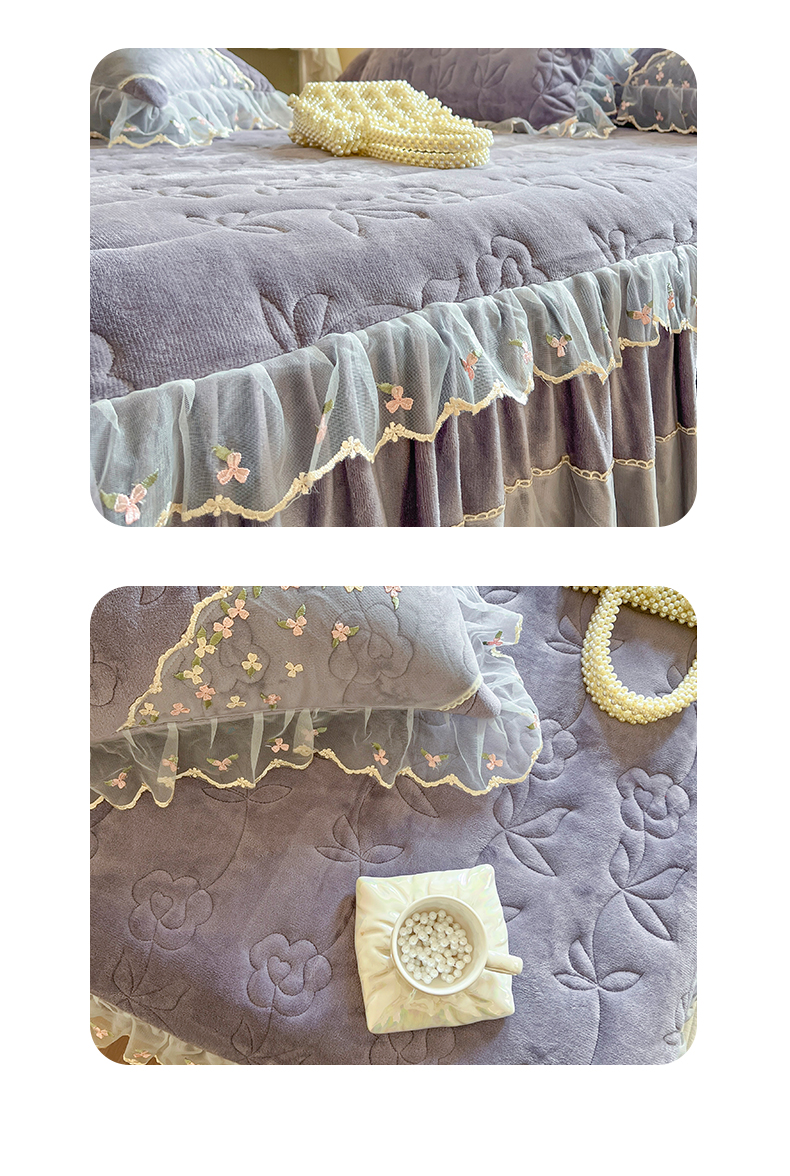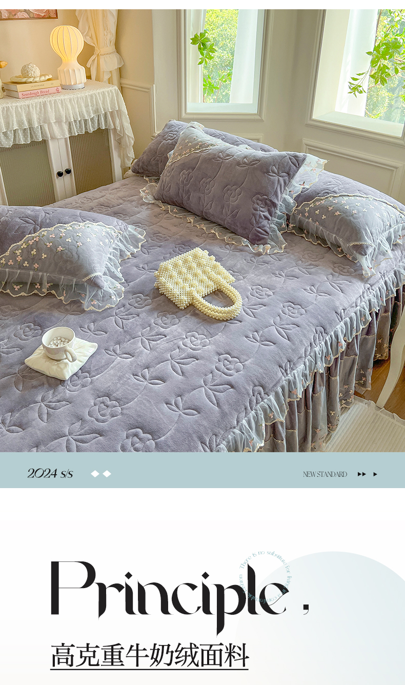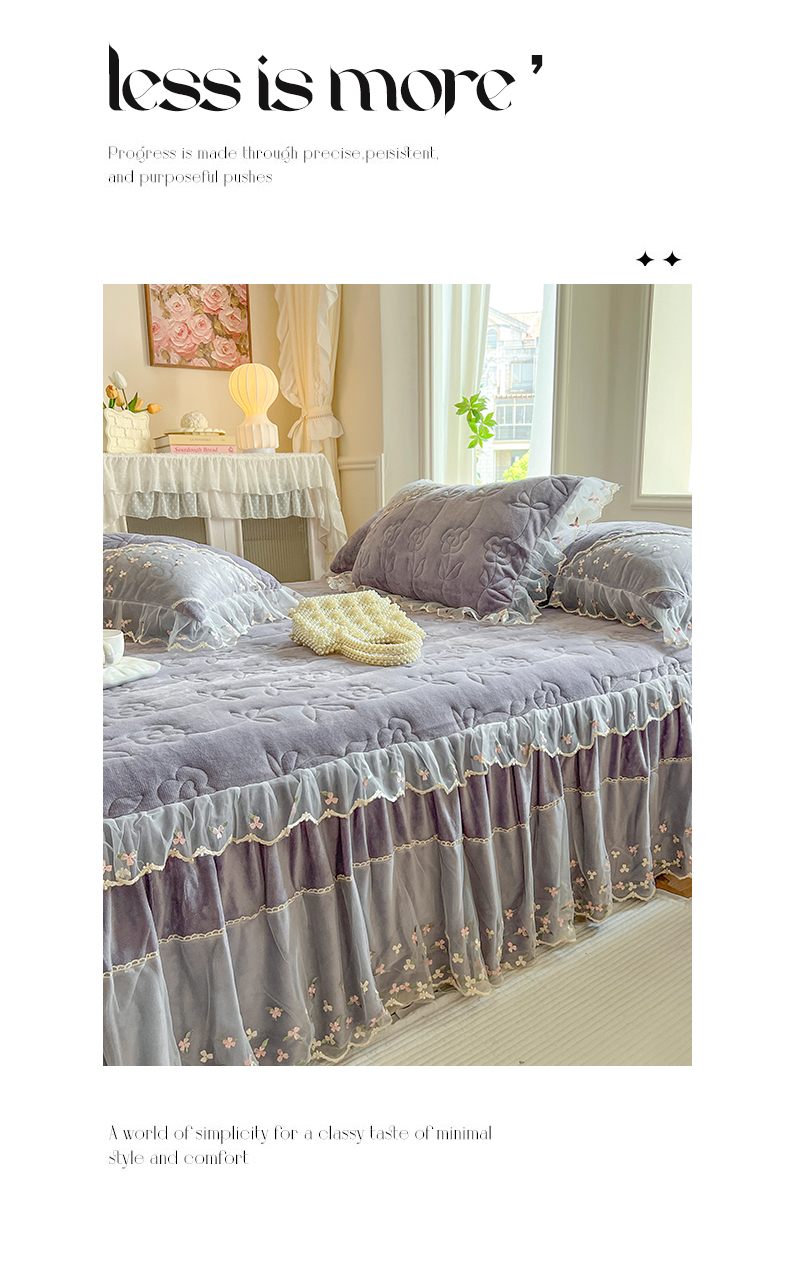 网红馆(ck家纺) 2025新款加厚保暖高克重牛奶绒蕾丝花边床裙款恬星系列床裙三件套 恬星-藤萝紫
