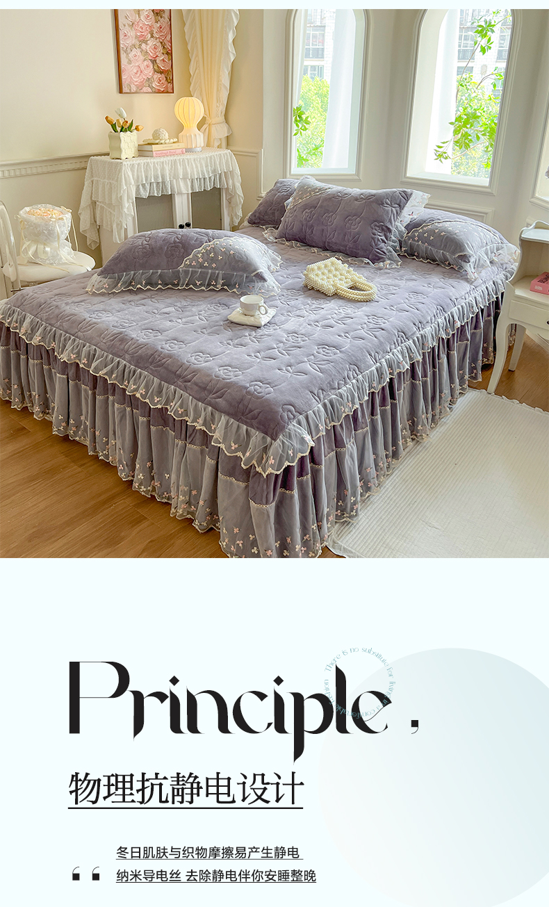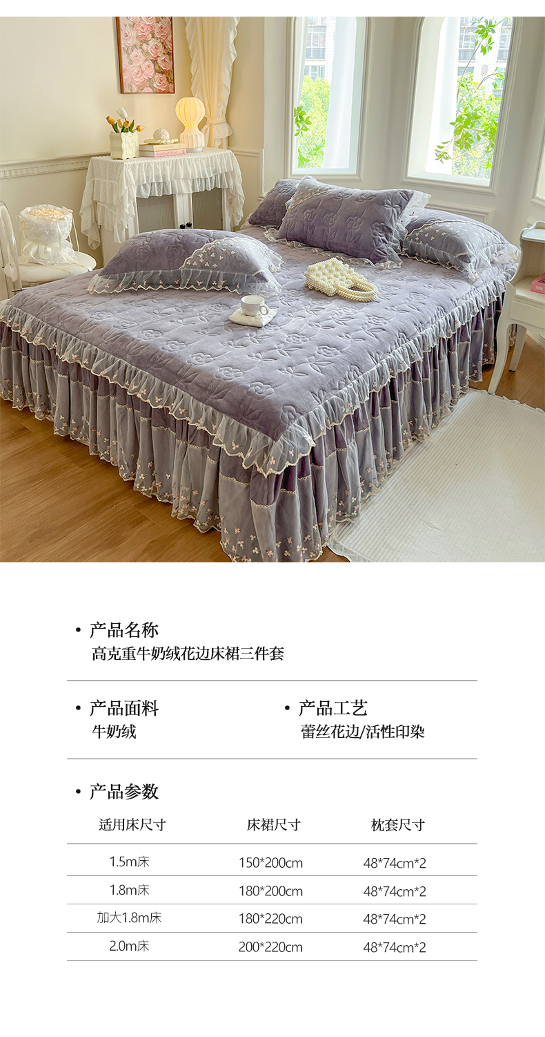 商品名称:网红馆(ck家纺) 2025新款加厚保暖高克重牛奶绒蕾丝花边床裙款恬星系列床裙三件套 恬星-藤萝紫