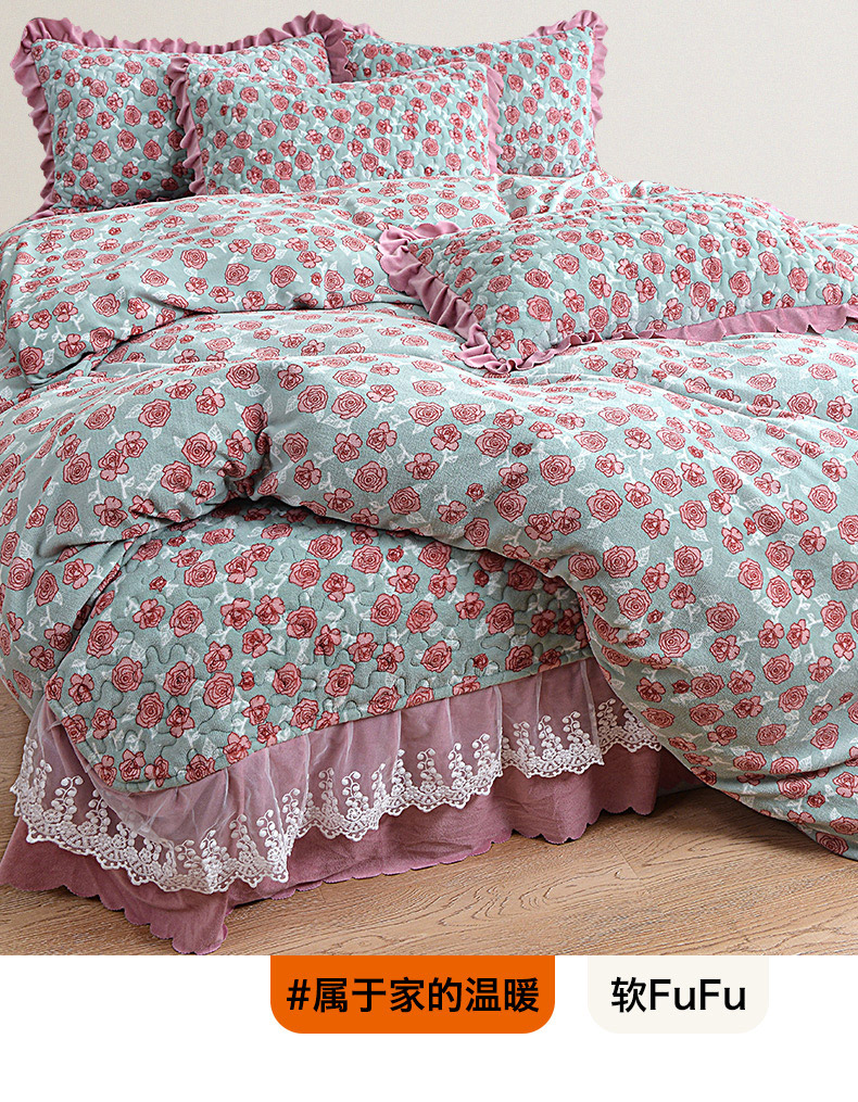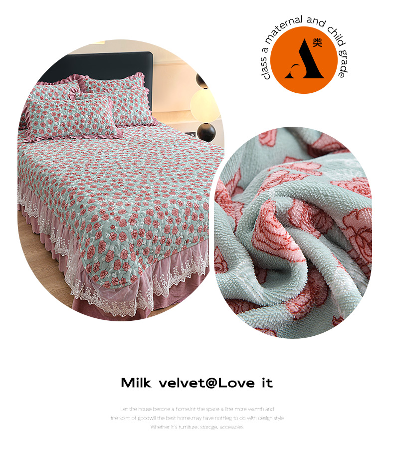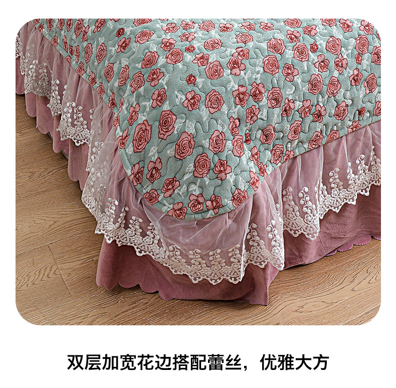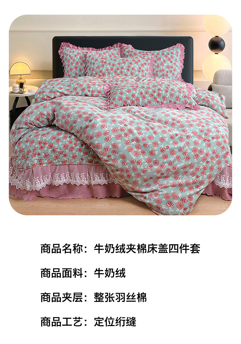 2024新款亲肤牛奶绒夹棉床盖四件套 粉色玫瑰