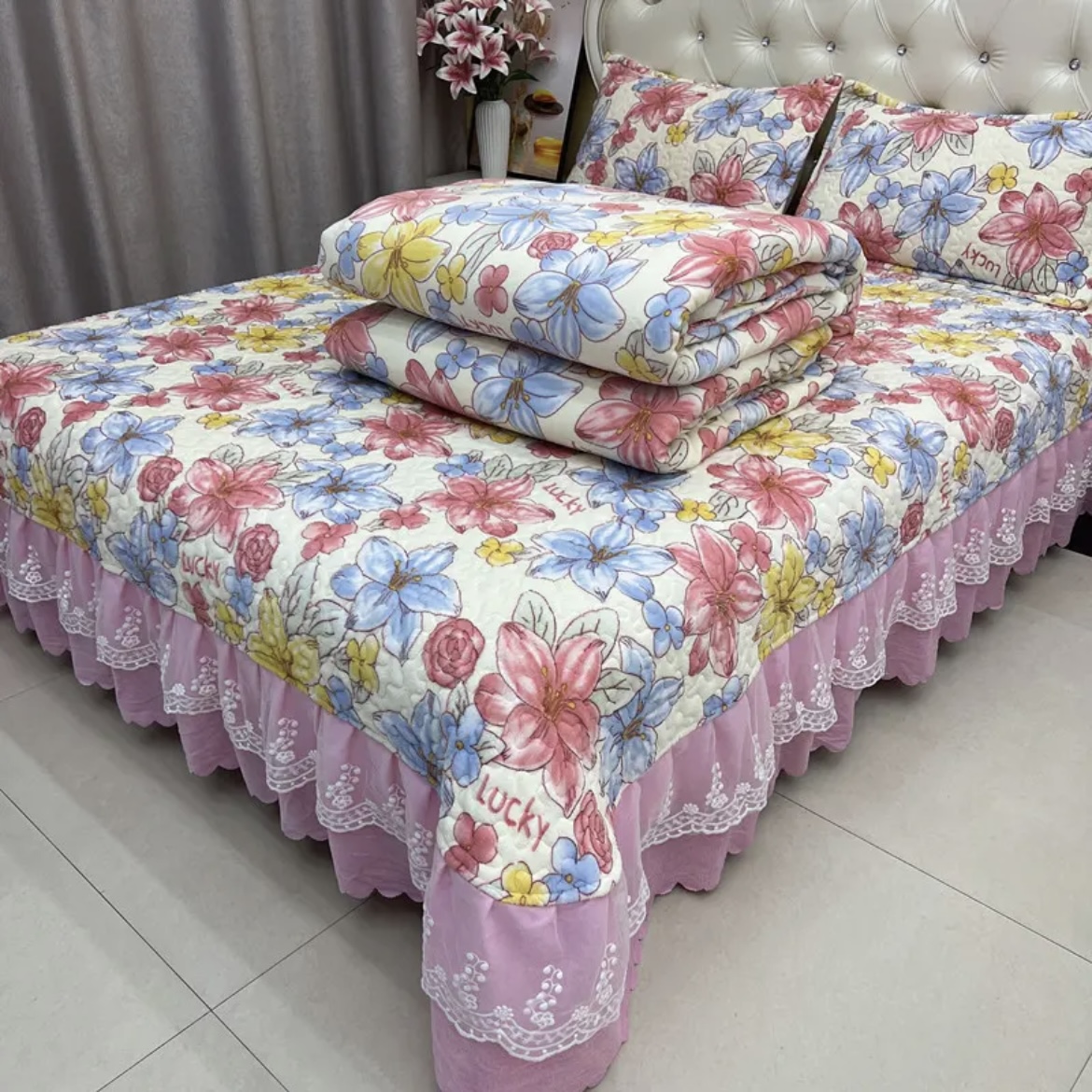 (总)梦柏家纺 2025新款韩式牛奶绒刺绣花边床盖四件套,风信紫,湖水蓝,浅草绿,蔷薇粉,樱花粉,月光白