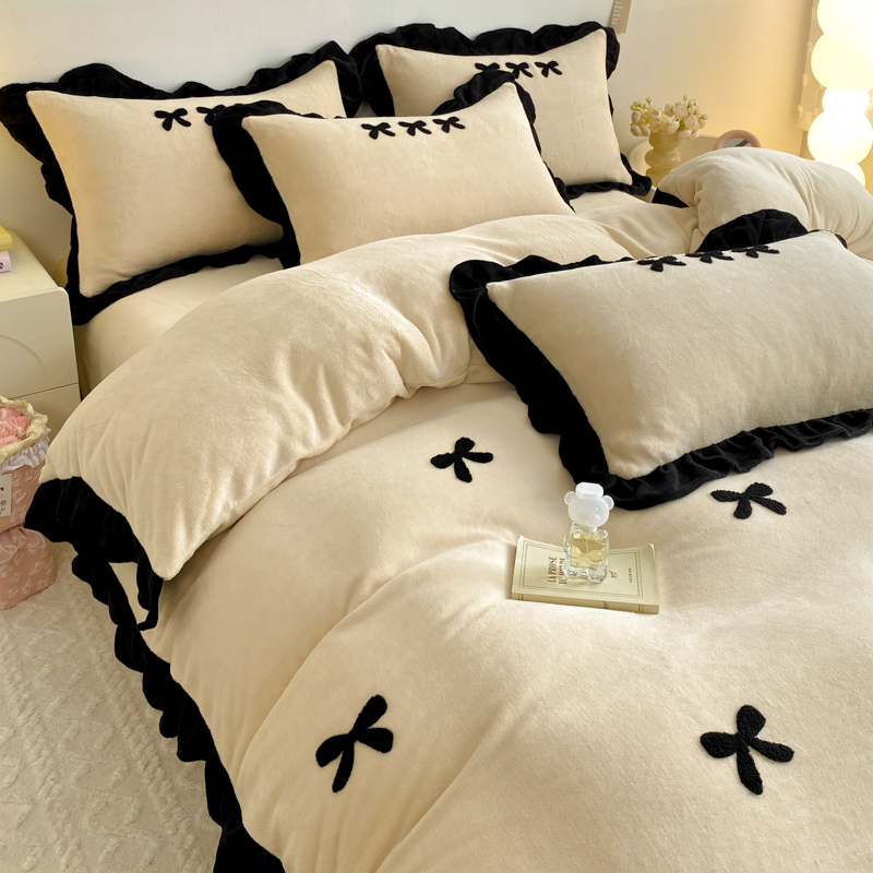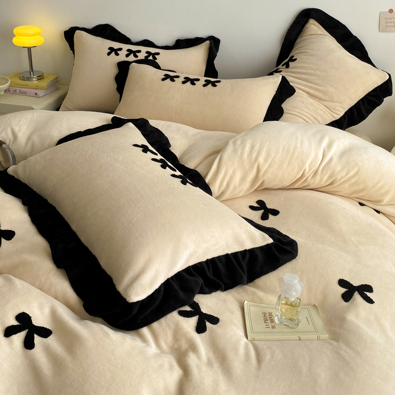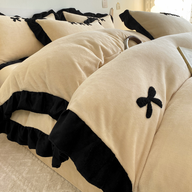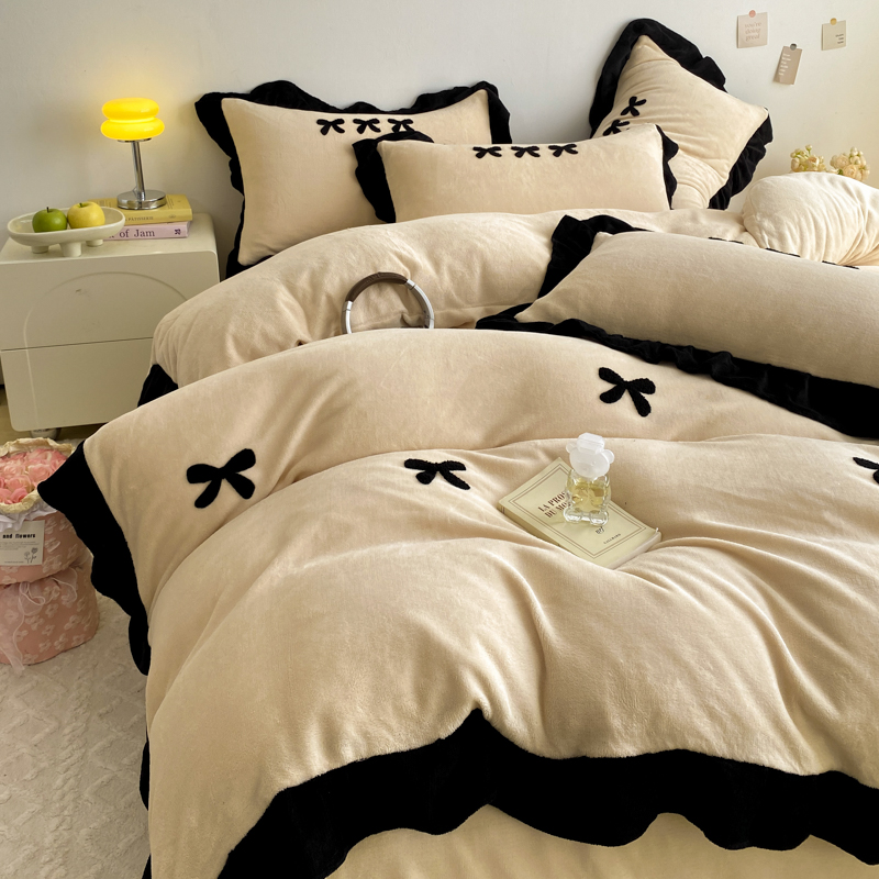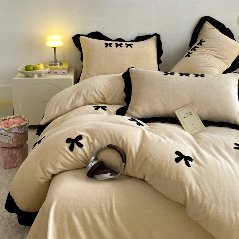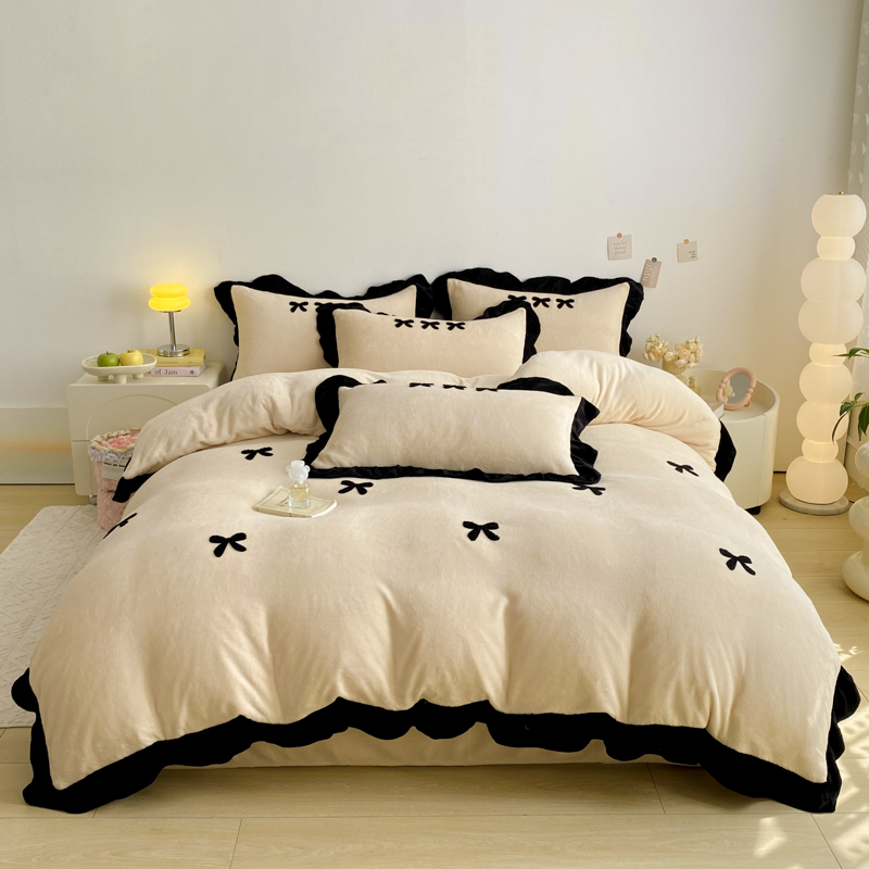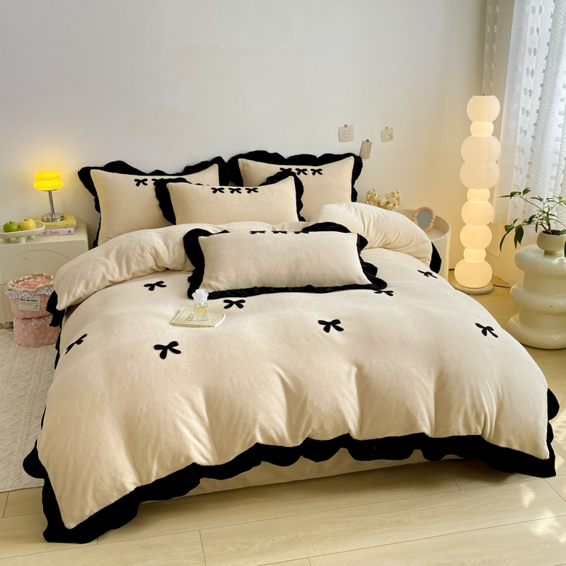 商品名称:梦莱斯 2024新款黑边绣花牛奶绒四件套 蝴蝶结-咖