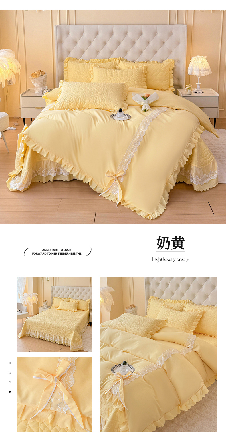 金米诺 新款韩版花边水洗棉泡泡纱四件套公主条四件套 褶皱-浅黄,褶皱-浅黄