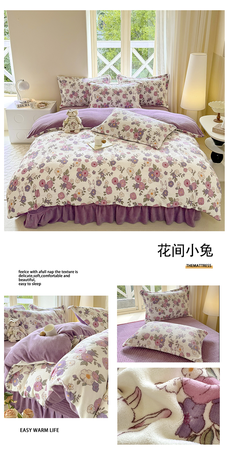 商品名称:富之航 2024新款印花牛奶绒床盖四件套 花间小兔