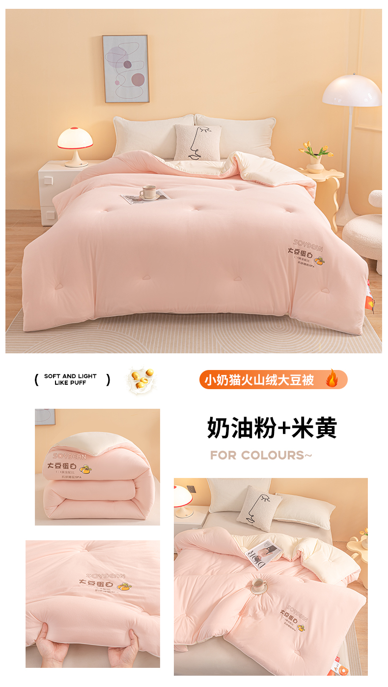 商品名称:佳居缘 2025新款小奶猫A类针织棉火山绒大豆被被子被芯软糯单人双人被芯冬被 奶油粉米黄双拼