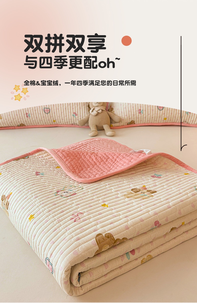 当前位置: 91家纺网 > 商品网购 > 床上用品 > 床盖 > 2024新款全棉卡通印花宝宝绒双拼床盖床垫最美的期待