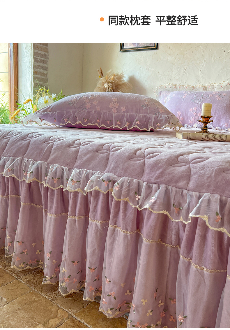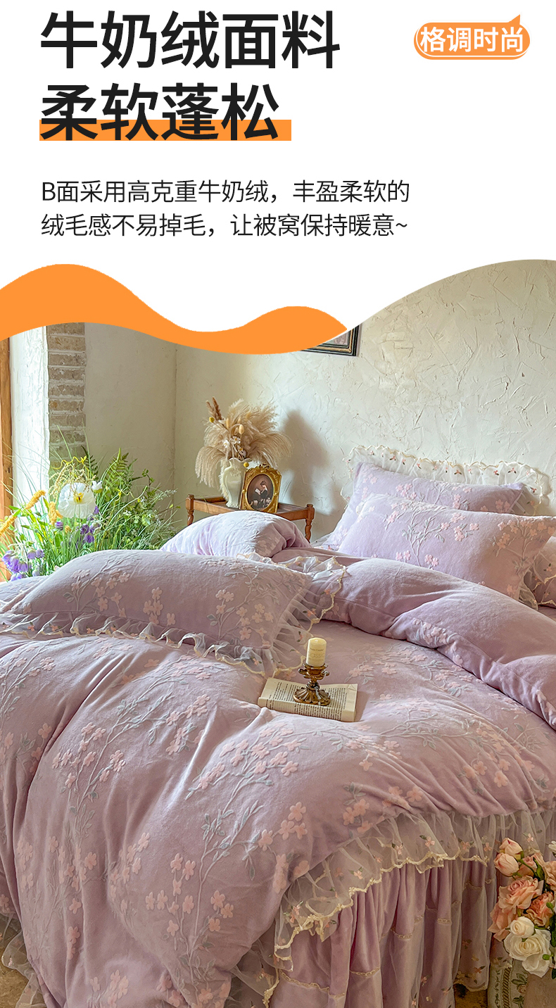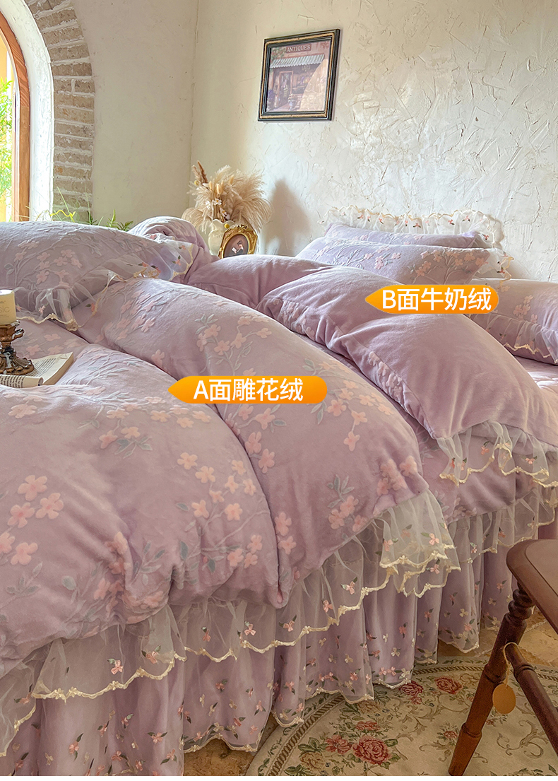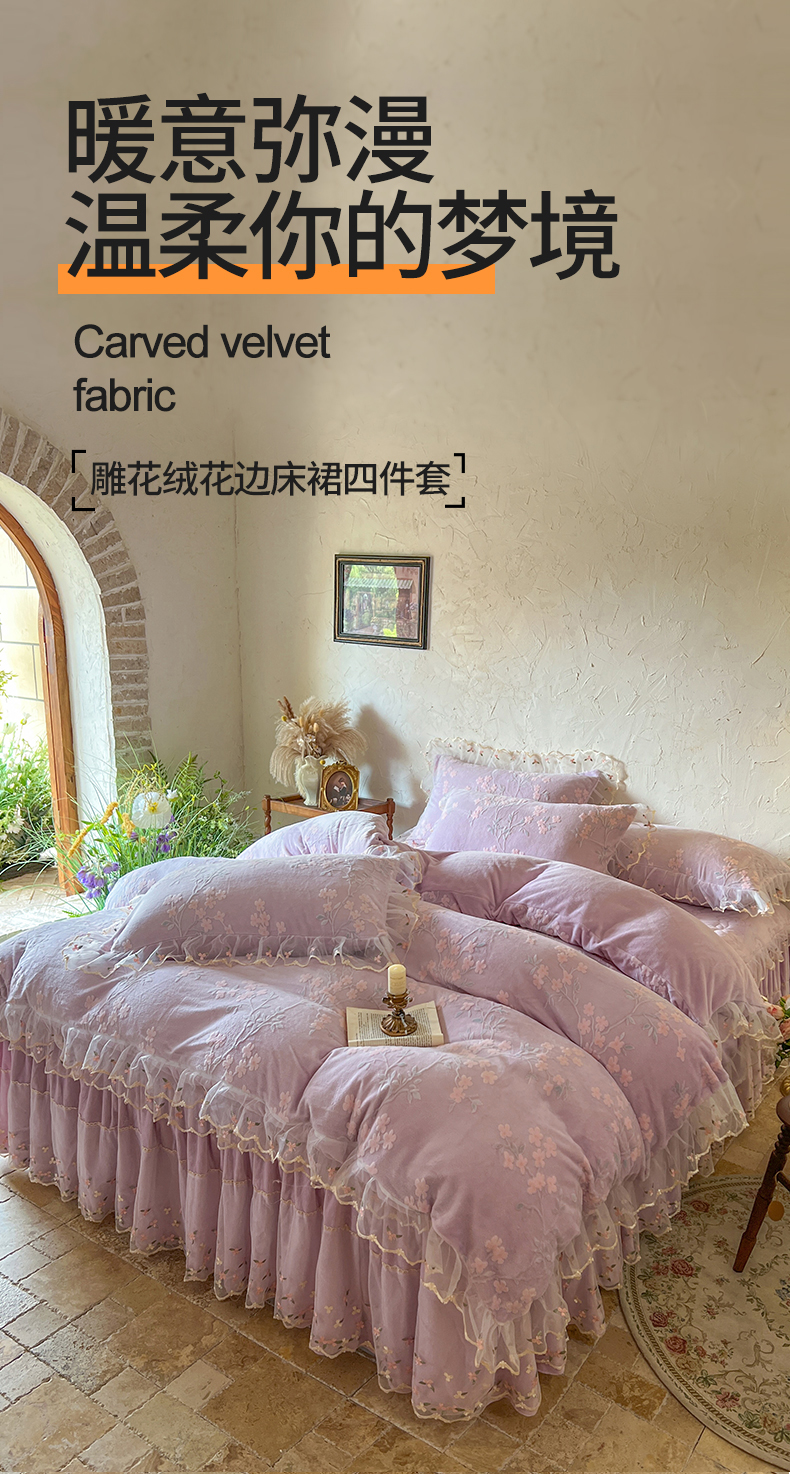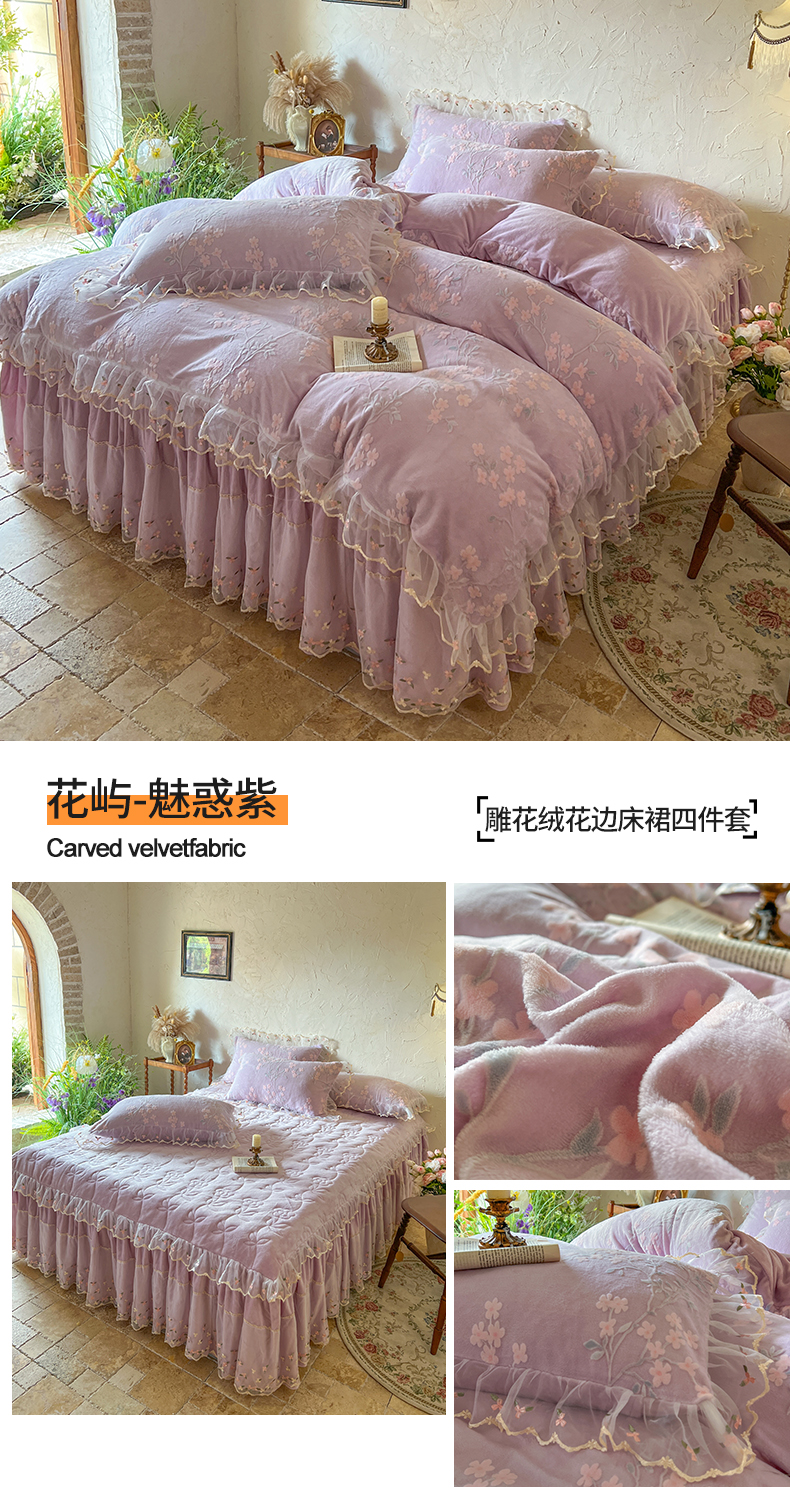 当前位置: 91家纺网 > 商品网购 > 床品套件 > 四件套 > 雕花绒四件套 > 网红馆(ck家纺) 2025新款雕花绒床裙四件套--花屿 花屿-魅惑紫