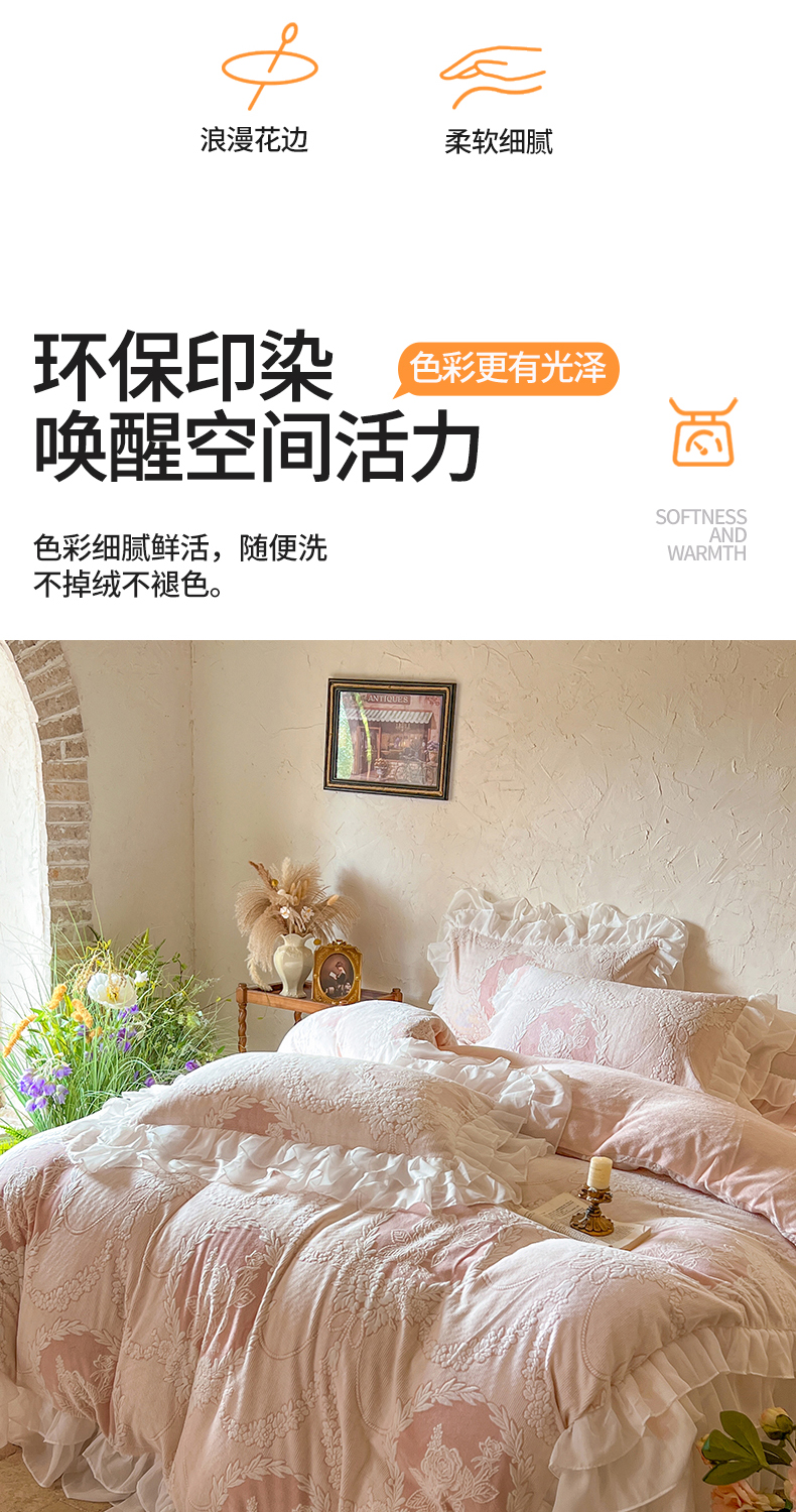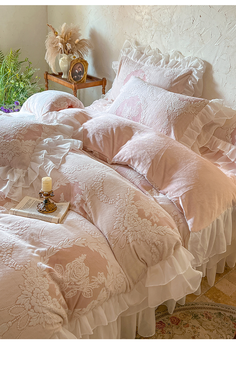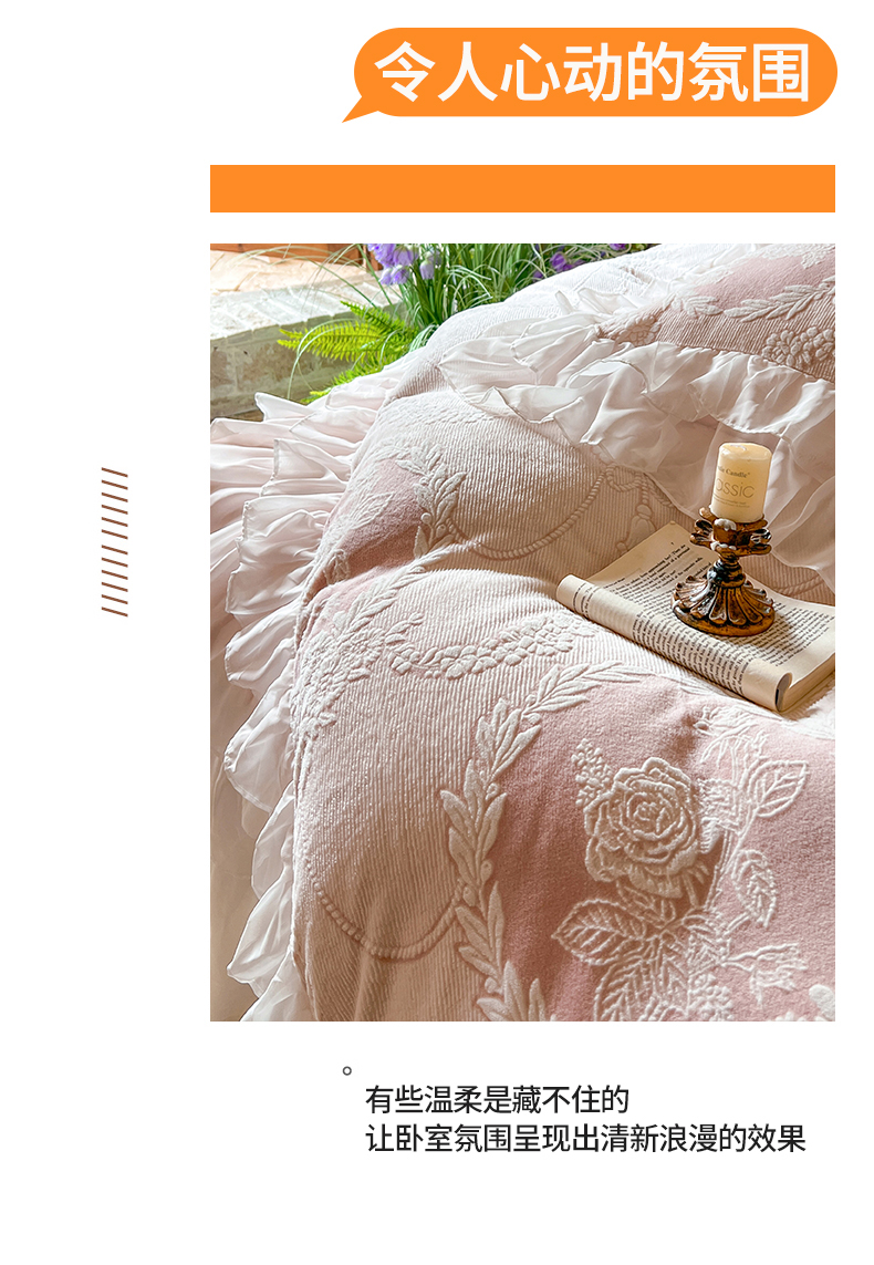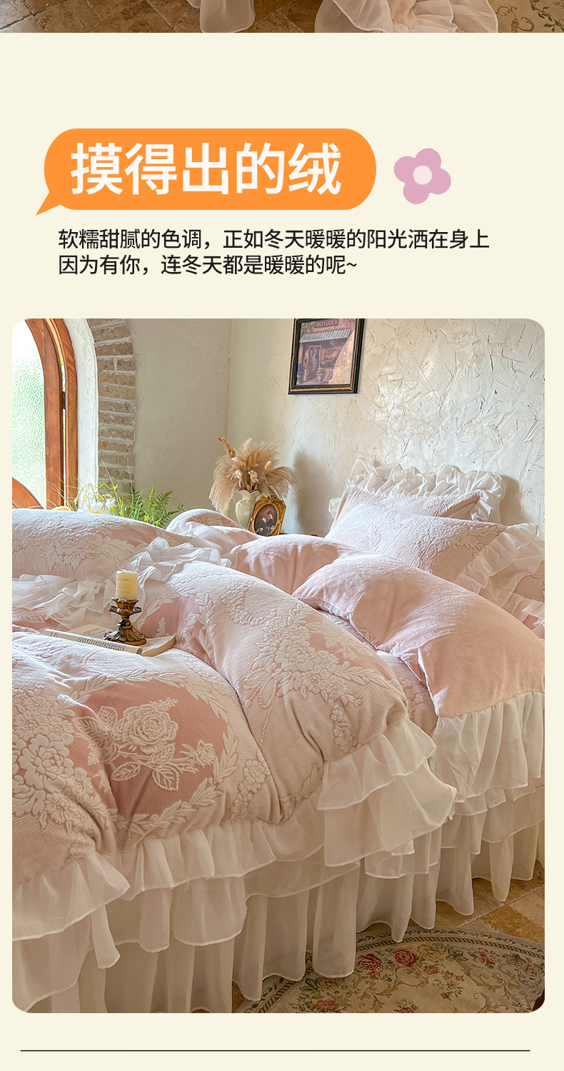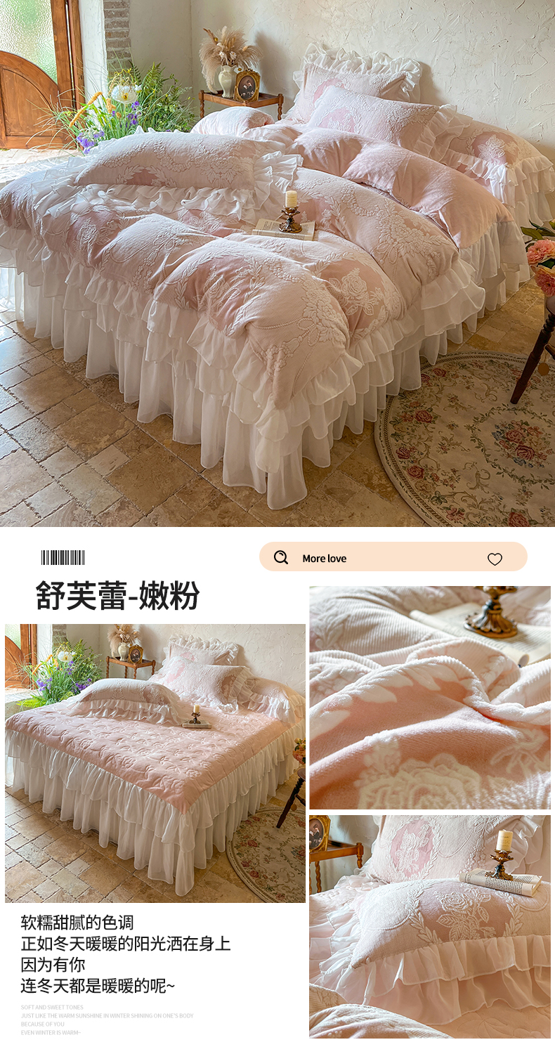 当前位置: 91家纺网 > 商品网购 > 床品套件 > 四件套 > 雕花绒四件套 > 网红馆(ck家纺) 2025新款雕花绒床裙四件套--舒芙蕾 舒芙蕾-嫩粉