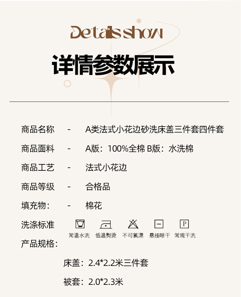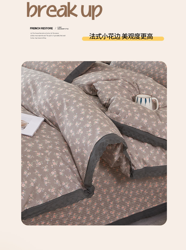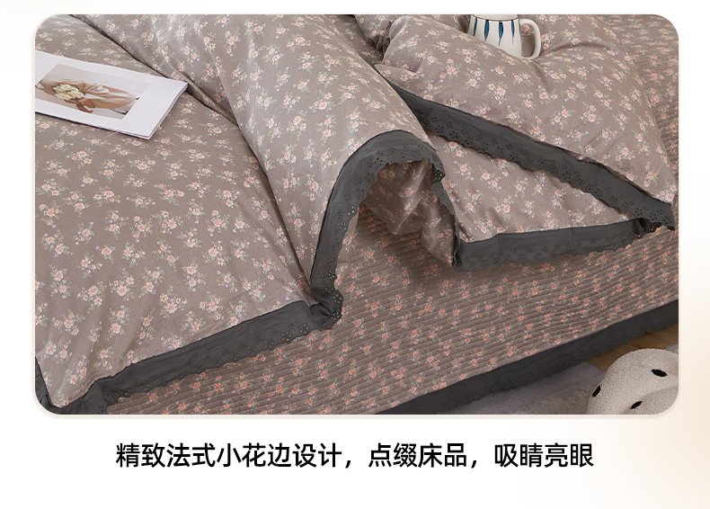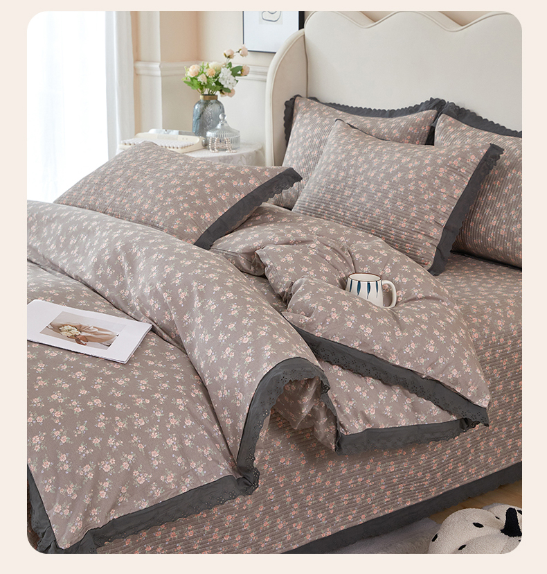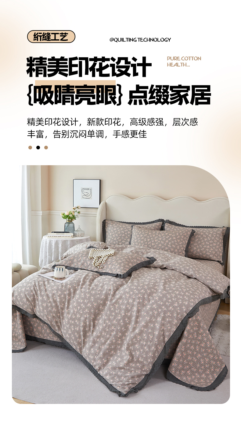 商品名称:(总)莎果家纺 2024新款法式小花边砂洗床盖三件套四件套(填充棉花)