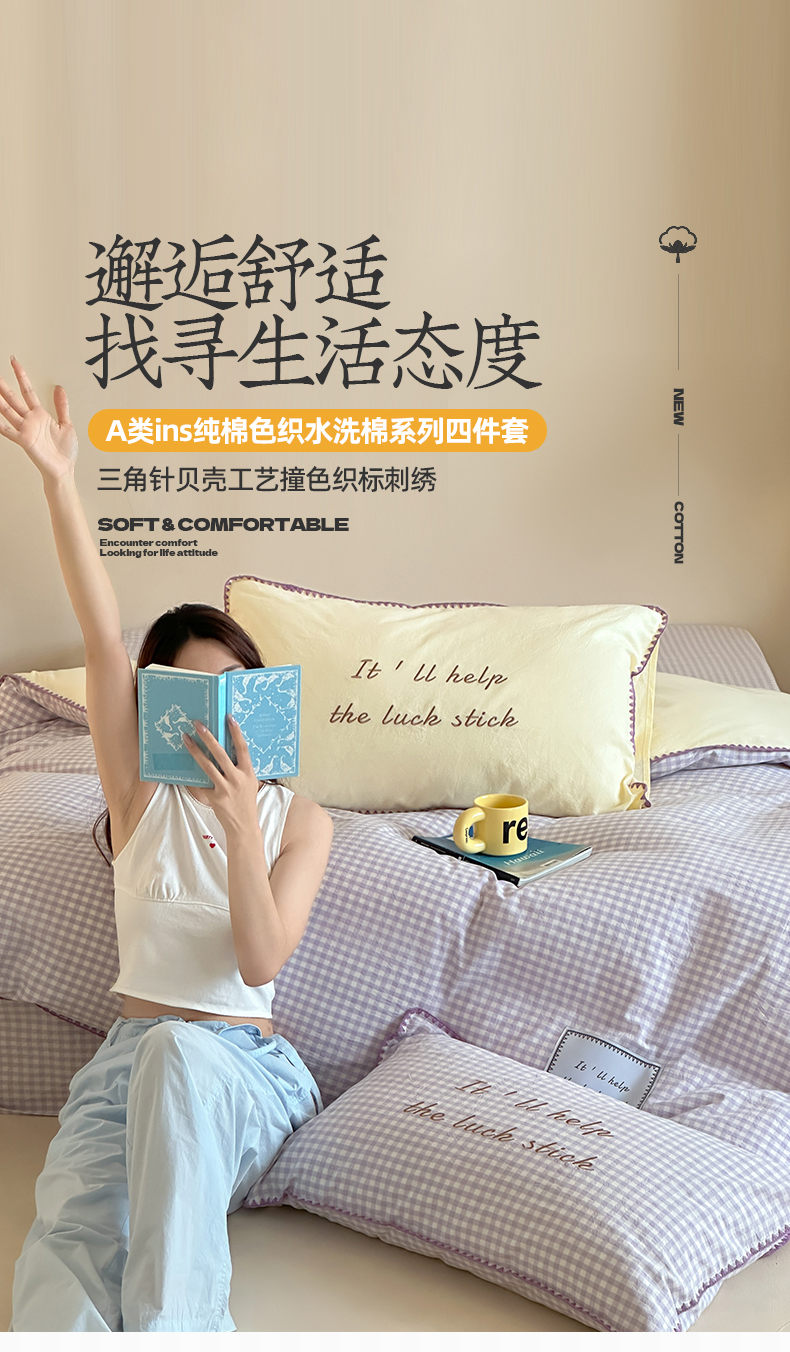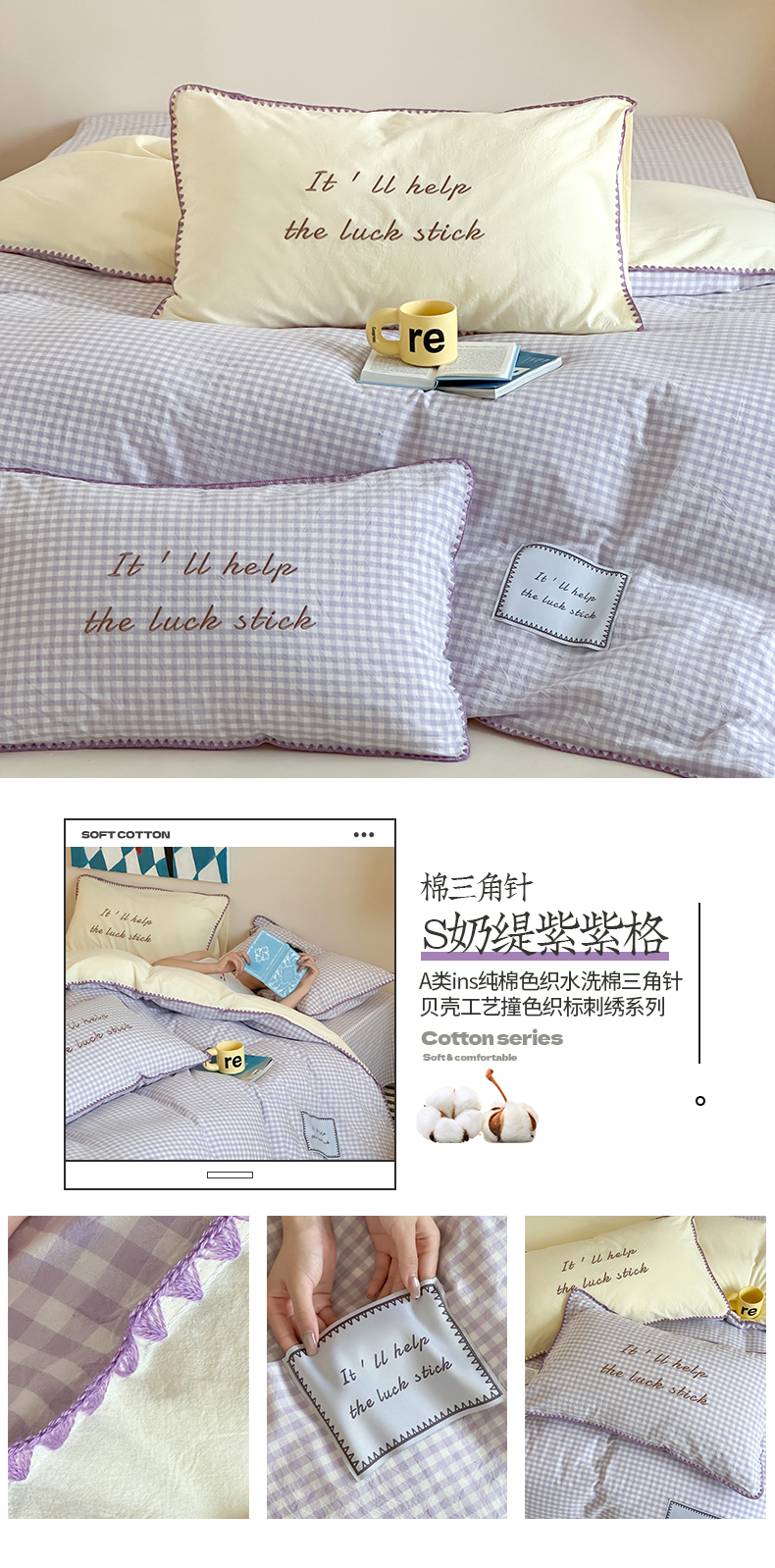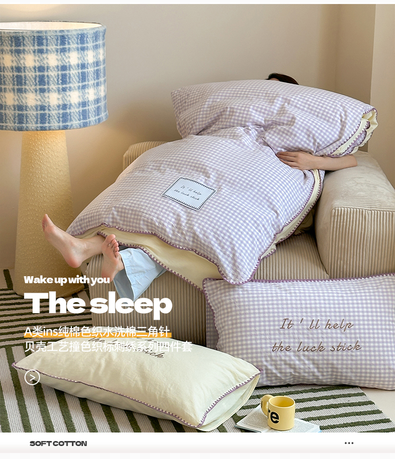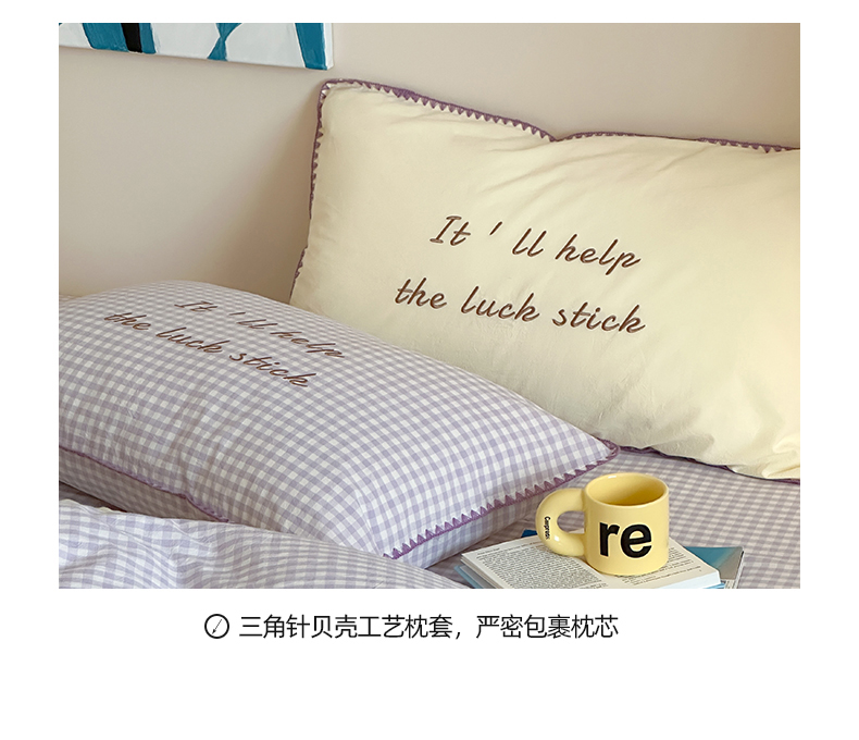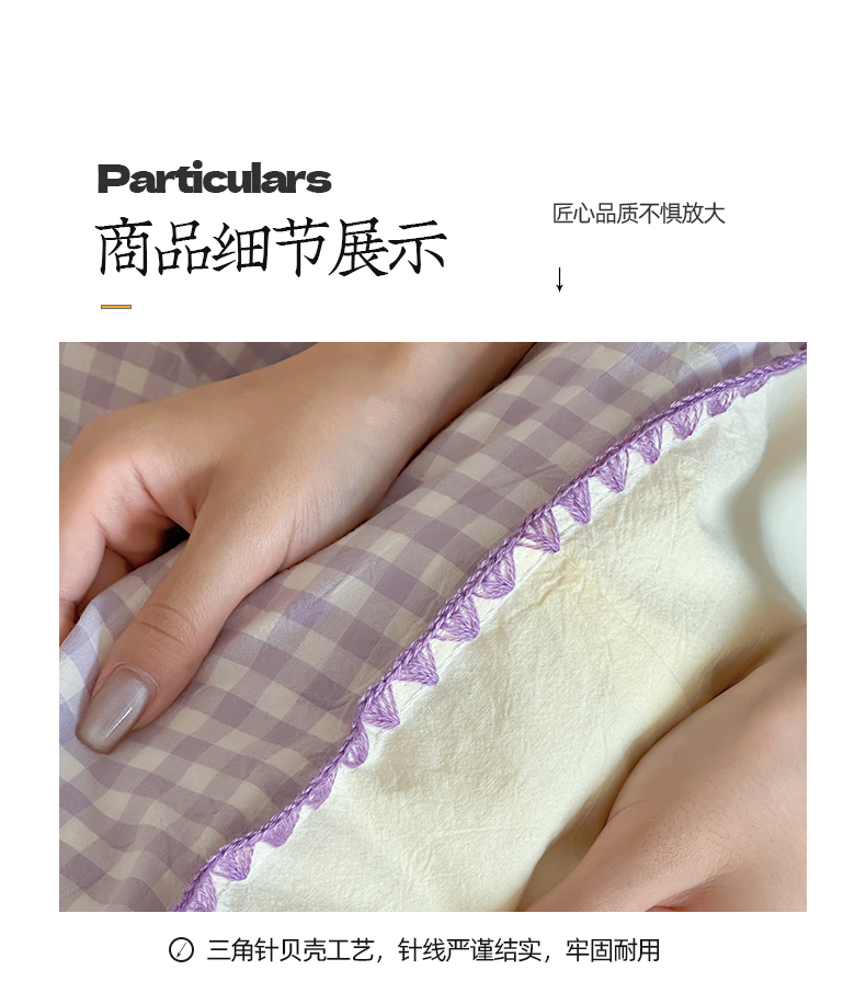 当前位置: 91家纺网 > 商品网购 > 床品套件 > 四件套 > 水洗棉四件套 > 桃子家居 2025新款A类ins纯棉色织水洗棉三角针贝壳工艺撞色织标刺绣系列四件套 棉三角针-S奶缇紫紫格