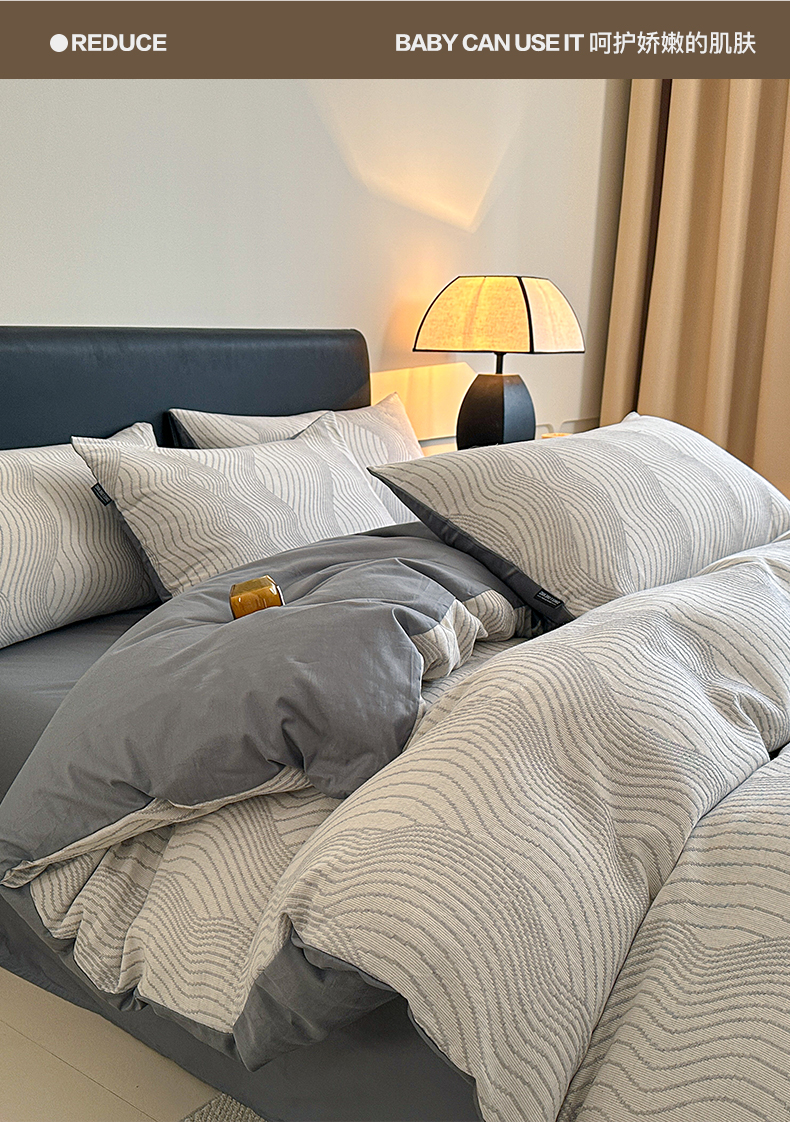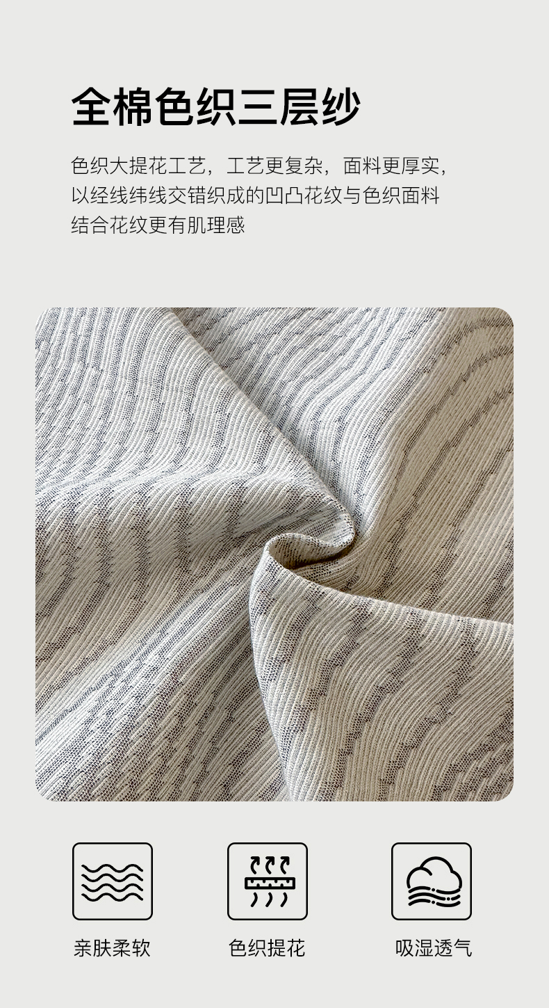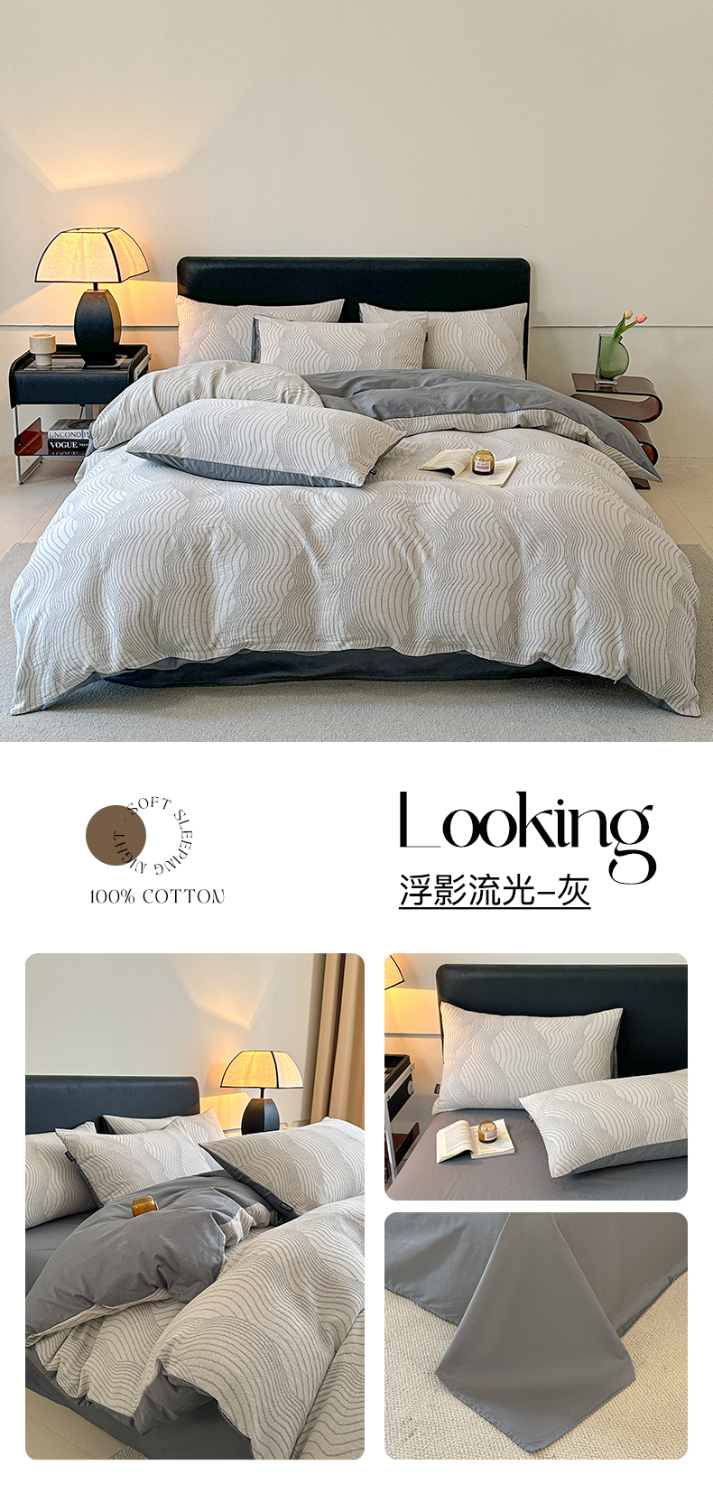 商品名称:格里芬家纺 2025新款全棉色织水洗三层纱提花纯棉四件套 浮影流光-灰