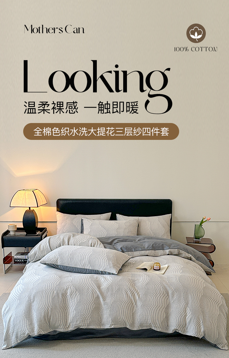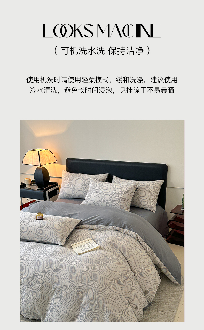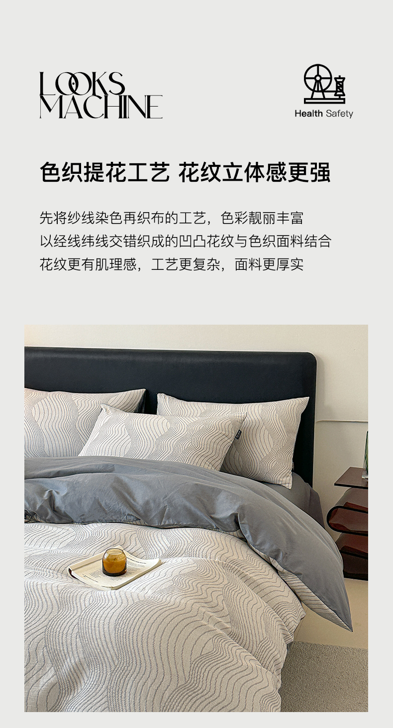 商品名称:格里芬家纺 2025新款全棉色织水洗三层纱提花纯棉四件套 浮影流光-灰