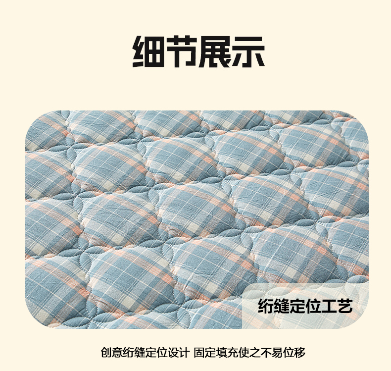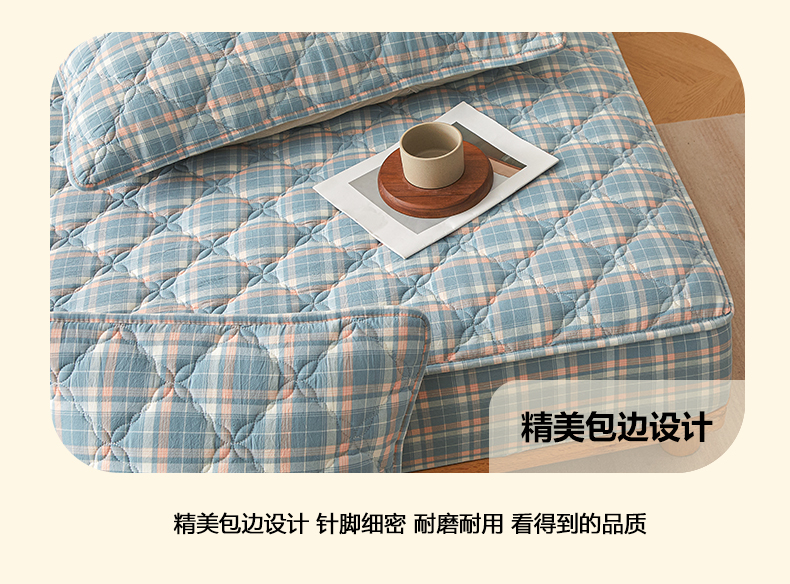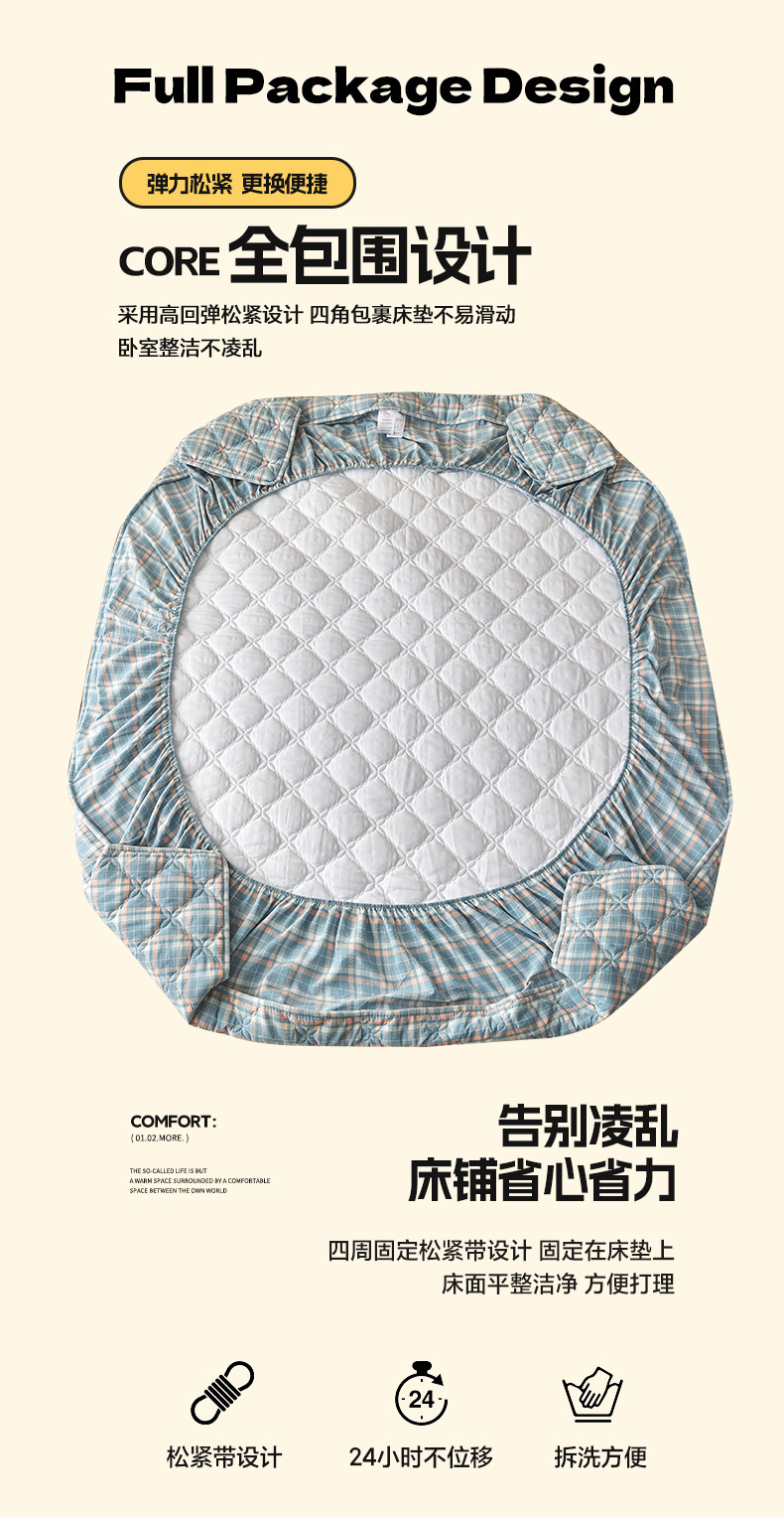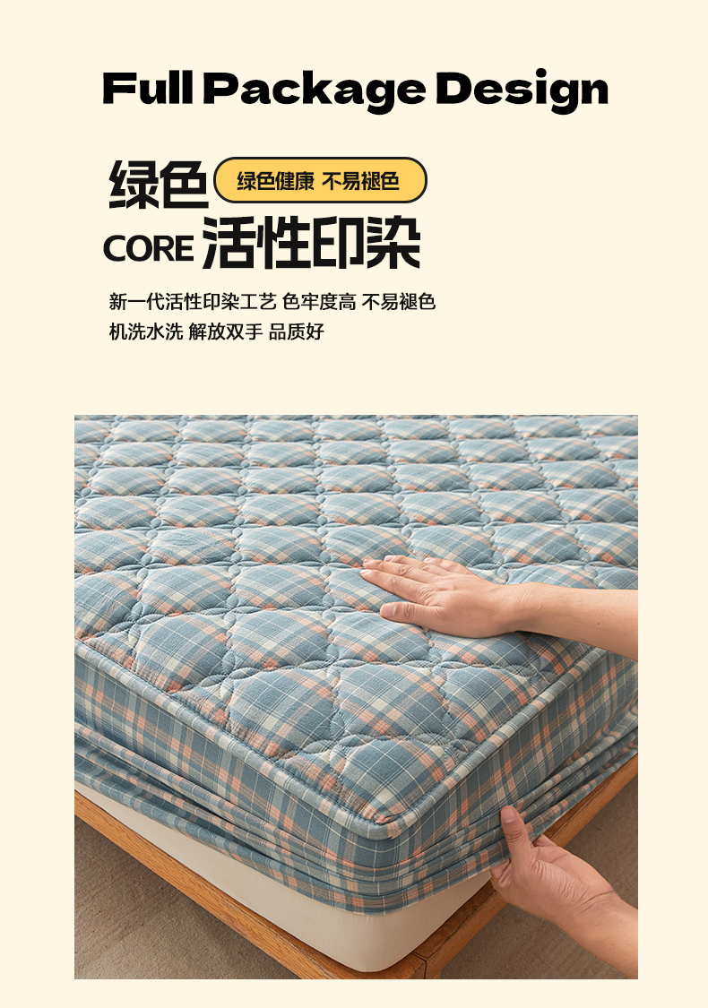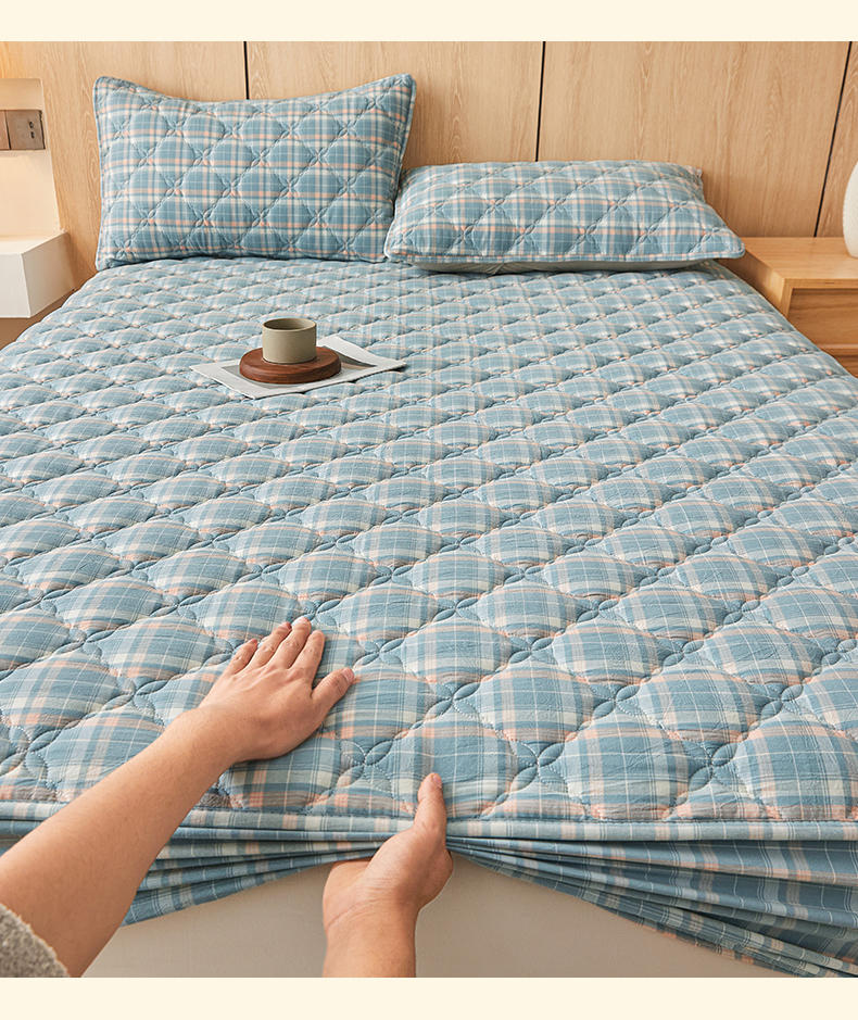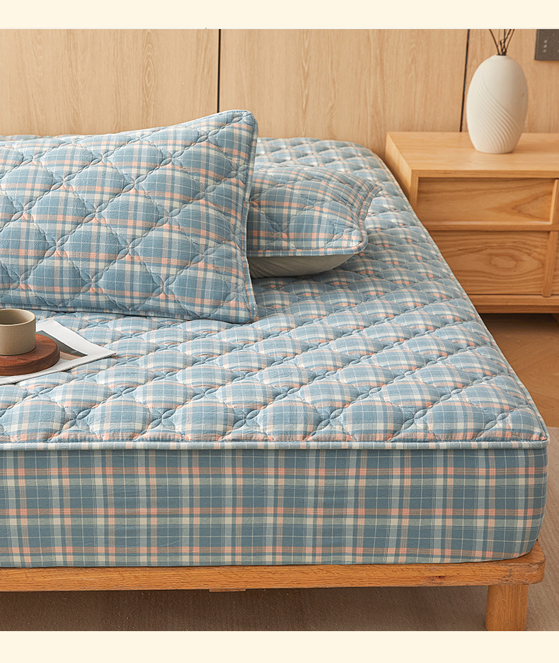 (总)糯米猪家纺 2023新款亲肤棉六面全包夹棉床笠--时尚格,水蓝,深蓝,灰色,白色,米色,粉玉