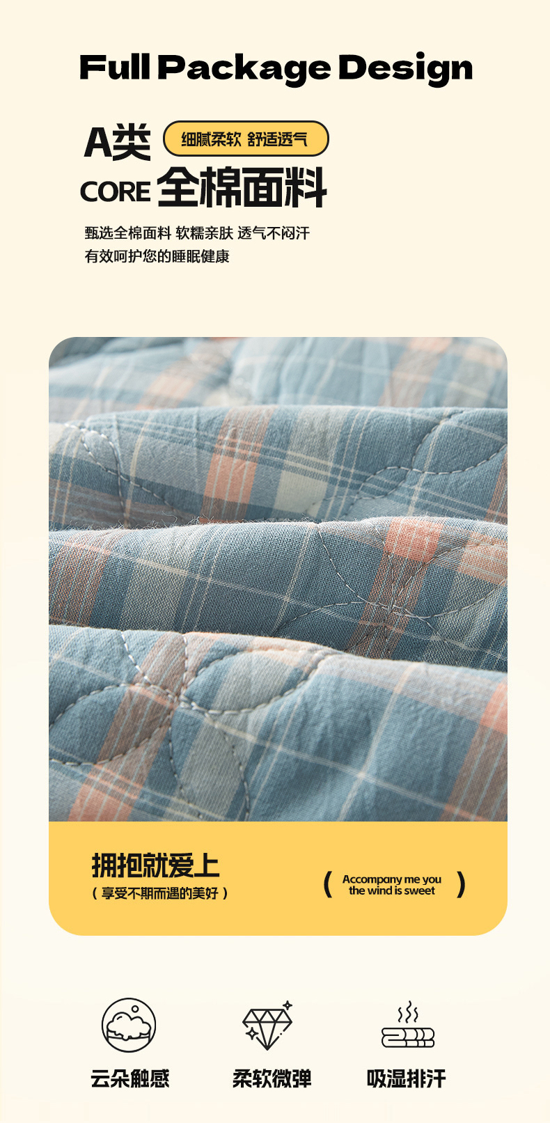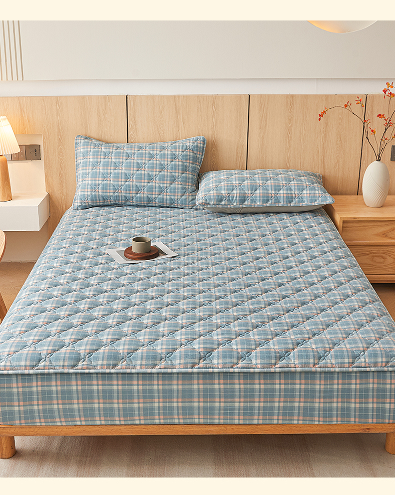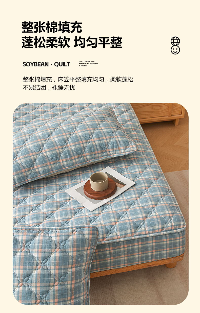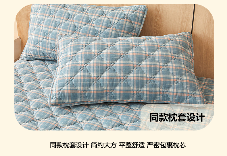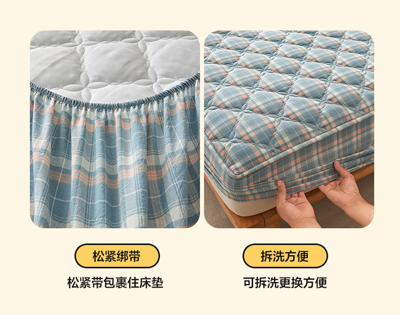 (总)糯米猪家纺 2023新款亲肤棉六面全包夹棉床笠--时尚格,水蓝,深蓝,灰色,白色,米色,粉玉
