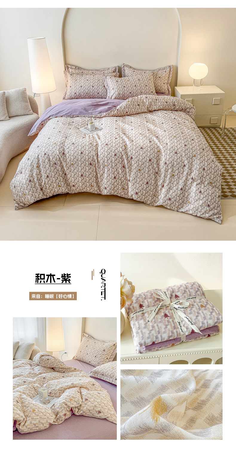 商品名称:喜四方 2025新款全棉A类母婴级抗菌全棉双层纱四件套 积木-紫