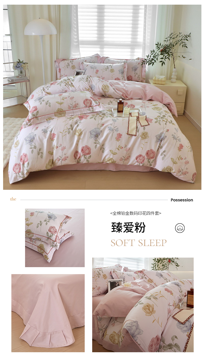 商品名称:启航家居 2025春夏全棉铂金棉数码印花四件套 臻爱粉