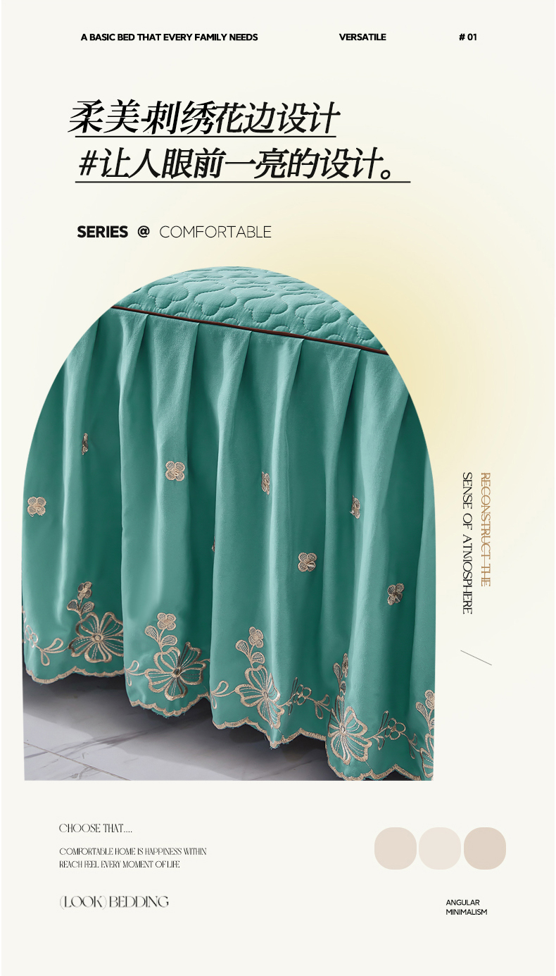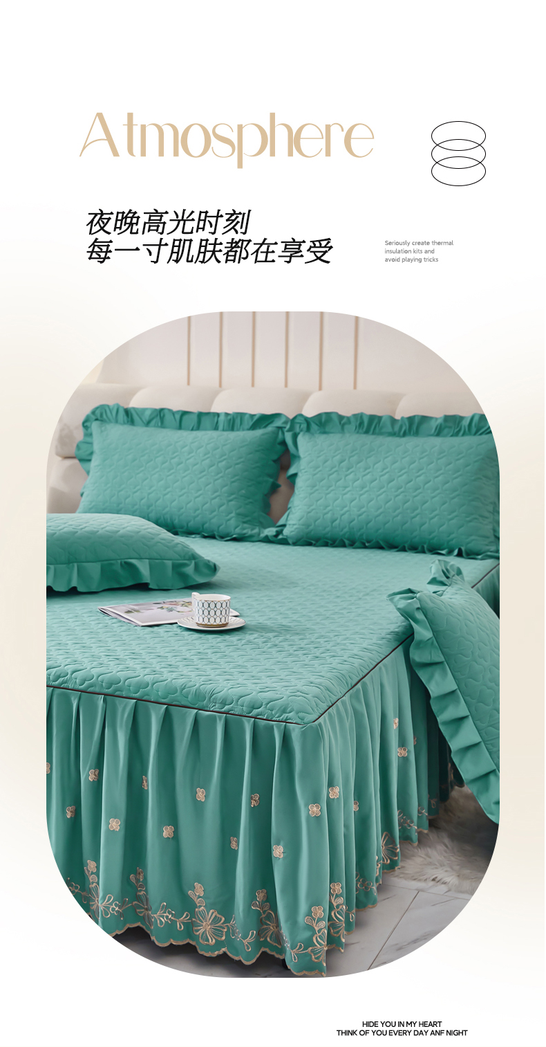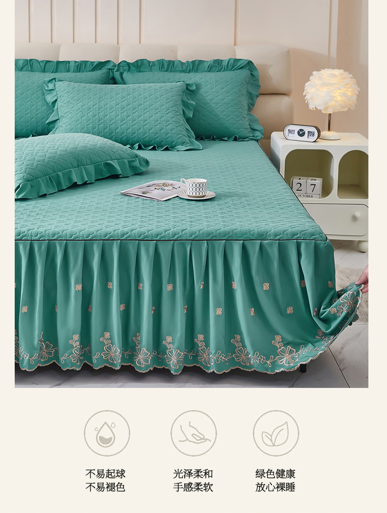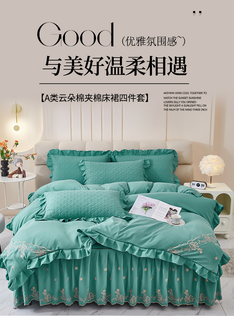 当前位置: 91家纺网 > 商品网购 > 床品套件 > 四件套 > 其它四件套 > 家之硕家纺 2025新款云朵棉刺绣床裙四件套 湖绿