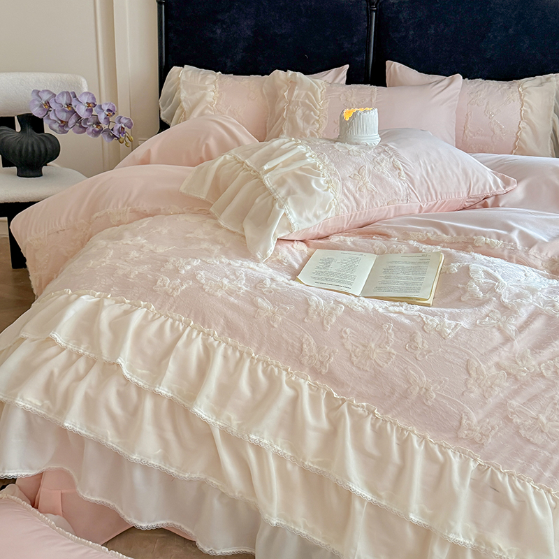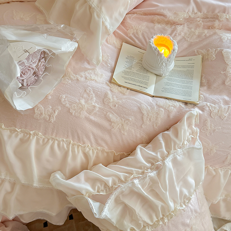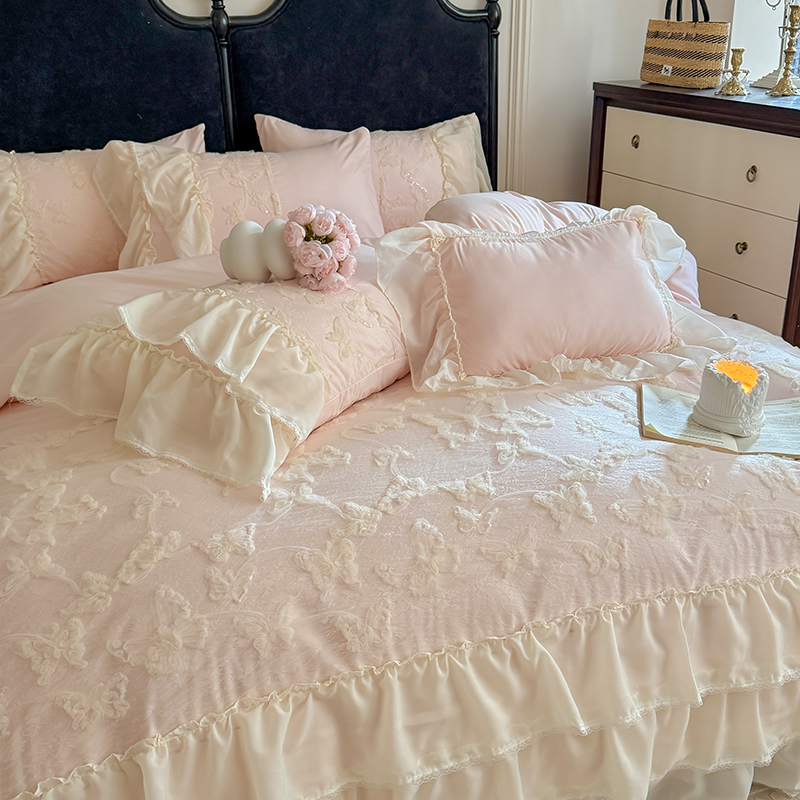 商品名称:吾欢心 2025新款糯小棉立体绣花雪纺花边四件套-蝴蝶梦 蝴蝶梦-粉