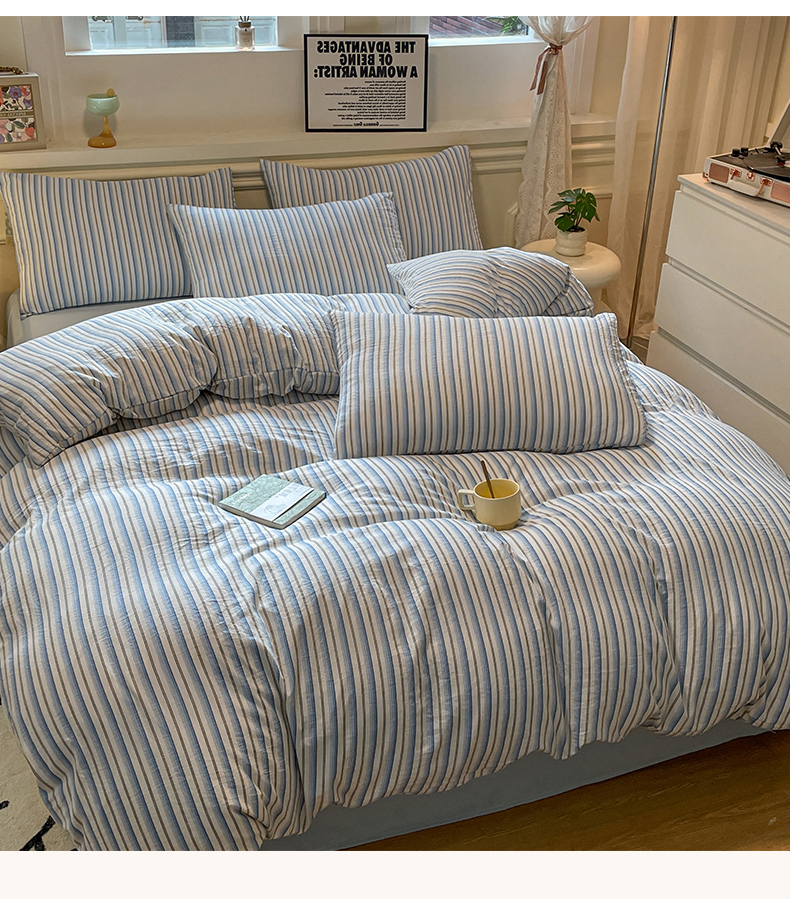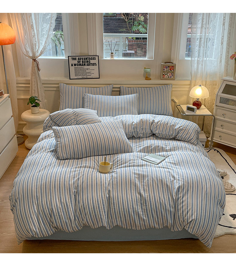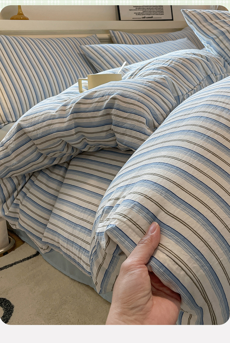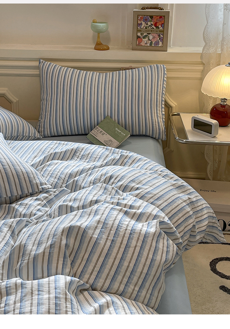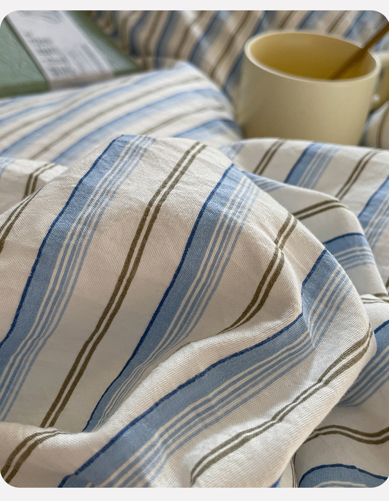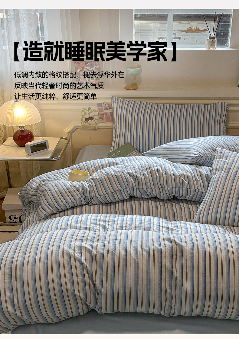 当前位置: 91家纺网 > 商品网购 > 床品套件 > 四件套 > 水洗棉四件套 > 盛秋家纺 2025新款水洗棉格子系列四件套蓝苏条+天空蓝