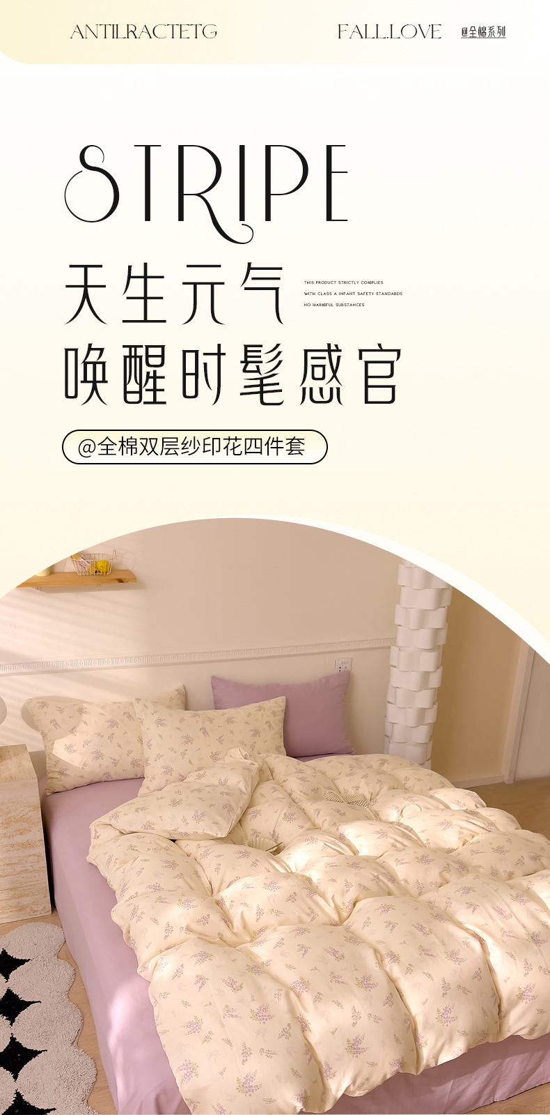 当前位置: 91家纺网 > 商品网购 > 床品套件 > 四件套 > 全棉普通四件套 > DoDo 兜兜 2025新款全棉双层纱印花四件套(可定做尺寸) 紫风铃