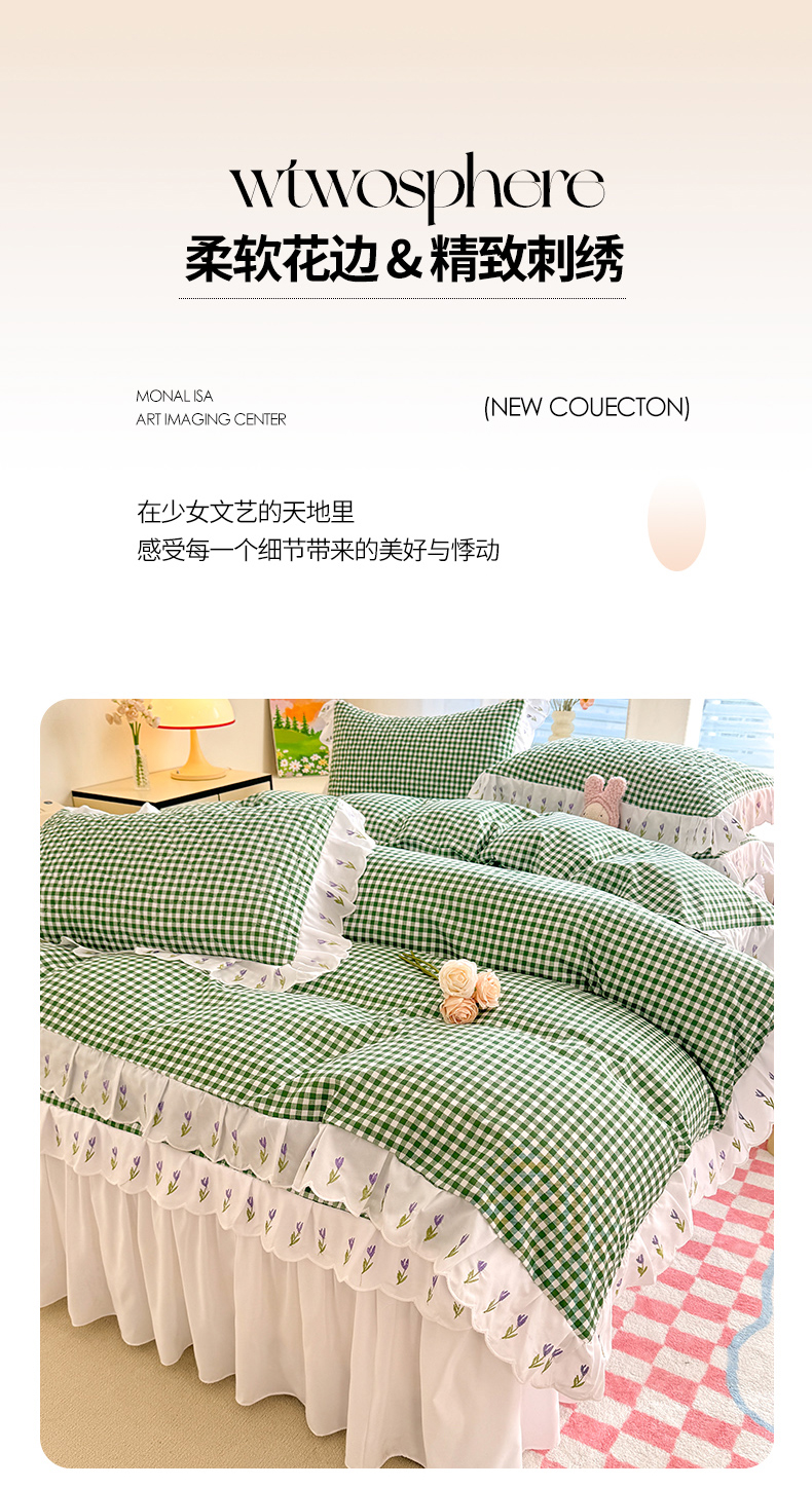 • 91家纺网 家纺一手货源 找家纺 金盛皇朝家纺 2025新款格子空间水洗棉床裙 格子空间-牛油果绿