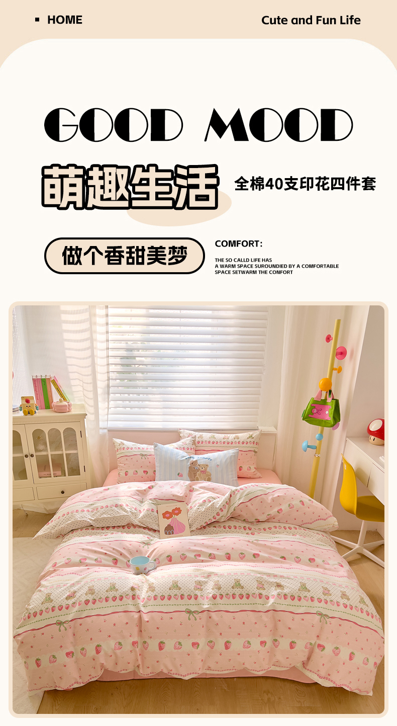 当前位置: 91家纺网 > 商品网购 > 床品套件 > 四件套 > 全棉普通四件套 > DoDo兜兜2025新款40支13372全棉印花四件套 粉粉草莓