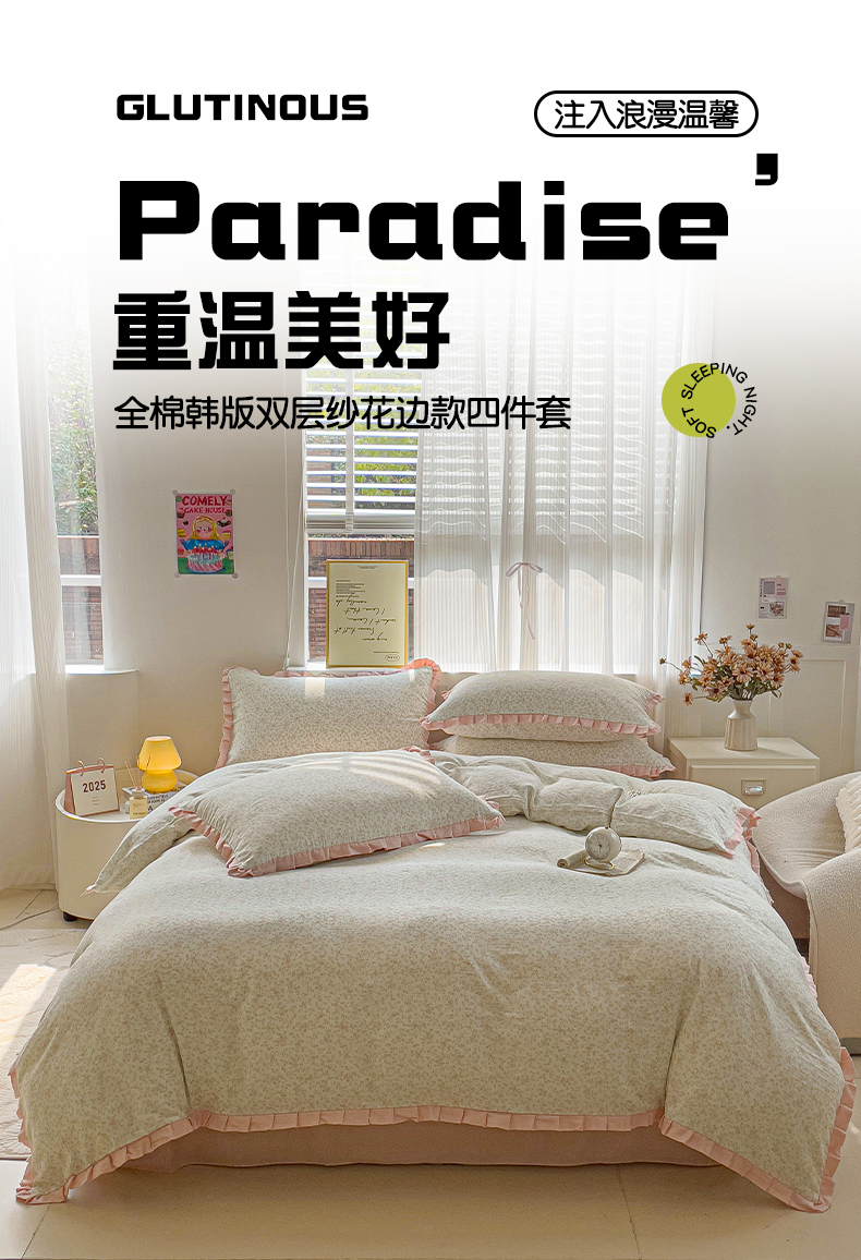 忆生活家纺 2025新款全棉韩版双层纱花边款四件套 伊洛娜