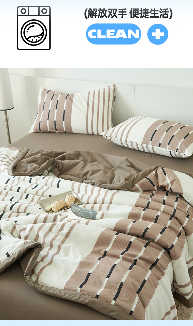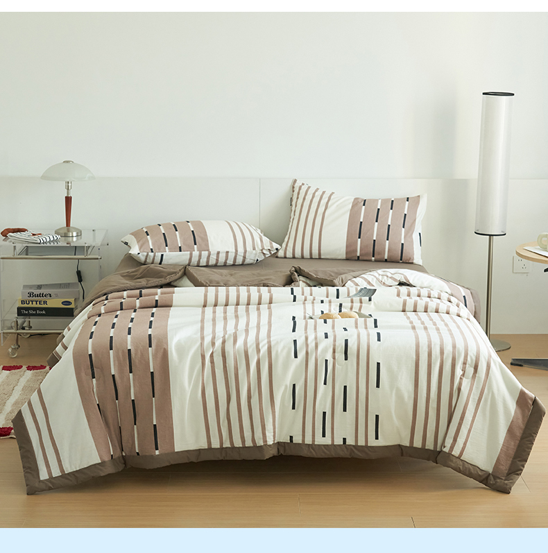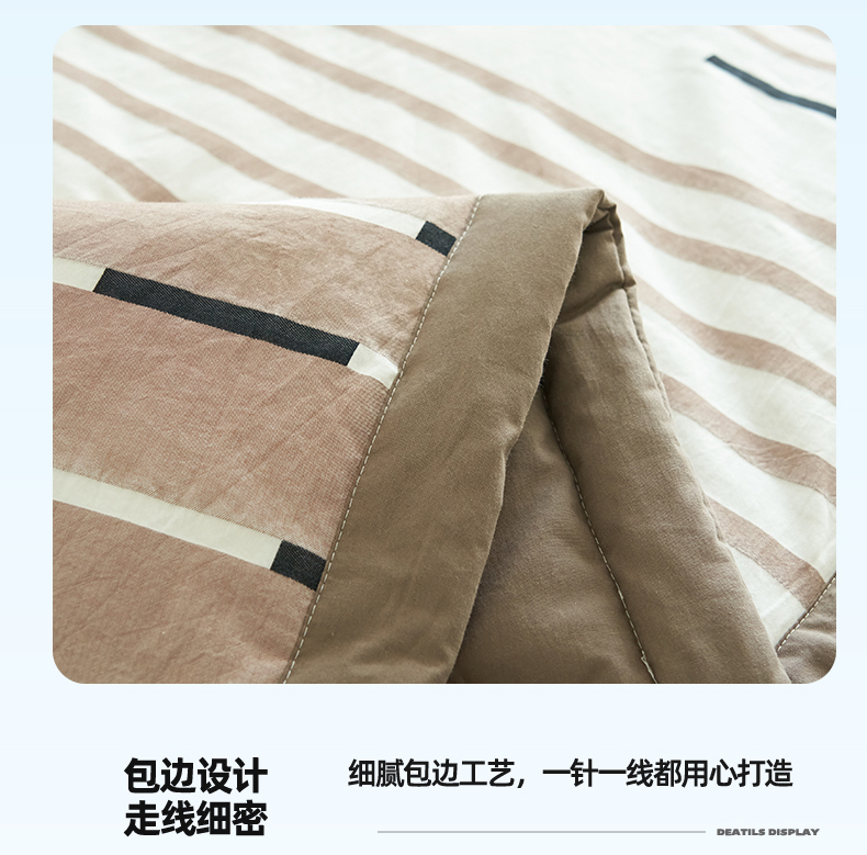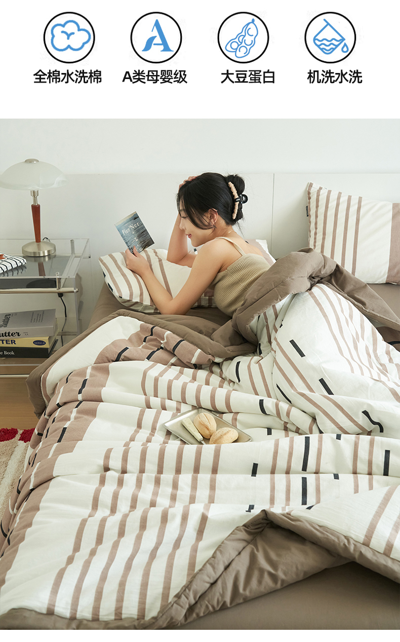 当前位置: 91家纺网 > 商品网购 > 床品套件 > 四件套 > 夏被四件套 > 金鹰 2025新款A类纯棉水洗棉三层条纹提花大豆夏被四件套 条纹-浅驼