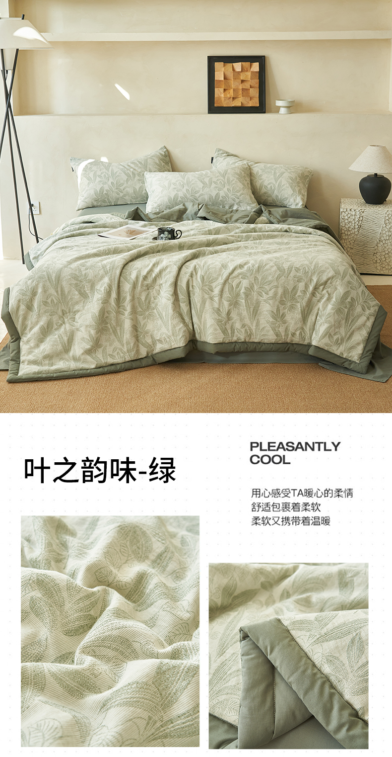 当前位置: 91家纺网 > 商品网购 > 床品套件 > 四件套 > 夏被四件套 > 金鹰 2025新款A类纯棉水洗棉提花三层纱叶之韵味空调被夏凉被大豆夏被四件套 叶之韵味-绿