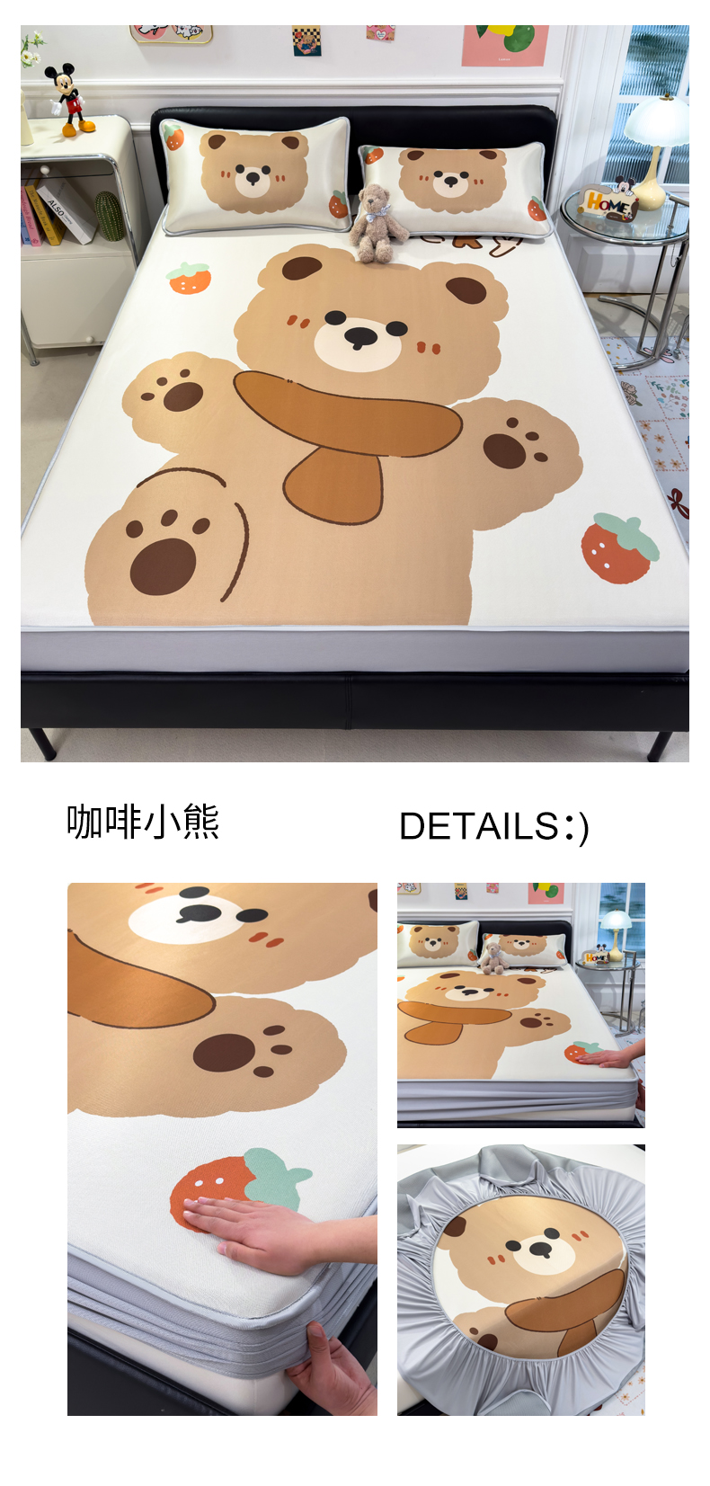 商品名称:丝羽坊 2025新款大版印花冰丝凉席冰丝席碳光冰丝凉席-床笠款 咖啡小熊